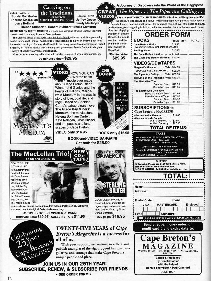 Carrying on the Traditions A Journey of Discovery into the World of the Bagpipes! SEE & HEAR ... Buddy MacMaster ''H''''''''H Jackie Dunn Theresa MacLellan '''ffl|''jTmnQ''Q Jeffrey Gosse Jerry Holland ''''''''''''' Sandy Maclntyre Brenda Stubbert • Robert Stubbert • Sheila Cameron CARRYING ON THE TRADITIONS is a good rich sampling of Cape Breton Fiddling to? day • to watch or simply listen to. Over and over. This video is aimed at the fiddler and the fiddle fanatic • if s the musicians performing seated in one spot • music, music, music. How each holds the violin and the bow, from the seated dancing of Rodney MacDonald, to the barely perceptible movements of Robert Stubbert, to Theresa MacLellan's authority and grace • and Brenda Stubbert's daughter Tracey's absolutely man/elous stepdancing. Video includes a very good booklet with articles, analysis of styles, biographies, etc. 90-minute video • $29.95 GREAT] The Pipes VIDEOS/ The Pipes are Calling. '. • TORONTO STAR' traditions of Eastem Canada, the historic warpipes, and the community dance piper tradition of Cape Breton. 90-min. video $29.95 NOW YOU CAN OWN the finest movie ever made about Cape Breton Island. Winner of 6 Genies and the hearts of millions, Marga? ret's Museum is the classic story of love, coal life, and rage. Based on Sheldon Currie's extraordinary novel The Glace Bay Miners' Museum, the movie stars Helena Bonham Carter, Kate Nelligan, Clive Russel, and the people and land? scapes of Cape Breton. VIDEO only $14.95 BOOK only $12'95 BOOK-and-VIDEO BARGAIN! Get both for $25.00 IF YOU THINK YOU HATE BAGPIPES, this video will brighten your life! The sound, the landscape and colour • visits with people who play and make pipes in Canada, Ireland, Scotland and France • the combined music of over 400 pipers and hurdy gurdy players, plus staggering individual performances • then back to the New World to ex? plore the rich piping '---------------- • ----------- ORDER FORM BOOKS The MacLellan Trio!fSD?' on CD and CASSETTE TAPE > BEAUTIFUL, EX? CITING MUSIC from a family that has kept the clas? sic Cape Breton repertoire alive. Children of legen? dary fiddler Big Ronald MacLel? lan, The MacLel? lan Trio • Theresa and Donald, vio? lins; Marie playing piano • deliver superb dance music that makes great listening, mastered from the'original Celtic studio recordings. 65 TUNES • OVER 70 MINUTES OF MUSIC COMPACT DISC $19.95 • CASSETTE TAPE $11 '1' .95 qKIaI' • GOOD CLEAR PROSE, fo? cused subjects, and often out? rageous approaches • an inti? mate portrait of and by Silver Donald Cameron. 220 pages $16.95 TWENTY-FIVE YEARS of Cape Breton's Magazine is a success for all of us. With your support, we continue to collect and publish examples of the vigour, good humour, sin? gularity, and courage that make Cape Breton a unique people and place. JOIN US IN OUR 25TH YEAR! SUBSCRIBE, RENEW, & SUBSCRIBE FOR FRIENDS • SEE ORDER FORM • PRICE QTY. Cape Breton Works $19.95 (MORE STORIES FROM CAPE BRETON'S MAGAZINE) Sterling Silver $16.95 The Cape Breton Giant $ 6.95 The Glace Bay Miners' Museum.. $12.95 VIDEOS/CDs/TAPES Margaret's Museum Video $14.95 - SPECIAL: VIDEO & BOOK set $25.00 - The Pipes Are Calling Video $29.95 _ Carrying on the Traditions .Video $49.95 _ The MacLellan Trio Compact Disc... $19.95 _ Cassette Tape... $11.95 _ The Lighthouse Collection Book-&-Compact Disc... $27.95 _ Book-&-Cassette Tape. .. $27.95 _ Compact Disc.. . $19.95 _ Cassette Tape. ..$11.95_ SUBSCRIPTIONS to Cape Breton's MAGAZINE 4 issues inside Canada $19.00 _ 4 issues outside Canada U. S. Currency $24.00 _ or Can. Currency .. . $27.00 _ TOTAL OF ITEMS: lIlNC/ ??Ithen I'OUT! SHIPPING IN CANADA: Please add $4.50 for the first 2 Items, add $1.00 for each additional item. OUTSIDE CANADA: Add $4.00 for each item TOTAL: TOTAL visa OMASTERCARD Enclosed I TTTT Exp.; J Signature:_ H ??-''ll'lllH'l'|||ill''''??lj''liH''li''fAMW'''l3 Send cheque, money order, or credit card # and expiry date to: Cape Breton's MAGAZINE WRECK COVE ' NOVA SCOTIA Edited & Published by Ronald Caplan with the help of Bonnie Thompson • Paul Cranford JUNE 1997 34