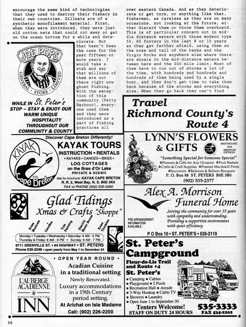 encourage the same kind of technologies that they used to destroy their fishery in their own countries. Gillnets are of a synthetic monofilament material. First, when they were introduced, they were just old cotton nets that could rot away or get on the ocean bottom for a while and dete- Iriorate. But that hasn't been the case for the past fifteen or more years. I would take a stab and say that millions of them are out there right now ghost fishing. With the excep? tion of this community (Petty Harbour), every? one used them and they were introduced as a part of fishing practices all WHILE IN St, Pete4'e STOP - STAY & ENJOY OUR WARIVl UNIQUE HOSPITALITY THROUGHOUT OUR COMMUNITY & COUNTY Discover Cape Breton Differently! KAYAK TOURS INSTRUCTION • RENTALS • KAYAKS • CANOES • BIKES • LOG COTTAGES on the Bras d'Or Lake PRIVATE & SCENIC Ask for brochure: KAYAK CAPE BRETON R. R. 2, West Bay, N. 8. BOE 3K0 FAX or PHONE (902) 535-3060 Q[acC'cCin??s Xmas & Crafts "Sfioppe' / f Monday • Tuesday • Wednesday • Saturday: 9 AM - 5 PM ' (' Thursday & Friday: 9 AM - 9 PM ?? Sunday: 9 AM - 7 PM J 9711 GRENVILLE ST. • #4 HIGHWAY • ST. PETERS Phone 535-2248 • open yearly from May 1 to December 24 L'AUBERGE ACADIENNE TKMXIIONAI. WlhCIATI KV(;A1)IS INN OPEN YEAR ROUND • Acadian Cuisine in a traditional setting Newly Renovated. Luxury accommodations in a 19th Century period setting. At Arichat on Isle Madame Call: (902) 226-2200 over eastern Canada. And as they deterio? rate or get torn, or anything like that, fishermen, as careless as they are on many occasions, not looking at the future, ei? ther discard them or throw them overboard. This is of particular concern out in mid? dle distance waters with those modern type 50, 60 footers in the last 8 or 10 years as they get farther afield, using them on the nose and tail of the banks and the Virgin Rocks and anywhere else where there are shoals in the mid-distance waters be? tween here and the 200 mile limit. Most of them have to run out of storms a lot of the time, with hundreds and hundreds and hundreds of them being used by a single boat, and they don't get time to take them back because of the storms and everything else. When they go back they can't find Travel Richmond County *s Route 4 LYNN'S FLOWERS & GIFTS m MASTERCARD VISA AMERICAN EXPRESS ''Something Special for Someone Special" Flowers & Gifts for Any Occasion Fruit Baskets |!!'% Crafts & Craft Supplies Framed MacAskill Prints ' '' Souvenirs Balloons & Balloon Bouquets P.O. Box 88 ST. PETERS BOE 3B0 (902) 535-2377 Me?c'. Morrison JumratHomt PRE-ARRANGEMENT INFORMATION AVAILABLE Stvoing the community for over 3S years tuitd sympathy and understanding. Poinding a supportive environment luith quiet efficiency. P 0 Box 10 • ST. PETER'S • 535-2119 St. Peter's Campground Fleur-de-Lis Trail and Route #4 St. Peter's • Camping • Cabins • Playground • 2 Pools • Recreation Hall • Arcade • 3-Way Hookup • Cable TV • Showers • Laundry • Open June 1 to September 30 Tenters Welcome! STAFF ON DUTY 24 HOURS 535-3333 FAX 53S-X202