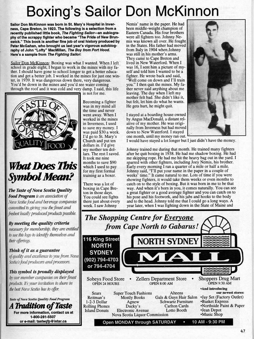 Boxing's Sailor Don McKinnon Sailor Don McKinnon was born in St. Mary's Hospital in Inver? ness, Cape Breton, in 1923. The foilowing is a selection from a recently published little book. The Fighting Sailor • an aubiogra- phy of the scrappy fighter who became "The Pride of New Brun? swick." This book is another fine job of oral history produced by Peter McGahan, who brought us last year's vigorous autobiog? raphy of John "Lofty" MacMillan, The Boy from Port Hood. Here's a sample from The Fighting Sailor. Sailor Don McKinnon: Boxing was what I wanted. When I left school in grade eight, I began to work in the mines with my fa? ther. I should have gone to school longer to get a better educa? tion and get a better job. I worked in the mines for just one win? ter, in 1939. It was dangerous down there, very dangerous. You'd be down in the mines and you'd see water coming through the roof and it was cold and very damp. I said, this life is not for me. What Does This Symbol JMlean? The Taste of Nova Scotia Quality Food Program is an assocMo?2 of iVora Scotia food and beiwage companies committed to giving ] 'ou t/je finest and fresljest lomll) • pivdiicedproducts possible. By meeting the quality criteria necessary for membership, the}' are e?2titled to use this logo to identify themselves and their offeiings. Think of it as a guarantee of quality and excellence to you from Nova Scotia's food producers and processors This symbol is proudly displayed by our member companies on their finest products It's your hivitation to share in the best Noi n Scotia Lias to offer Taste of Nora Scotia Quality Food Program ATraditton of Taste For more information, contact us at 1-800-281-5507 or e-mail: tasteqfp@lstar.ca Becoming a fighter was in my mind all the time and never went away. When I worked in the mines in Inverness, I used to save my money. I was paid $30 a week. I'd go to St. Mary's Church and put ten dollars in. I'd give my mother ten dol? lars. The rest I saved. It took me nine months to save $90 which I used to pay for my first formal training as a boxer. There was a lot of boxing in Cape Bre? ton in those days. You could see fights there just about every week. I saw Johnny Nemis' name in the paper. He had been middle-weight champion of Eastern Canada. His four brothers were all fighters too. Johnny Ne? mis was known all over. He fought in the States. His father had moved from Italy in 1904 when Johnny was still in his mother's arms. They came to Cape Breton and Hved in New Waterford. When I was 16,1 sent him a picture of my? self and told him I wanted to be a fighter. He wrote back and said, "Well come on down and I'll train you." I then quit the mines. My fa? ther never said anything about me leaving. The day when I left my mother felt bad. She didn't like it, but felt, let him do what he wants. He gets hurt, he might quit. I stayed at a boarding house owned by Angus MacDonald, a distant rel? ative of my mother. He was origi? nally from Inverness but had moved down to New Waterford. I stayed one month, until my money ran out. I would have stayed a lot longer but I just didn't have the money. Johnny trained me during that month. He trained many fighters after he quit boxing in 1938. He had me shadow boxing. He had me skipping rope. He had me hit the heavy bag out in the yard. I sparred with odier fighters, including Joey Nemis, his brother. Early every morning I ran a quarter of a mile or half a mile. Johnny said, "I'll put your name in the paper in a couple of weeks' time." It came natural to me. Lots of time if you were showing fighters, it would take them weeks or even months to catch on to the style of boxing. But it was bom in me to be that way. And when it's bom in you, it comes naturally. You can see a great fighter or a good average fighter and you can catch on to his pose and his footwork, and his jabs and hooks to the body and to the head. Johnny told me that I could go a long ways. A year later, when I was fighting down in the State of Maine and The Shopping Centre for Everyone from Cape North to Gabarus! 116 King street NORTH SYDNEY (902) 794-4703 I or 794-4704 Sobeys Food Store OPEN 24 HOURS I NORTH SYDNEY Zellers Department Store OPEN 8:00 AM Sears Reitman's 1-2-3 Dollar Rolling Phones Island Donuts Super Touch Fashions Mostly Books Agnew Ducky's Electronic Avenue Alteens Gals & Guys Hair Salon Schwartz Furniture Carlton Cards Lotto Booth Nova Scotia Liquor Commission Open MONDAY through SATURDAY Shoppers Drug Mart OPEN 9:30 AM • And introducing our newest stores: • Jay Set (Factory Outlet) • Basket Express • Northside Paint & Paper • Jean Depot • Music Shop 10 AM-9:30 PM 47