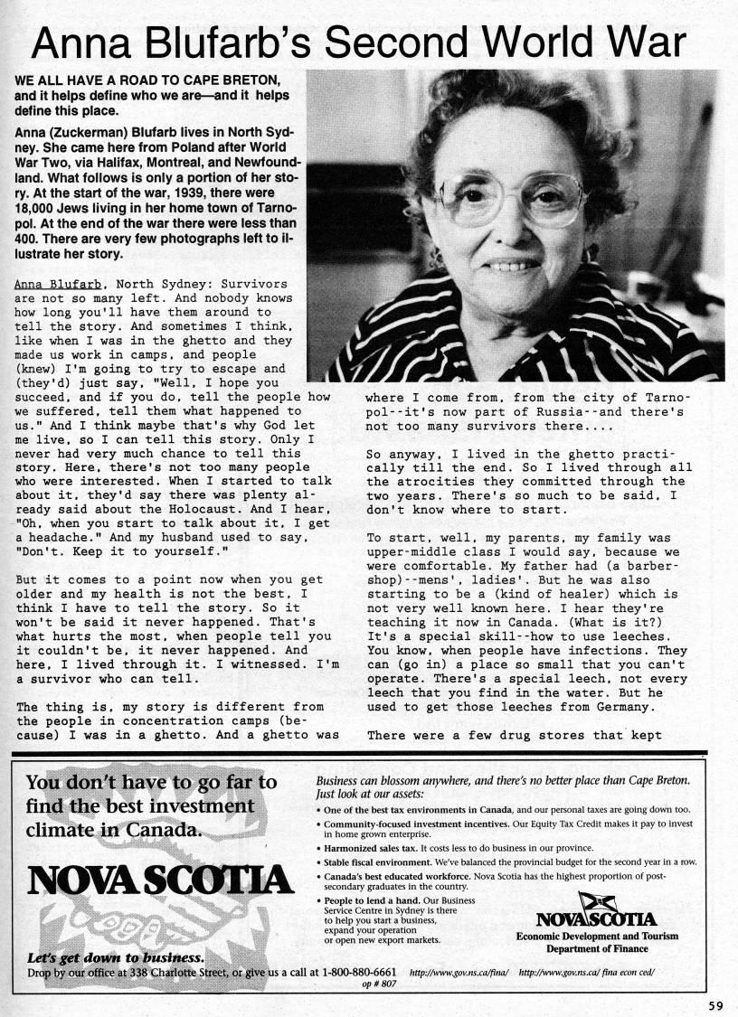 Anna Blufarb's Second World War WE ALL HAVE A ROAD TO CAPE BRETON, and it helps define who we are • 'and it helps define this place. Anna (Zuckerman) Biufarb lives in North Syd? ney. She came here from Poland after World War Two, via Halifax, Montreal, and Newfound? land. What follows is only a portion of her sto? ry. At the Start of the war, 1939, there were 18,000 Jews living in her home town of Tarno- pol. At the end of the war there were less than 400. There are very few photographs left to il? lustrate her Story. Anna Blufarb. North Sydney: Survivors are not so many left. And nobody knows how long you'll have them around to tell the story. And sometimes I think, like when I was in the ghetto and they made us work in camps, and people (knew) I'm going to try to escape and (they'd) just say, "Well, I hope you succeed, and if you do, tell the people how we suffered, tell them what happened to us." And I think maybe that's why God let me live, so I can tell this story. Only I never had very much chance to tell this story. Here, there's not too many people who were interested. When I started to talk about it, they'd say there was plenty al? ready said about the Holocaust. And I hear, "Oh, when you start to talk about it, I get a headache." And my husband used to say, "Don't. Keep it to yourself." But it comes to a point now when you get older and my health is not the best, I think I have to tell the story. So it won't be said it never happened. That's what hurts the most, when people tell you it couldn't be, it never happened. And here. I lived through it. I witnessed. I'm a survivor who can tell. The thing is, my story is different from the people in concentration camps (be? cause) I was in a ghetto. And a ghetto was where I come from, from the city of Tarno- pol--it's now part of Russia--and there's not too many survivors there.... So anyway, I lived in the ghetto practi? cally till the end. So I lived through all the atrocities they committed through the two years. There's so much to be said, I don't know where to start. To start, well, my parents, my family was upper-middle class I would say, because we were comfortable. My father had (a barber? shop) - -mens ' , ladies'. But he was also starting to be a (kind of healer) which is not very well known here. I hear they're teaching it now in Canada. (What is it?) It's a special skill--how to use leeches. You know, when people have infections. They can (go in) a place so small that you can't operate. There's a special leech, not every leech that you find in the water. But he used to get those leeches from Germany. There were a few drug stores that kept You don't have to go far to find the best investment climate in Canada. INOl'SCOTIA. Lets get dawn to business. Drop by our office at 338 Charlotte Street, or 've us a call Business can blossom anywhere, and there's no better place than Cape Breton, fust look at our assets: • One of the best tax environments in Canada, and our personal taxes are going down too. • Community-focused investment incentives. Our Equity Tax Credit makes it pay to invest in home grown enterprise. • Harmonized sales tax. It costs less to do business in our province. • Stable fiscal environment. We've balanced the provincial budget for the second year in a row. • Canada's best educated workforce. Nova Scotia has the highest proportion of post- secondary graduates in the country. • People to lend a hand. Our Business Service Centre in Sydney is there to help you start a business, expand your operation or open new export markets. Economic Development and Tourism Department of Finance at 1-800-880-6661 http://www.gov.ns.ca/fina/ http://vnvw.gov.n. op #807 ca/ fina econ ced/ 59
