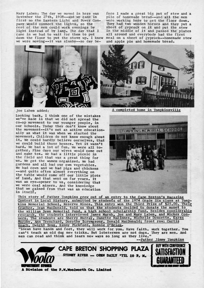 Published by Ronald Caplan on 1977/6/1 (620 reads)Mary Laben: The day we moved in here was November the 27th,'1938 • and we came in first so the Eastern Light and Power Com? pany would connect the lights, so the rest of the men could work evenings by light instead of by lamp. The day that I came in we had to wait for them to put down the floor to put the stove up. I knew we were moving • it was slushy • so day be? fore I made a great big pot of stew and a pile of homemade bread • and all the men were working here to get the floor down. They had two wooden horses and they put a sheet of gyprock on it and put the stew in the middle of it and passed the plates all around and everybody had the first meal on a sheet of gyprock • homemade stew and apple pie and homemade bread. Joe Laben added: A completed home in Tompkinsville Looking back, I think one of the mistakes we've made is that we did not spread the co-op movement to our younger people, in our schools. Today they don't know about the movement • it's not as active education? ally as what it was when we started the movement. Children do not know enough about it. We could hardly believe ourselves, that we could build those houses. Yet it wasn't hard. We had a lot of fun. We were all to? gether. Fine days our wives would come out and make tea. We had a little picnic in the field and that was a great thing for us. We got the women organized. We had gardens and all had our own vegetables. We had cows and we had pigs and chickens • and quite often almost everything on the table would come off our little plots of land. And that went on for years. It was an eye-opener to us, considering that we were coal miners. And the knov;ledge that we gained from that was an education in itself. ?? This story of Father Tompkins grew out of an entry to the Cape Breton's Magazine Contest in Local History, submitted by students of the 1974 Grade Six class at Tomp? kins Memorial School, Reserve Mines. This entry won the Third Prize of $25.00. Their Jean MacDonald, told us that the students decided to donate the monet to teacher, the William Syms Memorial Fund, a high school scholarship fund. Besides considerable research, the students interviewed James Marsh, Joe and Mary Laben, and Mickey Con- ners. The students are Sherry Murray, Danette Maclnnes, Micnelle Doucette, Karen Murphy. Ann Trenchard, Dorothy Scrymgeour, Donald MacDonald; front row: Curtii Roach. Dwight Syms. Kenny Pickford. Ronnie O'Brien. • Ideas have hands and feet, they will work for you. Have faith. Wbrk together. You can't teach an old dog new tricks. But lobstermen are not dogs. They are men. And men can read and think and learn new ways so long as they live." • Father Jimmy Tompkins CAPE BRETON SHOPPING PLAZA f SnjmAu 1 SYDNBT RIVBR • OBBN DAILY 'TIL 10 F. M. 1 WflllOnlUllUll I GIUmUIIEBI I A IMLirision of the F.ir?lfooteostli Co* Liaited