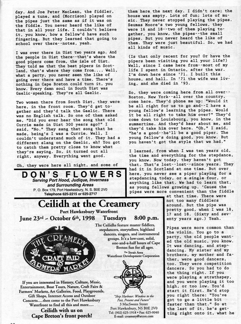 Published by Ronald Caplan on 1998/6/1 (434 reads)day. And Joe Peter MacLean, the fiddler, played a tune, and (Morrison) played on the pipes just the same as if it was on the fiddle. You never heard the like of that in all your life. I couldn't believe it, you know, how a fellow'd have such fingering. But they learned that going to school over there--notes, yeah. I was over there in Uist two years ago. And the people in Uist there--that's where the good pipers come from, the isle of Uist. They told me that the best pipers in Scot? land, that's where they come from.... Well, what a party, you never seen the like of going over there and have a time. There's nothing in Cape Breton could turn it, you know. Every damn soul in South Uist was Gaelic-speaking. They're all Gaelic. Two women there from South Uist, they were here, in the front room. They'd get to? gether and they'd talk the Gaelic. There was no English talk. So one of them asked me, "Did you ever hear the song that old Currie made in Uist 300 years ago?" I said, "No." They sang that song that he made, being's I was a Currie. Well, I couldn't understand much of it. They had a different slang on the Gaelic, eh? You got to catch them pretty close to know what they're saying. So, it turned out all right, anyway. Everything went good. Oh, they were here all night, and some of DON'S FLOWERS Serving Port Hood, Judique, Inverness and Surrounding Areas p. O. Box 179, Port Hawkesbury, N. S. BOE 2V0 Telephone 625-2215 or 625-2717 Ceilidh at the Creameiy Port Hawkesbury Waterfront June 23''' ' October 6'', 1993 Tuesdays 8:00 p.m. them here the next day. I didn't care; the house was empty. Lots of fun; lots of mu? sic. They never stopped playing the pipes. Seumas Moore's two young fellows, they were 16 and 18--two of them playing to? gether, you know, the pipes--the small pipes. But you never heard the like of them. They were just beautiful. So, we had all kinds of music. (Is that only recent for you? Or have the pipers been visiting you all your life?) Well, since I came here from--most of my life I spent in Ontario, after the war. I'm down here since '71. I built this house, and hall. In '71 the wife was liv? ing, and she died in '93. So, they were coming here from all over-- Boston, New York--all over the country, come here. They'd phone me up: "Would it be all right for us to go and--I have a young fellow's learning the pipes. Would it be all right to take him over?" They'd come down to Louisbourg, you know, in the summertime. And they'd hear about me, and they'd take him over here. "Oh," I said, "he's a good--he'11 be a good piper. The young fellow's doing good, you know. But you haven't got the style that we had." I learned, from when I was ten years old, the time and everything for the stepdance, you know. Now today, they haven't got that. That's lost--lost--since years. They had it in Scotland at one time. But over here, you never see a piper playing for a stepdancing today, or a single four, or anything like that. We had to learn that, as young fellows growing up. 'Cause the pipes were more convenient than the fiddle at that time. There were not too many fiddlers around. But the pipe was pretty good, when I was 18, 17 and 18. (Sixty and sev? enty years ago.) Yeah. The Ceilidhs feature master fiddlers, stepdancers, storytellers, highland dancers, singers, and instrumental groups. It's a low-cost, solid, one-and-a-half hours of Cape Breton fun for all ages. The Strait Area Waterfront Development Corporation If you are interested in History, Culture, Music, Entertainment, Boat Tours, Nature, Craft Fairs & Farmers' Markets, Art Galleries, Food, Playgrounds, Gift Shops, Internet Access and Outdoor Concerts.....then come to the Port Hawkesbury Waterfront to find all this and more Ceilidh with us on Cape Breton's front porch! "Ship Harbour: Window to the Past, Present and Future " 3 MacSween Street Port Hawkesbury, NS BOE 2V0 Tel: (902) 625-1918 • Fax: 625-0040 E-mail: creamery@atcon.com Pipes were more common than the violin. You go to a party, the old people want? ed the old music, you know. It was dancing, and step'- dancing. My sister and my brothers, my mother and fa? ther, were good dancers, too. They were competition dancers. So you had to do the thing right. If you were playing a strathspey, and you were playing it too high, or too low. You'd start it first. He'd stop you right there: "You've got to go a little bit faster than that." So at the last of it, he's get? ting right onto it, what he