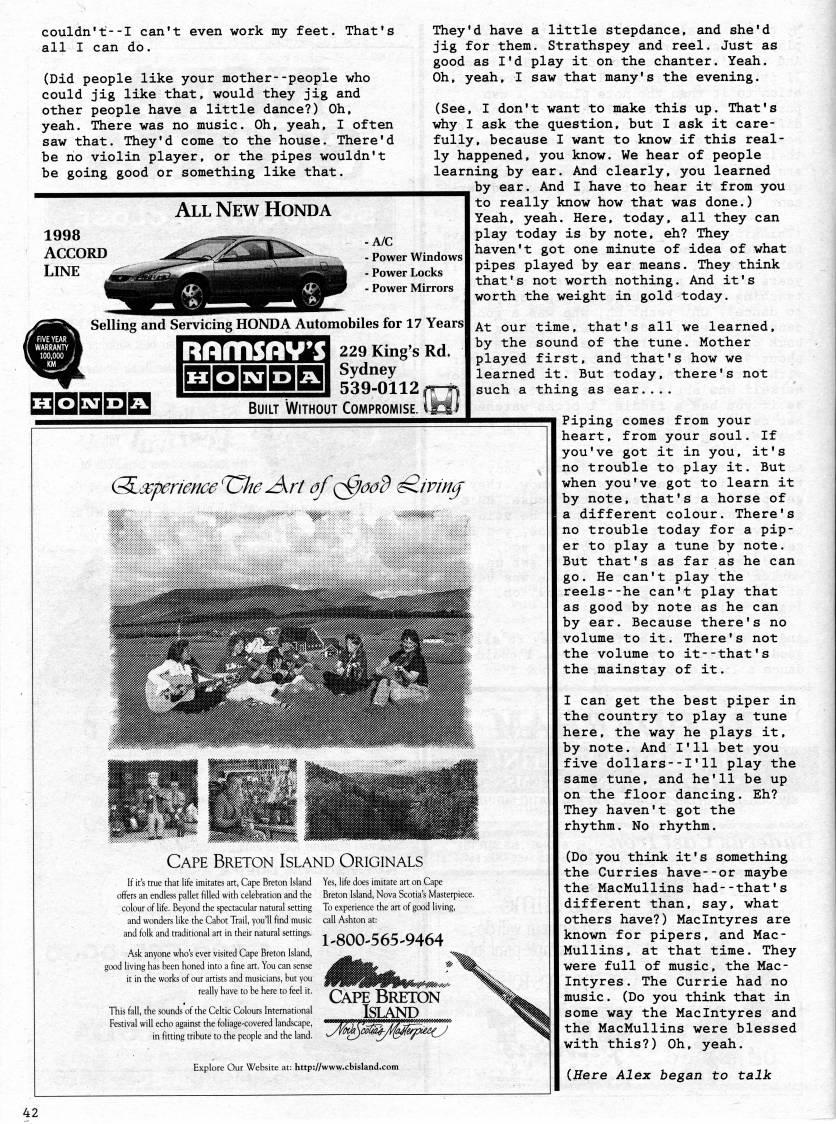 Published by Ronald Caplan on 1998/6/1 (407 reads)couldn't--I can't even work my feet. That's all I can do. (Did people like your mother--people who could jig like that, would they jig and other people have a little dance?) Oh, yeah. There was no music. Oh, yeah, I often saw that. They'd come to the house. There'd be no violin player, or the pipes wouldn't be going good or something like that. All New Honda They'd have a little stepdance, and she'd jig for them. Strathspey and reel. Just as good as I'd play it on the chanter. Yeah. Oh, yeah, I saw that many's the evening. (See, I don't want to make this up. That's why I ask the question, but I ask it care? fully, because I want to know if this real? ly happened, you know. We hear of people learning by ear. And clearly, you learned by ear. And I have to hear it from you to really know how that was done.) Yeah, yeah. Here, today, all they can play today is by note, eh? They haven't got one minute of idea of what pipes played by ear means. They think that's not worth nothing. And it's worth the weight in gold today. Selling and Servicing HONDA Automobiles for 17 Years CTcTHl'feV' 229 King's Rd. Sydney 539-0112 pr-yi Built Without Comproiviise. iMi HOKTID A HOnXD A. At our time, that's all we learned, by the sound of the tune. Mother played first, and that's how we learned it. But today, there's not such a thing as ear.... ('X'penence'he A'rt afi'ood 'mnff Cape Breton Island Originals If it's true that life imitates art, Cape Breton Island offers an endless pallet filled with celebration and the colour of life. Beyond the spectacular natural setting and wonders like the Cabot Trail, you'll find music and folk and traditional art in their natural settings. Ask anyone who's ever visited Cape Breton Island, good living has been honed into a fine art. You can sense it in the works of our artists and musicians, but you really have to be here to feel it. This fall, the sounds of the Celtic Colours International Festival will echo against the foliage-covered landscape, in fitting tribute to the people and the land. Yes, life does imitate art on Cape Breton Island, Nova Scotia's Masterpiece. To experience the art of good living, call Ashton at: 1'800-565'9464 Explore Our Websit, :: http://w- Piping comes from your heart, from your soul. If you've got it in you, it's no trouble to play it. But when you've got to learn it by note, that's a horse of a different colour. There's no trouble today for a pip? er to play a tune by note. But that's as far as he can go. He can't play the reels--he can't play that as good by note as he can by ear. Because there's no volume to it. There's not the volume to it--that's the mainstay of it. I can get the best piper in the country to play a tune here, the way he plays it, by note. And I'll bet you five dollars--I'11 play the same tune, and he'll be up on the floor dancing. Eh? They haven't got the rhythm. No rhythm. (Do you think it's something the Curries have--or maybe the MacMullins had--that's different than, say, what others have?) Maclntyres are known for pipers, and Mac? Mullins, at that time. They were full of music, the Mac? lntyres . The Currie had no music. (Do you think that in some way the Maclntyres and the MacMullins were blessed with this?) Oh, yeah. (Here Alex began to talk