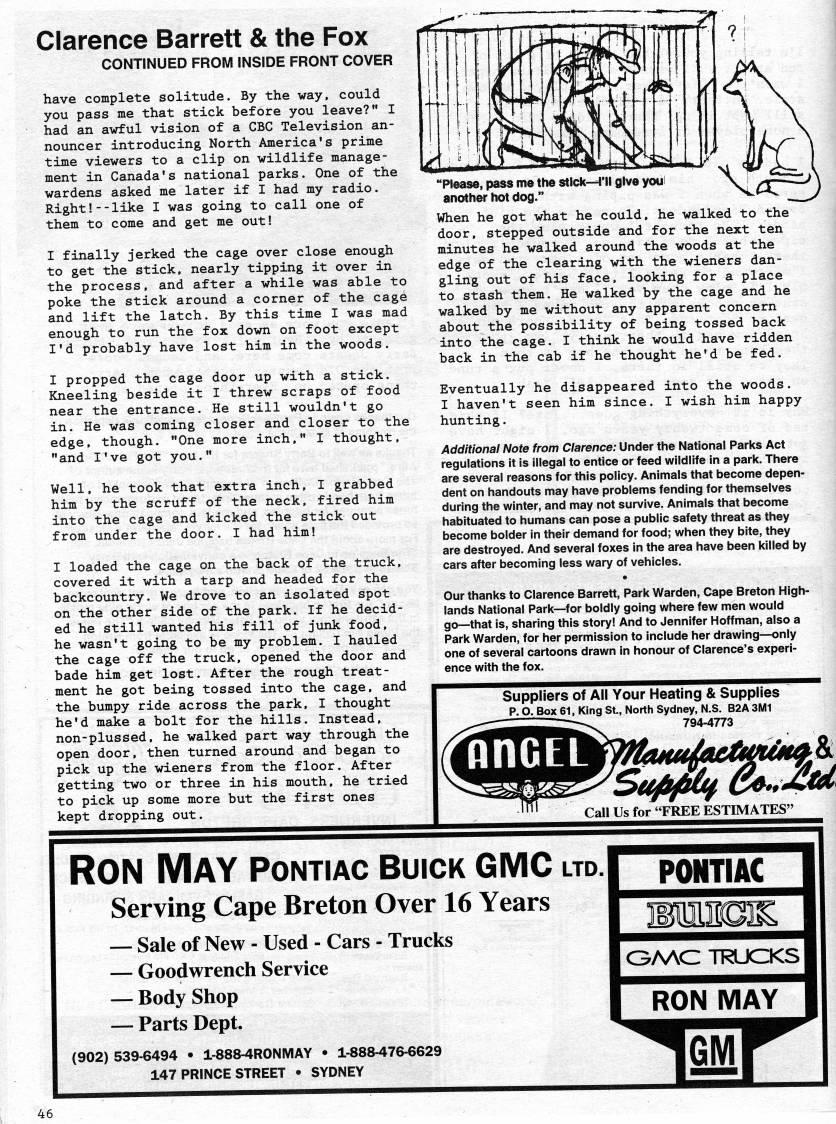 Published by Ronald Caplan on 1998/6/1 (309 reads)Clarence Barrett & the Fox continued from inside front cover have complete solitude. By the way, could you pass me that stick before you leave?" I had an awful vision of a CBC Television an? nouncer introducing North America's prime time viewers to a clip on wildlife manage? ment in Canada's national parks. One of the wardens asked me later if I had my radio. Right!--like I was going to call one of them to come and get me out! I finally jerked the cage over close enough to get the stick, nearly tipping it over in the process, and after a while was able to poke the stick around a corner of the cage and lift the latch. By this time I was mad enough to run the fox down on foot except I'd probably have lost him in the woods. I propped the cage door up with a stick. Kneeling beside it I threw scraps of food near the entrance. He still wouldn't go in. He was coming closer and closer to the edge, though. "One more inch," I thought, "and I've got you." Well, he took that extra inch, I grabbed him by the scruff of the neck, fired him into the cage and kicked the stick out from under the door. I had him! I loaded the cage on the back of the truck, covered it with a tarp and headed for the backcountry. We drove to an isolated spot on the other side of the park. If he decid? ed he still wanted his fill of junk food, he wasn't going to be my problem. I hauled the cage off the truck, opened the door and bade him get lost. After the rough treat? ment he got being tossed into the cage, and the bumpy ride across the park, I thought he'd make a bolt for the hills. Instead, non-plussed, he walked part way through the open door, then turned around and began to pick up the wieners from the floor. After getting two or three in his mouth, he tried to pick up some more but the first ones kept dropping out. "Please, pass me the stick • I'll give youi another hot dog." When he got what he could, he walked to the door, stepped outside and for the next ten minutes he walked around the woods at the edge of the clearing with the wieners dan? gling out of his face, looking for a place to stash them. He walked by the cage and he walked by me without any apparent concern about the possibility of being tossed back into the cage. I think he would have ridden back in the cab if he thought he'd be fed. Eventually he disappeared into the woods. I haven't seen him since. I wish him happy hunting. Additional Note from Clarence: Under the National Parks Act regulations it is illegal to entice or feed wildlife in a park. There are several reasons for this policy. Animals that become depen? dent on handouts may have problems fending for themselves during the winter, and may not survive. Animals that become habituated to humans can pose a public safety threat as they become bolder in their demand for food; when they bite, they are destroyed. And several foxes in the area have been killed by cars after becoming less wary of vehicles. Our thanks to Clarence Barrett, Park Warden, Cape Breton High? lands National Park • for boldly going where few men would go • that is, sharing this story! And to Jennifer Hoffman, also a Park Warden, for her permission to include her drawing • only one of several cartoons drawn in honour of Clarence's experi? ence with the fox. Suppliers of All Your Heating & Supplies P.O. Box61, King St., North Sydney, N.S. B2A3M1 794-4773 Call Us for "FREE ESTIMATES" Ron May pontiac buick gmc ltd. Serving Cape Breton Over 16 Years • Sale of New - Used - Cars - Trucks • Goodwrench Service • Body Shop • Parts Dept. (902)539-6494 • 1-888-4R0NIVIAY • 1-888-476-6629 147 PRINCE STREET • SYDNEY PONTIAC MIKIE GAAC TRUCKS RON MAY m