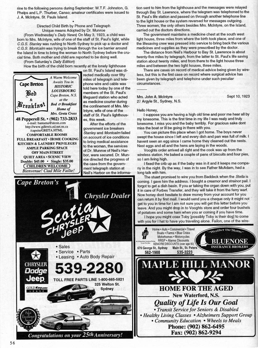 Published by Ronald Caplan on 1998/6/1 (187 reads)rine to the following persons during September: W.T.F. Johnston, G. Phelps and L.P. Thurber, Canso; amateur certificates were issued to J. A. Mclntyre, St. Pauls Island. Directed Child Birth by Phone and Telegraph Unique means Adopted by Dr. Munroe (From Wednesday's Daily News) On May 3, 1923, a child was born to Mrs. Mclntyre, wife of one of the staff of St. Paul's light, while C.G.S. Stanley vjas rushing to North Sydney to pick up a doctor and C.G.S. Montcalm was trying to break through the ice barrier around the Island in time to bring the woman to North Sydney before the cru? cial time. Both mother and child are reported to be doing well. (From Saturday's Daily Edition) How the birth of the child born recently at the lonely lighthouse . on St. Paul's Island was di? rected medically over fifty Cape Breton A Warm Welcome Awaits You in HISTORIC LOUISBOURG Cape Breton, N.S. at the Bed &Breakfast; Home of Mrs. Greta Cross 48 Pepperell St. • (902) 733-2833 e-mail: bantania@atcon.com http://www.gdlewis.ed.net.ns.ca /capsite/GRETA.HTML COMFORTABLE ROOMS FULL BREAKFAST • HOME COOKING KITCHEN & LAUNDRY PRIVILEGES AMPLE PARKING SPACE OFF MAIN STREET QUIET AREA • SCENIC VIEW Double; $45.00 ? Single; $35.00 ( CHILDREN WELCOME ) Bienvenue! Ciad Mile Failte! miles of telegraph and tele? phone wire and cable was told here today by one of the members of the St. Paul's lifeguard station who acted as medicine courier during the confinement of Mrs. Mc? lntyre, wife of one of the staff of St. Paul's lighthous? es, this week. After the efforts of the government ice breakers Stanley and Montcalm failed on account of ice conditions to bring medical assistance to the woman, the services of Dr. Munroe of Neil's Har? bor, were secured. Dr. Mun? roe directed the progress of the case from the govern? ment telegraph station at Neil's Harbor on the informa- CHRYSLER I Oodge Jeep • Sales • Service • Parts • Leasing • Auto Body Repair 539-2280 TOLL FREE PARTS LINE 1-800-665-5821 325 Welton St. Sydney tion sent to him from the lighthouse and the messages were relayed through Bay St. Lawrence, where the telegram was telephoned to the St. Paul's life station and passed on through another telephone line to the light house or the system reversed for messages outgoing. Three women, the only others besides Mrs. Mclntyre, on the Island, carried out the doctors directions. The government maintains a medicine chest at the south west light house, three miles from where the birth took place, and one of the lifesaving crew was pressed into service to bring back the various medicines and supplies as they were prescribed by the doctor. The distance from Neil's Harbour to Bay St. Lawrence is about twenty-five miles by telegraph, from the latter to St. Paul's life saving station about twenty miles, and from there to the light house three miles and between the two light houses, three miles. There are cases on record of medical advice being given by wire? less, but this is the first case on record where surgical advice has been given by telegraph and telephone under such peculiar circumstances. Mrs. John A. Mclntyre 27 Argyle St., Sydney, N.S. Sept 10, 1923 Hello Honey, I suppose you are having a high old time and poor me hear all by my lonesome. This is the first time in my life I was realy and truly lonesome. I miss you and the baby terribly. For gracious sake dont miss the boat or III be going in there with you. You can picture this place when I got home. The boys never swept the house since I left and every dish and pan was full of milk. I havent seen an egg since I came home they cleaned out the nests. Nest eggs and all and the hens are laying in the woods. Vooghts order arrived all right and the cook was up from the wireless station. He baked a couple of pans of biscuits and four pies, so I am living high. I fixed the crib up as if the baby was in it and it keeps me compa? ny in the night. By the way, I was in to see Father McAdam, had a long talk with him. The Stuart promised to wire you from Baddeck when the Stella is coming. I gave him the address. I bought a creamer and strainer pail. I forgot to get a dish basin. If you ar taking the organ down with you, put it in care of Forbes Transfer, and they will take it from the ferry warf. Now honey dont hesitate to draw money from your account for you can return it by first mail. I would send you a cheque only it might not get to you in time for I am not sure you will get this letter before you leave. And you might drop in to Vooghts store and order four bushels of potatoes and some ham when you ar coming if you have time. I hope you might coax Toby [possibly Toby is their dog] to come with you for I hat to have you traveling alone. Fallon, one of the wire- Home ??Auto • Commercial • Travel Boats • Farms • Blue Cross Motorhomes • Motorcycles ??i • i., • d?d...??..B..k?? RRSP • Alarms Discounts o.,.v • B=. SENIORS DISCOUNTS (over age 50) 676 George St., Sydney Main St., St. Peters' 562-1988 535-3223 Comratulations on your 25th Anniversary! MAPLE HILL MANOR HOME FOR THE AGED New Waterford, N.S. Quality of Life Is Our Goal • Transit Service for Seniors & Disabled ??Healthy Living Classes • Alzheimers Support Group • Community Education • Wheels to Meals Phone: (902) 862-6495 Fax: (902) 862-9294 56