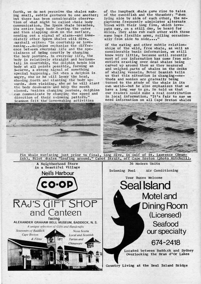 Published by Ronald Caplan on 1977/6/1 (271 reads)forth, we do not perceive the whales mak? ing small, subtle gestures to one another; but there has been considerable observa? tion of what might be called whole body communication. The Sperm Whale breaches, its entire huge body leaving the water and then slapping down on the surface, sending out a signal of alarm • and imme? diately other Sperm Whales will dive. ./Varshall writes: "In courtship or love- making... dolphins emphasize the differ? ence between everyday life and the spe- cialness of being courtly by changing the body posture. In everyday life, the body is relatively straight and horizon? tal; in courtship, the dolphin bends his body at all points possible, forming an S-curve, a strong signal of something special happening. But vihen a dolphin is angry, she or he will lower the head, showing teeth and slanting the body up? wards, 'vhen yielding, she or he will slant the body dovmwards and keep the mouth closed. Besides changing posture, dolphins can communicate by changing the speed and direction of their swimming pattern." Scaimmon felt the love-making activities of the Humpback i/vhale gave rise to tales of the swordfish and the thrasher: "t'ien lying side by side of each other, the me- gapteras frequently administer alternate blows with their long fins, which love- pats may, on a still day, be heard for miles. They also rub each other with these same huge flexible arms, rolling occasion? ally from side to side...." Of the mating and other subtle relation? ships of the wild, free whale, as well as considerable basic information, we still know very little, because until recently most of our information has come from sci? entists crawling over dead whales being carved up around them as they measured and weighed parts of whales on the decks of whaling vessels. Peter Beamish tells us that this situation is changing--me? thods and monies are gradually being turned to the study of the whale in its own world • but he also emphasizes that we have a long way to go. He told us that our readers could make a real contribution in local information. "It?s fair to say we need information on all Cape Breton whales Fin Whale surfacing just prior to final, long dive, in Gulf of St. Lawrence (Beam? ish). Pilot vhales "loafing around." Cabot Strait, off Cape Breton (photo Mitchell)' A Neighborhood Store in a Beautiful Village Neil's Harbour CO-OP RAcJ'S GIFT SHOr and Canteen facing ALEXANDER GRAHAM BELL MUSEUM, BADDECK, N. S. A unique selection of Gifts and Handcrafts Souvenirs of Baddeck '#W Nova Scotia Cape Breton 'fflMS' ''ocal and Scottish & Films t2*1 i'J Tartan and 36 Modern Units Swimming Pool Air Conditioning Tour Buses Welcome Seal Island Motel and Dining Room (Licensed) Seafood our specialty 674-2418 Located between Baddeck and Sydney Overlooking the Bras d'Or Lakes Country Living at the Seal Island Bridge