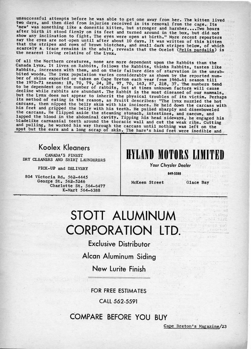 Published by Ronald Caplan on 1973/1/1 (628 reads)unsuccessful attempts before he was able to get one away from her. The kitten lived two days, and then died from injuries received in its removal from the cage.' Its 'mew' was something like a domestic kitten, but stronger and harsher....Two hours after birth it stood firmly on its feet and turned around in the box, but did not show any inclination to fight. The eyes were open at birth." More recent reporters say the eyes are not open until after about 10 days. It was written of this kitten that the stripes and rows of brown blotches, and small dark stripes below, of which scarcely a, trace remains in the adult, reveals that the Ocelot (Pelis pardalis) is the nearest living relative of the Lynx. Of all the Northern creatures, none are more dependent upon the Rabbits than the Canada Lynx. It lives on Rabbits, follows the Rabbits, thinks Rabbits, tastes like Rabbits, increases with them, and on their failure dies of starvation in the unrab- bited woods. The lynx population varies considerably as shown by the reported num? ber of skins exported or taken on Cape Breton each vear from 1960-61 season till the 1970-71 season: 18, 70, 79, 24, 28, 97, 70, 163, 87, 218, 37. The numbers tend to be dependent on the number of rabbits, but at times unknown factors will cause decline while rabbits are abundant. The Rabbit is the most diseased of our mammals, but the Lynx does not appear to inherit the physical troubles of its victim. Perhaps its method of eating is the reason, as Pruitt describes: "The lynx nuzzled the hot carcass, then nipped the belly skin with his incisors. He held down the carcass with his feet and gripped the belly with his teeth. He pulled sharply and disemboweled the carcass. He flipped aside the steaming stomach, intestines, and caecum, and lapped the blood in the abdominal cavity. Tipping his head sideways, he engaged his ??bladelike carnassial teeth around the thoracic wall and cut the weak ribs. Cutting and pulling, he worked his way through the carcass until nothing was left on the spot but the ears and a long scrap of skin. The hare's hind feet were inedible and Koolex Kleaners CANADA'S FINEST DRY CLEANERS AND SHIRT LAUNDERERS PICK-UP and DELIVERY 804 Victoria Rd. 562-4445 George St. 562-5246 Charlotte St. 564-6477 K-Mart 564-6388 mun mim limited Your Chrysler Dealer 849-5588 McKeen Street Glace Bay STOTT ALUMINUM CORPORATION LTD. Exclusive Distributor Alcan Aluminum Siding New Lurite Finish FOR FREE ESTIMATES CALL 562-5591 COMPARE BEFORE YOU BUY Cape Breton's Magazine/23