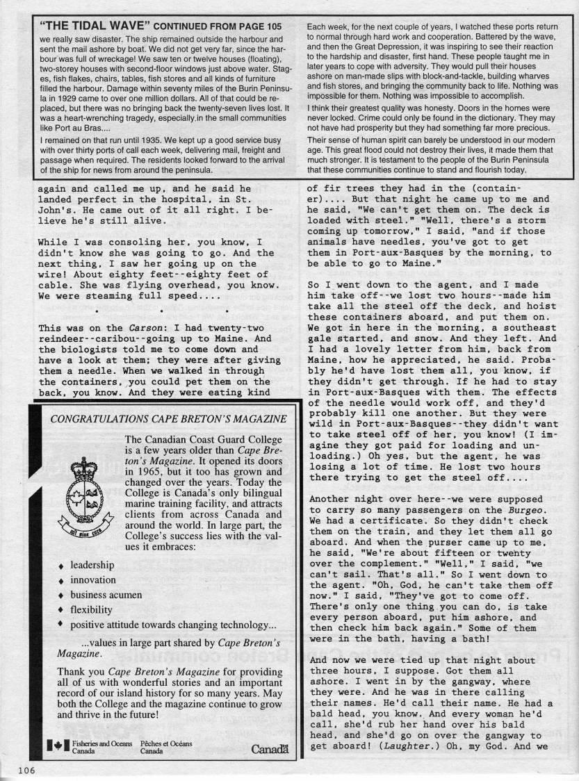 THE TIDAL WAVE continued from page io5 we really saw disaster. The ship remained outside the harbour and sent the mail ashore by boat. We did not get very far, since the har? bour was full of wreckage! We saw ten or twelve houses (floating), two-storey houses with second-floor windows just above water. Stag? es, fish flakes, chairs, tables, fish stores and all kinds of furniture filled the harbour. Damage within seventy miles of the Burin Peninsu? la in 1929 came to over one million dollars. All of that could be re? placed, but there was no bringing back the twenty-seven lives lost. It was a heart-wrenching tragedy, especially.in the small communities like Port au Bras.... I remained on that run until 1935. We kept up a good service busy with over thirty ports of call each week, delivering mail, freight and passage when required. The residents looked fonward to the arrival of the ship for news from around the peninsula. Each week, for the next couple of years, I watched these ports return to normal through hard work and cooperation. Battered by the wave, and then the Great Depression, it was inspiring to see their reaction to the hardship and disaster, first hand. These people taught me in later years to cope with adversity. They would pull their houses ashore on man-made slips with block-and-tackle, building wharves and fish stores, and bringing the community back to life. Nothing was impossible for them. Nothing was impossible to accomplish. I think their greatest quality was honesty. Doors in the homes were never locked. Crime could only be found in the dictionary. They may not have had prosperity but they had something far more precious. Their sense of human spirit can barely be understood in our modern age. This great flood could not destroy their lives, it made them that much stronger. It is testament to the people of the Burin Peninsula that these communities continue to stand and flourish today. again and called me up, and he said he landed perfect in the hospital, in St. John's. He came out of it all right. I be? lieve he's still alive. While I was consoling her, you know, I didn't know she was going to go. And the next thing, I saw her going up on the wire! About eighty feet--eighty feet of cable. She was flying overhead, you know. We were steaming full speed.... This was on the Carson: I had twenty-two reindeer--caribou--going up to Maine. And the biologists told me to come down and have a look at them; they were after giving them a needle. When we walked in through the containers, you could pet them on the back, you know. And they were eating kind I CONGRATULATIONS CAPE BRETON'S MAGAZINE The Canadian Coast Guard College is a few years older than Cape Bre? ton's Magazine. It opened its doors in 1965, but it too has grown and changed over the years. Today the College is Canada's only bilingual marine training facility, and attracts clients from across Canada and around the world. In large part, the College's success lies with the val? ues it embraces: 4 leadership innovation business acumen flexibility positive attitude towards changing technology... ...values in large part shared by Cape Breton's Magazine. Thank you Cape Breton's Magazine for providing all of us with wonderful stories and an important record of our island history for so many years. May both the College and the magazine continue to grow and thrive in the future! l'l Fisheries and Oceans Peches et Oceans Canada Canada Canadll of fir trees they had in the (contain? er) .... But that night he came up to me and he said, "We can't get them on. The deck is loaded with steel." "Well, there's a storm coming up tomorrow," I said, "and if those animals have needles, you've got to get them in Port-aux-Basques by the morning, to be able to go to Maine." So I went down to the agent, and I made him take off--we lost two hours--made him take all the steel off the deck, and hoist these containers aboard, and put them on. We got in here in the morning, a southeast gale started, and snow. And they left. And I had a lovely letter from him, back from Maine, how he appreciated, he said. Proba? bly he'd have lost them all, you know, if they didn't get through. If he had to stay in Port-aux-Basques with them. The effects of the needle would work off, and they'd probably kill one another. But they were wild in Port-aux-Basques--they didn't want to take steel off of her, you know! (I im? agine they got paid for loading and un? loading.) Oh yes, but the agent, he was losing a lot of time. He lost two hours there trying to get the steel off.... Another night over here--we were supposed to carry so many passengers on the Burgeo. We had a certificate. So they didn't check them on the train, and they let them all go aboard. And when the purser came up to me, he said, "We're about fifteen or twenty over the complement." "Well," I said, "we can't sail. That's all." So I went down to the agent. "Oh, God, he can't take them off now." I said, "They've got to come off. There's only one thing you can do, is take every person aboard, put him ashore, and then check him back again." Some of them were in the bath, having a bath! And now we were tied up that night about three hours, I suppose. Got them all ashore. I went in by the gangway, where they were. And he was in there calling their names. He'd call their name. He had a bald head, you know. And every woman he'd call, she'd rub her hand over his bald head, and she'd go on over the gangway to get aboard! (Laughter.) Oh, my God. And we