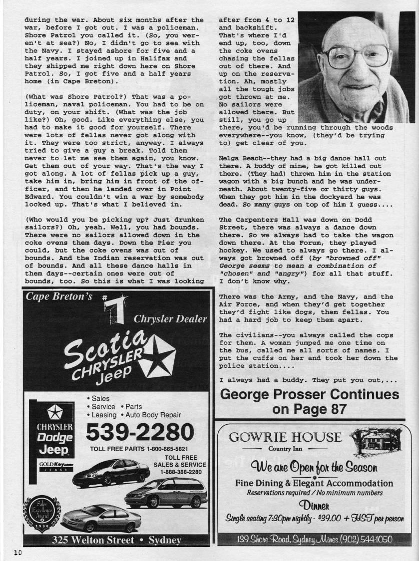 Published by Ronald Caplan on 1999/6/1 (585 reads)during the war. About six months after the war, before I got out. I was a policeman. Shore Patrol you called it. (So, you wer? en't at sea?) No, I didn't go to sea with the Navy. I stayed ashore for five and a half years. I joined up in Halifax and they shipped me right down here on Shore Patrol. So, I got five and a half years home (in Cape Breton). (What was Shore Patrol?) That was a po? liceman, naval policeman. You had to be on duty, on your shift. (What was the job like?) Oh, good. Like everything else, you had to make it good for yourself. There were lots of fellas never got along with it. They were too strict, anyway. I always tried to give a cruy a break. Told them never to let me see them again, you know. Get them out of your way. That's the way I got along. A lot of fellas pick up a guy, take him in, bring him in front of the of? ficer, and then he landed over in Point Edward. You couldn't win a war by somebody locked up. That's what I believed in. after from 4 to 12 and backshift. That's where I'd end up, too, down the coke ovens chasing the fellas out of there. And up on the reserva? tion. Ah, mostly all the tough jobs got thrown at me. No sailors were allowed there. But still, you go up there, you'd be running everywhere'-you know, ( to) get clear of you. through the woods they'd be trying Nelga Beach • they had a big dance hall out there. A buddy of mine, he got killed out there. (They had) thrown him in the station wagon with a big bunch and he was under? neath. About twenty-five or thirty guys. When they got him in the dockyard he was dead. So many guys on top of him I guess.... (Who would you be picking up? Just drunken sailors?) Oh, yeah. Well, you had bounds. There were no sailors allowed down in the coke ovens them days. Down the Pier you could, but the coke ovens was out of bounds. And the Indian reservation was out of bounds. And all these dance halls in them days--certain ones were out of bounds, too. So this is what I was looking CHRYSLER Dodge vieep • Sales • Service • Parts • Leasing • Auto Body Repair 539-2280 TOLL FREE PARTS 1-800-665-5821 TOLL FREE SALES & SERVICE 1-888-388-2280 325 Welton Street • Sydney The Carpenters Hall was down on Dodd Street, there was always a dance down there. So we always had to take the wagon down there. At the Forum, they played hockey. We used to always go there. I al? ways got browned off {by "browned off" George seems to mean a combination of "chosen" and "angry") for all that stuff. I don't know why. There was the Army, and the Navy, and the Air Force, and when they'd get together they'd fight like dogs, them fellas. You had a hard job to keep them apart. The civilians--you always called the cops for them. A woman jumped me one time on the bus, called me all sorts of names. I put the cuffs on her and took her down the police station.... I always had a buddy. They put you out,... George Prosser Continues on Page 87 GOWRIE HOUSE • Country Inn QA'e a/te ??pen Jo/t tfce Season Fine Dining & Elegant Accommodation Reservations required/No minimum numbers 'inne/i Singk seating 7:30pm nig'i'y- '39.00 +Sfff3fp&tf;)moti 129 Sbite 92oaA fiudmu JAte (902) 544-1050 10