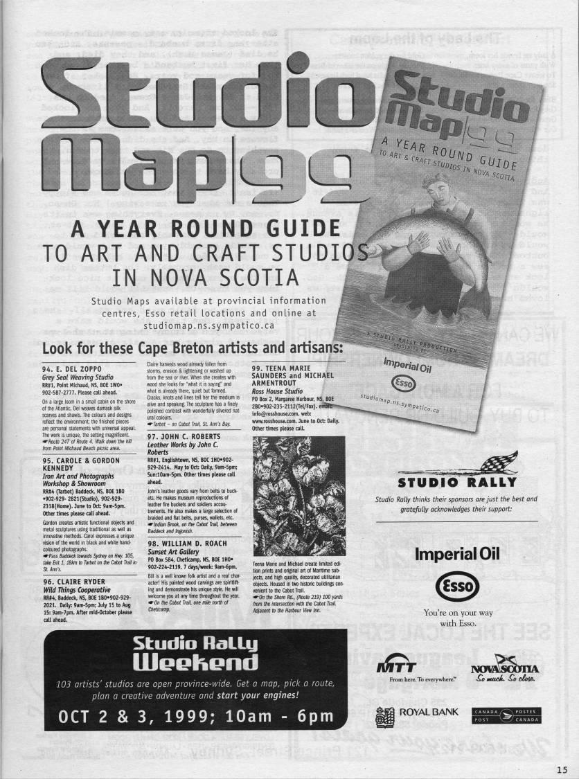 Published by Ronald Caplan on 1999/6/1 (784 reads)V U U ' ''?uf,f,''Of.'? A YEAR ROUND GUIDE TO ART AND CRAFT STUDIC IN NOVA SCOTIA Studio Maps available at provincial information centres, Esso retail locations and online at ,' studiomap.ns.sympatico.ca / Look for these Cape Breton artists and artisansf 94. E. DEL ZOPPO Grey Seal Weaving Studio RR#1, Point Michaud, NS, BOE 1W0?? 902-587-2777. Please call ahead. On a large loom in a small cabin on the shore of the Atlantic, Del weaves damask silk scarves and shawls. The colours and designs reflect the environment; the finished pieces are personal statements with universal appeal. The work is unique, the setting magnificent, • -ffoute 247 of Route 4. Walk down the hill from Point Michaud Beach picnic area. 95. CAROLE & GORDON KENNEDY Iron Art and Photographs Workshop & Showroom RR#4 (Tarbot) Baddeck, NS, BOE IBO • 902-929- 2821 (Studio), 902-929- 2318(Home). June to Oct: 9ani-5pm. Other times please call ahead. Gordon creates artistic functional objects and metal sculptures using traditional as well as innovative methods. Carol expresses a unique vision of the world in black and white hand- coloured photographs. • ??Pass Baddeck towards Sydney on Hwy. 105, take Exit 1,18km to larM on the Cabot Trail in St. Ann's. 96. CLAIRE RYDER Wild Things Cooperative RR#4, Baddeck, NS, BOE 180*902-929- 2021. Daily: 9am-5pm; July 15 to Aug 15:9am-7pm. After mid-October please call ahead. Claire han/ests wood already fallen from storms, erosion & lightening or washed up from the sea or river. When she creates with wood she looks for "what it is saying" and what is already there, quiet but formed. Cracks, knots and lines tell her the medium is alive and speaking. The sculpture has a finely polished contrast with wonderfully silvered nat? ural colours. ??-Tarbot - on Cabot Trail, St. Ann's Bay. 97. JOHN C. ROBERTS Leather Works by John C. Roberts RR#1, Englishtown, NS, BOC 1H0*902- 929-2414. May to Oct: Daily, 9am-5pm; Sun:10am-5pm. Other times please call ahead. John's leather goods vary from belts to buck? ets. He makes museum reproductions of leather fire buckets and soldiers accou? trements. He also makes a large selection of braided and flat belts, purses, wallets, etc. " • ??/ncf/an Brook, on the Cabot Trail, between Baddeck and Ingonish. 98. WILLIAM D. ROACH Sunset Art Gallery PO Box 584, Cheticamp, NS, BOE IHO* 902-224-2119. 7 days/week: 9am-6pm. Bill is a well known folk artist and a real char? acter! His painted wood carvings are spiritlift- ing and demonstrate his unique style. He will welcome you at any time throughout the year. ''??On the Cabot Trail, one mile north of 99. TEENA MARIE SAUNDERS and MICHAEL ARMENTROUT Ross House Studio PO Box 2, Margaree Harbour, NS, BOE 2B0*902-235-2112(Tel/Fax). "' info@rosshouse.com. web: www.rosshouse.com. June to Oct: Daily. Other times please call. • ?''f'&mioji; Teena Marie and Michael create limited edi? tion prints and original art of Maritime sub? jects, and high quality, decorated utilitarian objects. Housed in two historic buildings corv venient to the Cabot Trail. ?-0/) the Shore Rd., (Route 219) 100 yards from the intersection with the Cabot Trail. Adjacent to the Harbour View Inn. STUDIO RALLY studio Rally thinks their sponsors are just the best and gratefully acknowledges their support: Imperial Oil You're on your way with Esso. Sfcudio RaLLy UJeelienfJ From here. To everywhere • Sio IMuU. So CMiS/. i Start your engines! OCT 2 & 3, 1999; 10am - 6pm ROYAL BANK 15