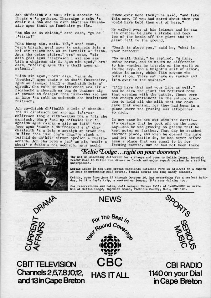 Ach dh'fhalbh e a null air a shocair 's fhuair e 'n cothram. Tharraing e srac 's chuir e a dha dhe na cinn bharr an fhuamh? aire agus thuit am fuamhaire gu lar. "Am bas OS do chionn," ors' esan, "gu de t'eirig?" "Cha bheag sin, mata. Tha," ors' esan, "each briagh, geal agus is coingeis leis a bhi air talamh neo as an iarmailt a' falbho Agus tha deise ridire," ors' esan, "air dath geal agus freagraidh i air aon sam bith a chuireas air io Agus sin agad," ors' esan, "m'eirig agus tha e thall anns an stabullo" "Bidh sin agam," ors' esan, "agus do bheatha." Agus chuir e as dha'n fhuamhaire, agus am feasgar thill e dhachaidh leis a' cjirodh. Cha robh de shoithichean aca air a' rioghachd a chumadh na bha de bhainne aig a' chrodh am feasgar 'bha 'sin--bha iad ann an aite 'sa robh an criomadh cho beairteach buileach. Ach co-dhiubh dh'fhalbh e leis a' chrodh • tha mi cinnteach gur ann air la'r-na- mhaireach thog e rith' • agus bha e 'fas cho sanntach, bha e 'dol na b'fhaide air 'n aghaidh agus rainig e aite an lath' 'bha 'seo agus 'nuair a dh'fhosgail e a' cha? chaileith 's a leig e astaigh an crodh dha ?n aite 'bha 'sin cha'n fhac' e riamh a leithid de dh'aite airson spreidh a bheath- achadh. Ach cha robh e fad' an sin 'nuair a chual' e fuaim a bha neonach, agus nochd "Come over here then," he said, "and take this cowo If you had cared about them you would have kept them out of here." He walked over at his leisure and he saw his chance. He gave a stroke and took two of the heads off the giant and the giant fell to the ground. "Death is above you," said he, "what is your ransom?" "No small thing," he replied. "A fine, white horse, and it makes no difference to him whether he travels on the earth or in the sky. And a knight's suit of armor, white in color, which fits anyone who ' puts it ono There yoti have my ransom and it's, over in the stable." "I'll have that and your life as well." And he slew the giant and returned home that evening with the cattle. There were not enough containers in the entire king? dom to hold all the milk that the cows gave that evening, for they had been in a place v/here the grazing was altogether so rich. In any case he set out ivith the cattle • I'm certain that he took off on the next day • and he was growing so greedy that he kept going on farther. That day he reached another place, and when he opened the gate and let the cattle-in, he had never before seen a place that was equal to it for feeding cattle. But he had not been there Celtic 'odge... right on your doorstep! Why not do something different for a change and come to Keltic Lodge, Ingonish Beach? Come to Keltic for dinner or lunch and enjoy superb cuisine in a setting unsurpassed. Keltic Lodge in the Cape Breton Highlands National Park is adjacent to a superb 18 hole championship golf course, tennis courts and long sandy beaches. Keltic, open from June 12 through October 10, has everything for a perfect holi? day, be it a day's trip, a weekend or longer. It??s easy driving too. For reservations and rates, call manager Herman Falls at 1-285-2880 or write him at Keltic Lodg', Ingonish Beach, Victoria Coimty, N,S., HOC IMO. ''' .x'' A- is: CO NEWS ' the B't/' . OBIT TELEVISION C BO Channefe 2,5'73,10,12, HAS IT ALL and 13 in Cape Breton % CBIRADD 1140on your Dial in Cape Breton