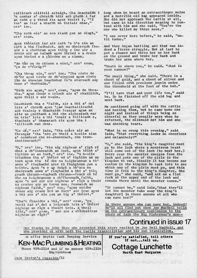 cailleach oillteil astaigh. Cha deachaidh i 'n comhar a' chruidh idir ach ghabh i far an robh e a throd ris agus thuirt i, "'S tus' am fear a mharbh mo thriuir mhac," ors' iseo "Cha robh mis' an seo riamh gus an diugh," ors' esan. Agus thoisich iad air cath 's b'e sin an cath a bha fiadhaich. Ach mu dheireadh fhu? air e a chothram agus thilg e ise air a druim air an talamh agus bhrisd e a druim agus bhrisd e a gairden os a cionuo ''Am bas os do chionn a nisd," ors' esan, "gu de t'eirig?" "Cha bheag sin," ors' ise. "Tha ciste de dh'or agus ciste de dh'airgiod agus ciste Ian de sheudan luachmhor fo'n starsach aig bonn a' bhothain." "Bidh sin agam," ors''esan, "agus do bhea? tha." Agus chuir e crioch air a' chaillich, agus thill e air n-ais. Co-dhiubh bha e 'falbh, air a bhi a' dol leis a' chrodh agus 'gam buachailleachd ach thainig e dhachaidh feasgar agus an aite an gnothach a bhi cho aighearach mar bu trie' leis a bhi 'nuair a thilleadh e, thachair a' bhanarach ris agus bha i 'silieadh nan deur. "Gu de," ors' Iain, "tha cearr air an fheasgar 'tha 'seo gu bheil a h-uile sian a' coimhead cho mi-shunndach, cho trom- inntinneach?" "0," ors' ise, "tha aig nighean a' righ ri dhol a dh'ionnsaidh an loch, agus beist a' tighinn as an loch," ors' ise. "A h-uile bliadhna tha a' bheist ud a' tighinn as an loch agus tha te dhe na h-igheannan a th' anns a' rioghachd aice ri fhaighinn gus a h-ithe. Agus 's e a' doigh a bh'aca mu dheireadh anns a' rioghachd a bhi a' til? geadh chrann • taghadh chrann • -feuch co te dhe na h-igheannan a dh'fheuraadh'falbh, agus 's ann air air nighean a' righ a thuit na cruinn air an turns seo? Feumaidh an nighean falbh," ors' ise, "agus suidhe shuas aig ceann ard an loch' air leac agus a bhi ann a' sin gus an tig a' bheisto" "Cha'n fhaoidte a bhi," ors' esan, "gu' bheil iad a''dol a leigeadh leis a' bheist nighean an righ a thoirt leis. A bheil idir," ors' esan, " aon ann a shabhaileas nighean an righ?" long when he heard an extraordinary noise and a horrible old hag appeared inside. She did not approach the cattle at all, but came in his direction meaning to con? tend with him and she said, *??You're the one who killed my thr'e sons." "I was never here before," he said, til today." 'un- And they began battling and that was in? deed a fierce struggle. But at last he got a chance and threw her on her back on the ground and broke her back and broke her arms above her. "Death is above you," he said. "VJhat is yovir ransom?" "No small thing," she said. "There is a chest of gold, and a chest of silver and one filled with precious jewels under the threshold at the foot of the hut." "I'll have that and your life too," said he. So he finished off the old hag and went back. He continued going off with the cattle and herding them, but he came home one night and instead of things being so cheerful as they usually were when he returned, the milkmaid met him and she was shedding tears. "What is so wrong this evening," said Iain, "that everything looks so cheerless and melancholy?" "0," she said, "the king's daughter must go to the loch where a monstrous beast will come out of the loch (to meet her.) Every year the monster emerges from the loch and gets one of the girls in the kingdom to eat. Finally it has become our custom in the kingdom to cast lots to see which one of the girls must go, and this time it fell to the king's daughter. She must go," she said, "and sit on a flat rock at the upper end of the loch and remain there until the monster comes." "It cannot be," said Iain,"that they'll let the monster take away the king*s daughter I Is there anyone at all who can save her?" Is there anyone who can save her> indeed? We'll all find out when Joe MacNeil tells us the extraordinary conclusion to the story of Iain the Big Fisherman's son • Continued in issue 17 (3ur thanks to John Shaw who recorded this story recited by Joe Neil MacNeil. and who provided us with both the Gaelic transcription and his own translation. vJe offer Septic Tank Pumping Service Ken-Mac Plumbing &HEATING; Phone 929-2214 and if no answer 929-2326 Englishtoivn Cape Breton's Magazine/32 If you're satisfied, tell others If not • • • tell us' Cottage Lunchette North Bast Margaree
