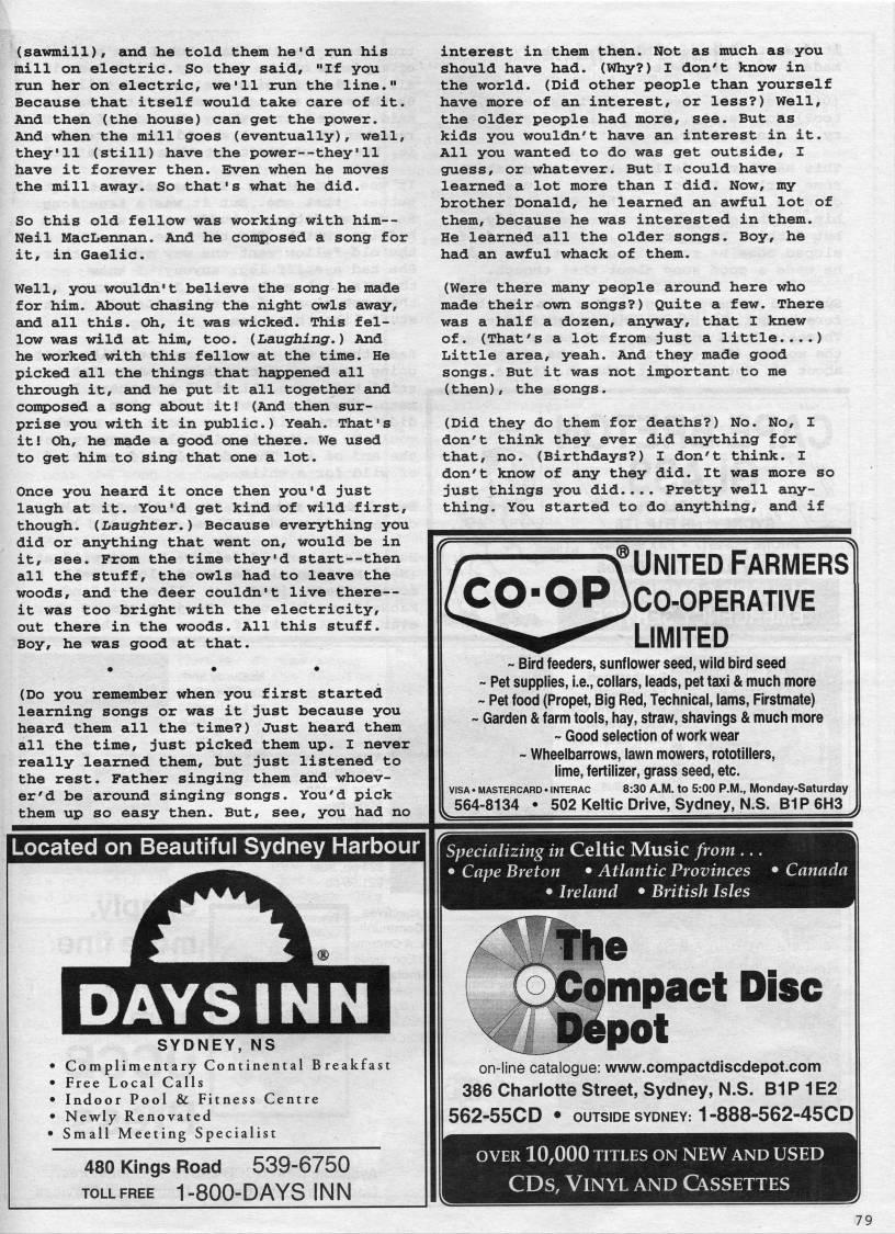 Published by Ronald Caplan on 1999/6/1 (450 reads)(sawmill), and he told them he'd run his mill on electric. So they said, "If you run her on electric, we'll run the line." Because that itself would take care of it. And then (the house) can get the power. And when the mill goes (eventually), well, they'll (still) have the power--they'11 have it forever then. Even when he moves the mill away. So that's what he did. So this old fellow was working with him • Neil MacLennan. And he composed a song for it, in Gaelic. interest in them then. Not as much as you should have had. (Why?) I don't know in the world. (Did other people than yourself have more of an interest, or less?) Well, the older people had more, see. But as kids you wouldn't have an interest in it. All you wanted to do was get outside, I guess, or whatever. But I could have learned a lot more than I did. Now, my brother Donald, he learned an awful lot of them, because he was interested in them. He learned all the older songs. Boy, he had an awful whack of them. Well, you wouldn't believe the song he made for him. About chasing the night owls away, and all this. Oh, it was wicked. This fel? low was wild at him, too. (Laughing.) And he worked with this fellow at the time. He picked all the things that happened all through it, and he put it all together and composed a song about it! (And then sur? prise you with it in public.) Yeah. That's it! Oh, he made a good one there. We used to get him to sing that one a lot. Once you heard it once then you'd just laugh at it. You'd get kind of wild first, though. {Laughter,) Because everything you did or anything that went on, would be in it, see. From the time they'd start • then all the stuff, the owls had to leave the woods, and the deer couldn't live there-- it was too bright with the electricity, out there in the woods. All this stuff. Boy, he was good at that. (Do you remember when you first started learning songs or was it just because you heard them all the time?) Just heard them all the time, just picked them up. I never really learned them, but just listened to the rest. Father singing them and whoev- er'd be around singing songs. You'd pick them up so easy then. But, see, you had no (Were there many people around here who made their own songs?) Quite a few. There was a half a dozen, anyway, that I knew of. (That's a lot from just a little....) Little area, yeah. And they made good songs. But it was not important to me (then), the songs. (Did they do them for deaths?) No. No, I don't think they ever did anything for that, no. (Birthdays?) I don't think. I don't know of any they did. It was more so just things you did.... Pretty well any? thing. You started to do anything, and if 'UNITED FARMERS CO-OP 'Co-operative LIMITED ~ Bird feeders, sunflower seed, wild bird seed ~ Pet supplies, i.e., collars, leads, pet taxi & much more ~ Pet food (Propet, Big Red, Technical, lams, Firstmate) ~ Garden & farm tools, hay, straw, shavings & much more ~ Good selection of work wear ~ Wheelbarrows, lawn mowers, rototillers, lime, fertilizer, grass seed, etc. VISA • MASTERCARD • INTERAC 8:30 A.M. to 5:00 P.M., Monday-Saturday 564-8134 • 502 Keltic Drive, Sydney, N.S. B1P 6H3 ' Located on Beautiful Sydney Harbour Specializing in Celtic Musk from... • Cape Breton • Atlantic Provinces • Canada • Ireland • British Isles /' DAYS IN N SYDNEY, NS Complimentary Continental Breakfast Free Local Calls Indoor Pool & Fitness Centre Newly Renovated Small Meeting Specialist 480 Kings Road 539-6750 TOLLFREE 1-800-0AYS INN mpact Disc pot on-line catalogue: www.connpactdiscdepot.com 386 Charlotte Street, Sydney, N.S. B1P 1E2 562-55CD • OUTSIDE SYDNEY: 1-888-562-45CD OVER 10,000 TITLES ON NEW AND USED CDs, Vinyl and Cassettes 79