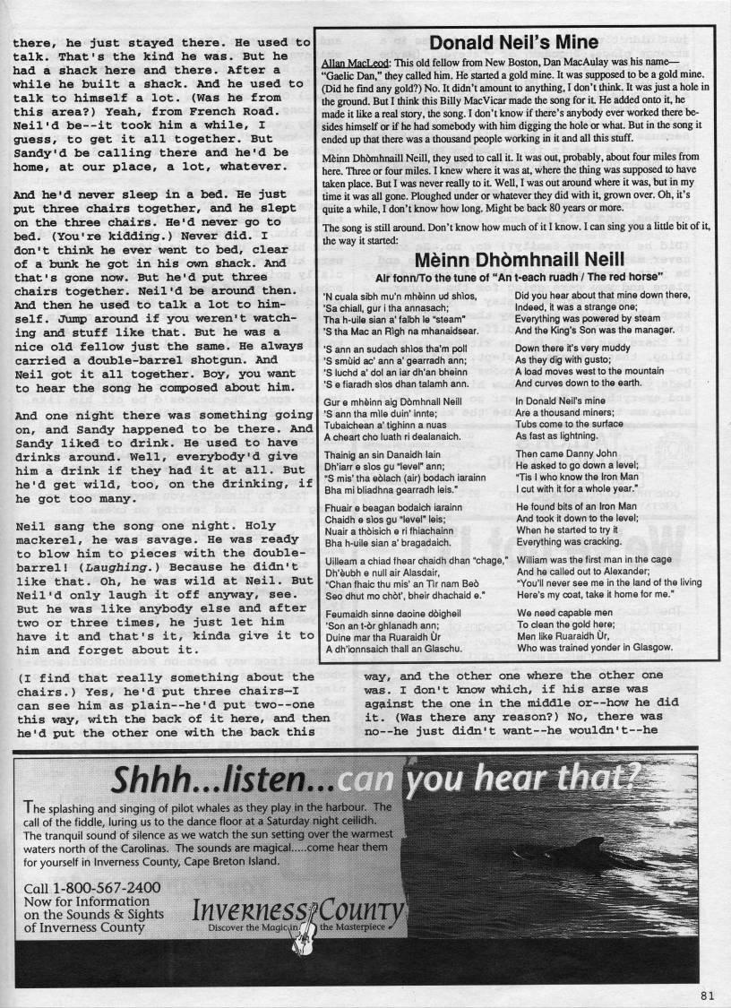 Published by Ronald Caplan on 1999/6/1 (311 reads)there, he just stayed there. He used to talk. That's the kind he was. But he had a shack here and there. After a while he built a shack. And he used to talk to himself a lot. (Was he from this area?) Yeah, from French Road. Neil'd be--it took him a while, I guess, to get it all together. But Sandy'd be calling there and he'd be home, at our place, a lot, whatever. And he'd never sleep in a bed. He just put three chairs together, and he slept on the three chairs. He'd never go to bed. (You're kidding.) Never did. I don't think he ever went to bed, clear of a bunk he got in his own shack. And that's gone now. But he'd put three chairs together. Neil'd be around then. And then he used to talk a lot to him? self. Jump around if you weren't watch? ing and stuff like that. But he was a nice old fellow just the same. He always carried a double-barrel shotgun. And Neil got it all together. Boy, you want to hear the song he composed about him. And one night there was something going on, and Sandy happened to be there. And Sandy liked to drink. He used to have drinks around. Well, everybody'd give him a drink if they had it at all. But he'd get wild, too, on the drinking, if he got too many. Neil sang the song one night. Holy mackerel, he was savage. He was ready to blow him to pieces with the double- barrel! {Laughing.) Because he didn't like that. Oh, he was wild at Neil. But Neil'd only laugh it off anyway, see. But he was like anybody else and after two or three times, he just let him have it and that's it, kinda give it to him and forget about it. Donald Neil's Mine Allan MacLeod: This old fellow from New Boston, Dan MacAulay was his name • "Gaelic Dan," they called him. He started a gold mine. It was supposed to be a gold mine. (Did he find any gold?) No. It didn't amount to anything, I don't Uiink. It was just a hole in the ground. But I think this Billy Mac Vicar made the song for it He added onto it, he made it like a real story, the song. I don't know if there's anybody ever worked there be? sides himself or if he had somebody with him digging the hole or what. But in the song it ended up that there was a thousand people working in it and all this stuff. Mfeinn Dh6mhnaill Neill, they used to call it. It was out, probably, about four miles from here. Three or four miles. I knew where it was at, where the thing was supposed to have taken place. But I was never really to it Well, I was out around where it was, but in my time it was all gone. Ploughed under or whatever they did with it, grown over. Oh, it's quite a while, I don't know how long. Might be back 80 years or more. The song is still around. Don't know how much of it I know. I can sing you a little bit of it, the way it started: Meinn Dhomhnaill Neill Air fonn/To the tune of "An t-each ruadh / The red horse" 'N cuala sibh mu'n mh5inn ud shlos, 'Sa chiall, gur i tha annasach; Tha h-uile sian a' falbh le "steam" 'S tha Mac an Rlgh na mhanaidsear. '8 ann an sudach shlos tha'm poll 'S smCiid ac' ann a' gearradh ann; '8 luchd a' do! an iar dh'an bheinn '8 e fiaradh slos dhan talamh ann. Gur e mhiinn aig Dbmhnall Neill 'S ann tha mile duin' innte; Tubaichean a' tighinn a nuas A cheart cho luath ri dealanaich. Thainig an sin Danaidh lain Dh'iarr e slos gu "level" ann; "8 mis' tha ediach (air) bodach iarainn Bha mi bliadhna gearradh leis." Fhuair e beagan bodaich iarainn Chaidh e slos gu "level" leis; Nuair a thdisich e ri fhiachainn Bha h-uile sian a' bragadaich. Uilleam a chiad fhear chaidh dhan "chage," Dh'dubh e null air Alasdair, "Chan fhaic thu mis' an Tlr nam Bed Seo dhut mo ch6t', bheir dhachaid e." Feumaidh sinne daoine ddigheil 'Son an t-6rghlanadh ann; Duine mar tha Ruaraidh Or A dh'ionnsaich thai! an Glaschu. Did you hear about that mine down there, Indeed, it was a strange one; Everything was powered by steam And the King's Son was the manager. Down there it's very muddy As they dig with gusto; A load moves west to the mountain And curves down to the earth. In Donald Neil's mine Are a thousand miners; Tubs come to the surface As fast as lightning. Then came Danny John He asked to go down a level; "Tis I who know the Iron Man I cut with it for a whole year." He found bits of an Iron Man And took it down to the level; When he started to try it Everything was cracking. William was the first man in the cage And he called out to Alexander; "You'll never see me in the land of the living Here's my coat, take it home for me." We need capable men To clean the gold here; Men like Ruaraidh Or, Who was trained yonder in Glasgow. (I find that really something about the chairs.) Yes, he'd put three chairs • I can see him as plain--he'd put two--one this way, with the back of it here, and then he'd put the other one with the back this way, and the other one where the other one was. I don't know which, if his arse was against the one in the middle or • how he did it. (Was there any reason?) No, there was no--he just didn't want--he wouldn't • he Shhh,..listen.,: The splashing and singing of pilot whales as they play m the harbour. The call of the fiddle, luring us to the dance floor at a Saturday night ceSlrdh, The tranquil sound of silence as we watch the sun setting over the warmest waters north of the Carolinas. The sounds are rtiagical come hear them for yourself in Inverness County, Cape Breton Island. Call 1-800-567-2400 Now for Information on the Sounds & Sights of Inverness County