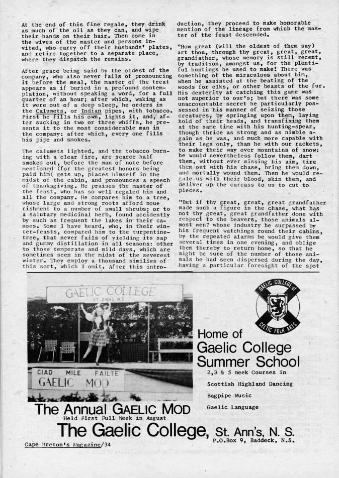 Published by Ronald Caplan on 1977/6/1 (311 reads)At the end of this fine regale, they drink as much of the oil as they can, and wipe their hands on their hair. Then come in the wives of the master and persons in? vited, who carry off their husbands* plates, and retire together to a separate place, where they dispatch the remains. After grace being said by the oldest of the company, who also never fails of pronouncing it before the meal, the master of the treat appears as if buried in a profound contem? plation, without speaking a word, for a full quarter of an hour; after which, waking as it were out of a deep sleep, he orders in the Calumets, or Indian pipes, with tobacco. First he fills his own, lights it, and, af? ter sucking in two or three whiffs, he pre? sents it to the most considerable man in the company: after which, every one fills his pipe and smokeso The calumets lighted, and the tobacco burn? ing with a clear fire, are scarce half smoked out, before the man of note before mentioned (for the greatest honors being paid him*( gets up, places himself in the midst of the cabin, and pronounces a speech of thanksgiving. He praises the master of the feast, who has so well regaled him and all the company. He compares him to a tree, whose large and strong roots afford nou=' rishment to a number of small shrubs; or to a salutary medicinal herb, found accidently by such as frequent the lakes in their ca? noes. Some I have heard, who, in their win? ter-feasts, compared him to the turpentine- tree, that never fails of yielding its sap and gummy distillation in all seasons; other to those temperate and mild days, which are sometimes seen in the midst of the severest winter. They employ a thousand similies of this sort, which I omit. After this intro? duction, they proceed to make honorable mention of the lineage from which the mas? ter of the feast descended. "How great (will the oldest of them say) art thou, through thy great, great, great, grandfather, whose memory is still recent, by tradition, amongst us, for the plenti? ful huntings he used to makel There was something of the miraculous about him, when he assisted at the beating of the woods for elks, or other beasts of the fur. His dexterity at catching this game was not superior to our's; but there was some unaccountable secret he particularly pos? sessed in his manner of seizing those creatures, by springing upon them, laying hold of their heads, and transfixing them at the same time with his hunting-spear, though thrice as strong and as nimble a- gain as he was, and much more capable with their legs only, than he with our rackets, to make their way over mountains of snow: he would nevertheless follow them, dart them, without ever missing his aim, tire them out with his chase, bring them down, and mortally wound them. Then he would re? gale us with their blood, skin them, and deliver up the carcass to us to cut to pieceso "But if thy great, great, great grandfather made such a figure in the chase, what has not thy great, great grandfather done with respect to the beavers, those animals al? most men? whose industry he surpassed by his frequent watchings round their cabins, by the repeated alarms he would give them several times in one evening, and oblige them thereby to return home, so that he might be sure of the number of those ani? mals he had seen dispersed during the day, having a particular foresight of the spot CIAD NILE The Annual Gaelic Mod Held First Full Week in August Home of Gaelic College Summer School 2,3 & 5 Week Courses in Scottish Highland Dancing Bagpipe Music Gaelic Language The Gaelic College, st. Anns, n. s. Cape Breton's Magazine/34 P.O.Box 9, Baddeck, N.S.