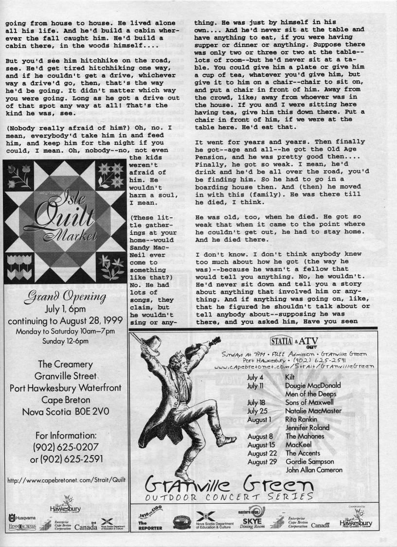 Published by Ronald Caplan on 1999/6/1 (274 reads)going from house to house. He lived alone all his life. And he'd build a cabin wher? ever the fall caught him. He'd build a cabin there, in the woods himself.... But you'd see him hitchhike on the road, see. He'd get tired hitchhiking one way, and if he couldn't get a drive, whichever way a drive'd go, then, that's the way he'd be going. It didn't matter which way you were going. Long as he got a drive out of that spot any way at all! That's the kind he was, see. (Nobody really afraid of him?) Oh, no. I mean, everybody'd take him in and feed him, and keep him for the night if you could, I mean. Oh, nobody • no, not even I the kids I weren't I afraid of I him. He I wouldn't I harm a soul, I I mean. (These lit? tle gather? ings at your home • would Sandy Mac? Neil ever come to something like that?) No. He had lots of songs, they claim, but he wouldn't sing or any- 'vanB Q-penifK' July 16pm continuing to August 28,1999 Monday to Saturday 10am-7pm Sunday 12-6pm The Creamery Granville Street Port Hawkesbury Waterfront Cope Breton Nova Scotia BOE 2V0 For Information: (902)625-0207 or (902) 625-2591 http://www.capebretonet.conn/Strait/Quilt (fflHusqvama _- _'_ TT -id, Enterprise ,., llT 01'' jir c:?. • r Canada s'?s?="' thing. He was just by himself in his own.... And he'd never sit at the tsd3le and have anything to eat, if you were having supper or dinner or anything. Suppose there was only two or three or two at the table • lots of room • but he'd never sit at a ta? ble. You could give him a plate or give him a cup of tea, whatever you'd give him, but give it to him on a chair • chair to sit on, and put a chair in front of him. Away from the crowd, like; away from whoever was in the house. If you euid I were sitting here having tea, give him this down there. Put a chair in front of him, if we were at the table here. He'd eat that. It went for years and years. Then finally he got--age and all--he got the Old Age Pension, and he was pretty good then.... Finally, he got so weak. I mean, he'd drink and he'd be all over the road, you'd be finding him. So he had to go in a boarding house then. And (then) he moved in with this (family). He was there till he died, I think. He was old, too, when he died. He got so weak that when it came to the point where he couldn't get out, he had to stay home. And he died there. I don't know. I don't think anybody knew too much about how he got (the way he was)--because he wasn't a fellow that would tell you anything. No, he wouldn't. He'd never sit down and tell you a story about anything that involved him or any? thing. And if anything was going on, like, that he ficnired he shouldn't talk about or tell anybody about • supposing he was there, and you asked him. Have you seen [SraJ&ATV; uuu;.a/1pebre+OTe + .dO'/S-l-r/1/-(-/6-r/lTv///e6-reeT July 4 July 11 July 18 July 25 August 1 August 8 August 15 August 22 August 29 Kilt Dougie MacDonald Men of the Deeps Sons of Maxwell Natalie MacMaster Rita Rankin Jennifer Roland The Mahones MacKeel The Accents Gordie Sampson John Allan Cameron iv;//e frreeTA OKj-rx>ooi coNt'Ti-r Stv'-itS fK't* .< • ? >c eastern'' SIOTE' Dining Room • jjC' Enterprise -ilfe Cape Breton imV Corporatio, '
