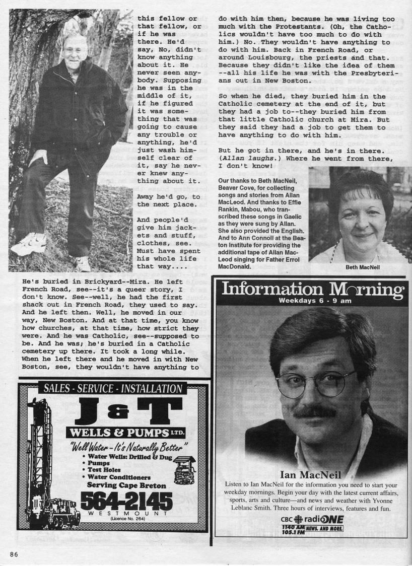Published by Ronald Caplan on 1999/6/1 (247 reads)this fellow or that fellow, or J ' ' if he was 7 ''':SA there. He' d say. No, didn't know anything about it. He never seen any? body. Supposing he was in the middle of it, if he figured it was some? thing that was going to cause any trouble or anything, he'd just wash him? self clear of it, say he nev? er knew any? thing about it. Away he'd go, to the next place. -c=v7-'' And people'd -" yy-i'f'j'.. give him jack- • i ' ets and stuff, - '' -.-?? -Ifi-.Y''I' c 1 othes, see. ??Cr'.'-.'-ti; ??. Must have spent -T'''''>~ >'jj his whole life ??' • i'*''; ;.?';-'.; • that way.... He's buried in Brickyard • Mira. He left French Road, see • it's a queer story, I don't know. See • well, he had the first shack out in French Road, they used to say. And he left then. Well, he moved in our way. New Boston. And at that time, you know how churches, at that time, how strict they were. And he was Catholic, see • supposed to be. And he was; he's buried in a Catholic cemetery up there. It took a long while. When he left there and he moved in with New Boston, see, they wouldn't have anything to SMES ?? SERVICE ?? XmiMXAlXO' J?T WELLS & PUMPS' • Water Wells: DrUled & Dug > • Pumps • Test Holes • Water Conditioners Serving Cape Breton S642i45 E S T M O U N (Licence No. 264) do with him then, because he was living too much with the Protestants. (Oh, the Catho? lics wouldn't have too much to do with him.) No. They wouldn't have anything to do with him. Back in French Road, or around Louisbourg, the priests and that. Because they didn't like the idea of them --all his life he was with the Presbyteri? ans out in New Boston. So when he died, they buried him in the Catholic cemetery at the end of it, but they had a job to • they buried him from that little Catholic church at Mira. But they said they had a job to get them to have anything to do with him. But he got in there, and he's in there. {Allan laughs.) Where he went from there, I don't know! ' Our thanks to Beth MacNeJI, Beaver Cove, for collecting songs and stories from Allan MacLeod. And thanks to Effle Rankin, Mabou, who tran? scribed these songs in Gaelic as they were sung by Allan. She also provided the English. And to Ann Con noil at the Bea? ton Institute for providing the additional tape of Allan Mac? Leod singing for Father Errol MacDonald. Listen to Ian MacNeil for the inrormation you need to start your weekday mornings. Begin your day with the latest current affairs, sports, arts and culture • and news and weather with Yvonne Leblanc Smith. Three hours of interviews, features and fun. CBc#radiQJtfC jgy''lNIWS. AMD MRU 86