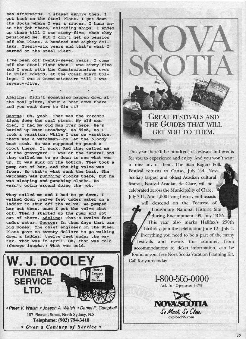 Published by Ronald Caplan on 1999/6/1 (196 reads)sea afterwards. I stayed ashore then. I got back on the Steel Plant. I got down the docks where I was a rigger. I hung on? to the job there, unloading ships. I ended up there till I was sixty-five, then they pensioned me. But I don't get no pension off the Plant. A hundred and eighty dol? lars. Twenty-six years and that's what I earned at the Steel Plant. I've been off twenty-seven years. I come off the Steel Plant when I was sixty-five and I went with the Commissionaires over in Point Edward, at the Coast Guard Col? lege. I was a Commissionaire till I was seventy-five. Adeline: Didn't something happen down at the coal piers, about a boat down there and you went down to fix it? George; Oh, yeah. That was the Toronto Light down the coal piers. My old man died, I had my old man over here. He's buried up East Broadway. He died, so I took a vacation. While I was on vacation, there was a watchman--he let the bloody boat sink. He was supposed to punch a clock there. It sunk. And they called me at the graveyard. I was at the funeral and they called me to go down to see what was up. It was sunk on the bottom. They took a pump out of her, and the big valve was froze. So that's what sunk the boat. The watchman was punching clocks there, but he was sleeping and punching clocks. He wasn't going around doing the job. They called me and I had to go down. I walked down twelve feet under water on a ladder to shut off the valve. We pumped her out then, once I got the valve shut off. Then I started up the pump and got out of there. Adeline: That's twelve feet under water. George: In them days that was big money. The chief engineer on the Steel Plant gave me twenty dollars to go walking down a ladder, twelve feet under the wa? ter. That was in April. Oh, that was cold. {George laughs.) That was cold. W. J. DOOLEY FUNERAL SERVICE LTD. • Peter V. Walsh • Joseph A. Walsh • Daniel P. Campbell 107 Pleasant Street, North Sydney, N.S. Telephone: (902) 794-3418 • Over a Century of Service • Great festivals and THE Guides that will GET YOU TO THEM. This year there'll be hundreds of festivals and events for you to experience and enjoy. And you won't want to miss any of them. The Stan Rogers Folk Festival returns to Canso, July 2-4. Nova Scotia's largest and oldest Acadian cultural festival. Festival Acadian de Clare, will be celebrated across the Municipality of Clare, July 7-11. And 1,500 living history enthusiasts will descend on the Fortress of Louisbourg National Historic Site during Encampment '99, July 23-25. This year also marks Halifax's 250th birthday, join the celebration June 12 -July 4. Everything you need to be a part of the many festivals and events this summer, from I accommodations to ticket information, can be " found in your free Nova Scotia Vacation Planning Kit. Call for yours today. 1-800-565-0000 Ask for Operator#479 exploreNS.com