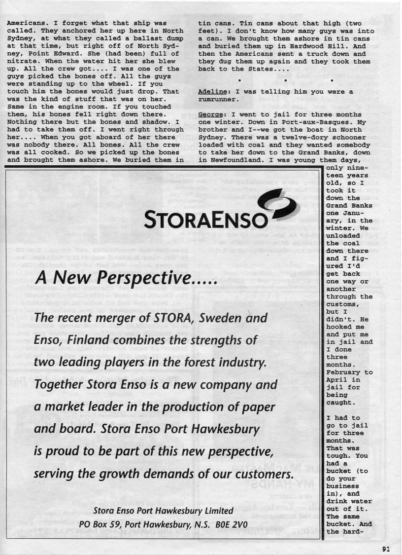 Published by Ronald Caplan on 1999/6/1 (191 reads)Americans. I forget what that ship was called. They anchored her up here in North Sydney, at what they called a ballast dump at that time, but right off of North Syd? ney, Point Edward. She (had been) full of nitrate. When the water hit her she blew up. All the crew got.... I was one of the guys picked the bones off. All the guys were standing up to the wheel. If you touch him the bones would just drop. That was the kind of stuff that was on her. Same in the engine room. If you touched them, his bones fell right down there. Nothing there but the bones and shadow. I had to take them off. I went right through her.... When you got aboard of her there was nobody there. All bones. All the crew was all cooked. So we picked up the bones and brought them ashore. We buried them in tin cans. Tin cans about that high (two feet). I don't know how many cruys was into a can. We brought them ashore in tin cans and buried them up in Hardwood Hill. And then the Americans sent a truck down and they dug them up again and they took them back to the States.... Adeline; I was telling him you were a rumrunner. George: I went to jail for three months one winter. Down in Port-aux-Basciues. My brother and I--we got the boat in North Sydney. There was a twelve-dory schooner loaded with coal and they wanted somebody to take her down to the Grand Banks, down in Newfoundland. I was young them days, only nine? teen years StoraEnso' A New Perspective. The recent merger of STORA, Sweden and Enso, Finland combines the strengths of two leading players in the forest industry. Together Stora Enso is a new company and a market leader in the production of paper and board. Stora Enso Port Hawkesbury is proud to be part of this new perspective, serving the growth demands of our customers. Stora Enso Port Hawkesbury Limited PO Box 59, Port Hawkesbury, N.S. BOE 2V0 old, so I took it down the Grand Banks one Janu? ary, in the winter. We unloaded the coal down there and I fig? ured I' d get back one way or another through the customs, but I didn't. He hooked me and put me in jail and I done three months. February to April in jail for being caught. I had to go to jail for three months. That was tough. You had a bucket (to do your business in), and drink water out of it. The same bucket. And the hard- 91