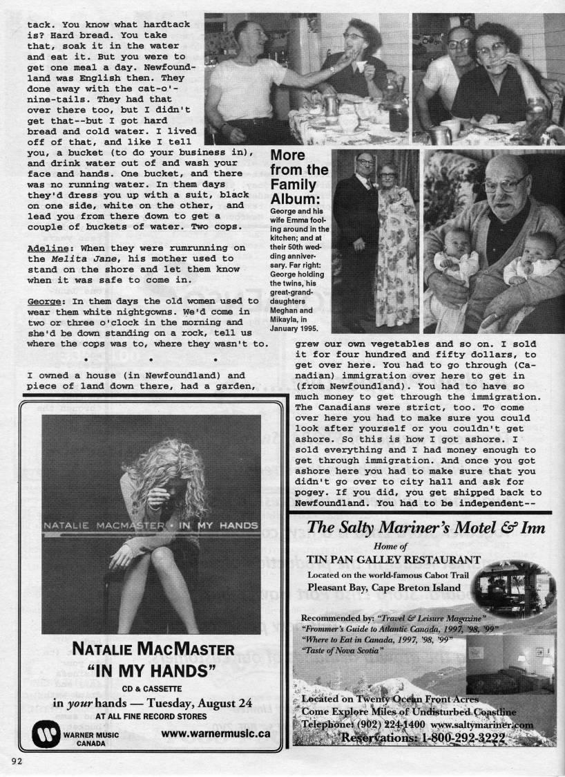 Published by Ronald Caplan on 1999/6/1 (187 reads)tack. You know what hardtack is? Hard bread. You take that, soak it in the water and eat it. But you were to get one meal a day. Newfound? land was English then. They done away with the cat-o'- nine-tails. They had that over there too, but I didn't get that' • but I got hard bread and cold water. I lived off of that, and like I tell you, a bucket (to do your business in), and drink water out of and wash your face and hands. One bucket, and there was no running water. In them days they'd dress you up with a suit, black on one side, white on the other, and lead you from there down to get a couple of buckets of water. Two cops. Adeline: When they were rumrunning on the Melita Jane, his mother used to stand on the shore and let them know when it was safe to come in. George: In them days the old women used to wear them white nightgowns. We'd come in two or three o'clock in the morning and she'd be down standing on a rock, tell us where the cops was to, where they wasn't to I owned a house (in Newfoundland) and piece of land down there, had a garden. More from the Family Album: George and his wife Emma fool? ing around in the kitchen; and at their 50th wed? ding anniver? sary. Far right: George holding the twins, his great-grand? daughters Meghan and Mil