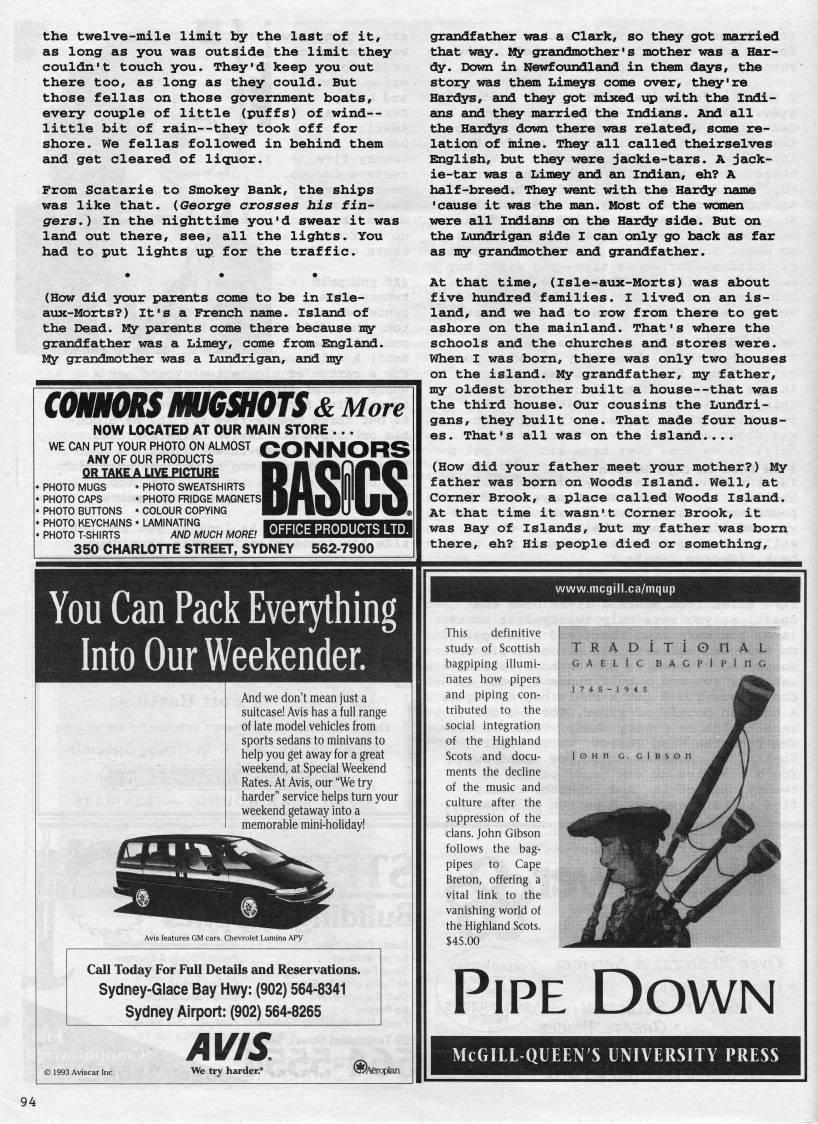 Published by Ronald Caplan on 1999/6/1 (200 reads)the twelve-mile limit by the last of it, as long as you was outside the limit they couldn't touch you. They'd keep you out there too, as long as they could. But those fellas on those government boats, every couple of little (puffs) of wind • little bit of rain--they took off for shore. We fellas followed in behind them and get cleared of liquor. From Scatarie to Smokey Bank, the ships was like that. {George crosses his fin? gers.) In the nighttime you'd swear it was land out there, see, all the lights. You had to put lights up for the traffic. grandfather was a Clark, so they got married that way. My grandmother's mother was a Har? dy. Down in Newfoundland in them days, the story was them Limeys come over, they're Hardys, and they got mixed up with the Indi? ans and they married the Indians. And all the Hardys down there was related, some re? lation of mine. They all called theirselves English, but they were jackie-tars. A jack- ie-tar was a Limey • md an Indian, eh? A half-breed. They went with the Hardy name 'cause it was the man. Most of the women were all Indians on the Hardy side. But on the Lxindrigan side I can only go back as far as my grandmother and grandfather. (How did your parents come to be in Isle- aix-Morts?) It's a French name. Island of the Dead. My parents come there because my grandfather was a Limey, come from England. My grandmother was a Lxindrigan, and my COHMORS MUeSHOTS & More NOW LOCATED AT OUR MAIN STORE . . . WE CAN PUT YOUR PHOTO ON ALMOST OON MORS ANY OF OUR PRODUCTS '''' ?? '_i ir>'r-m'fciP OR TAKE A LIVE PICTURE PHOTO MUGS ?? PHOTO SWEATSHIRTS PHOTO CAPS * PHOTO FRIDGE MAGNETS] PHOTO BUnONS * COLOUR COPYING PHOTO KEYCHAINS • LAMINATING PHOTO T-SHIRTS AND MUCH MORE! 350 CHARLOTTE STREET, SYDNEY BASCS OFFICE PRODUCTS LTD. 562-7900 At that time, (Isle-aux-Morts) was about five hundred families. I lived on an is? land, and we had to row from there to get ashore on the mainland. That's where the schools and the churches and stores were. When I was born, there was only two houses on the island. My grandfather, my father, my oldest brother built a house • that was the third house. Our cousins the Lundri- gans, they built one. That made four hous? es. That's all was on the island.... (How did your father meet your mother?) My father was born on Woods Island. Well, at Corner Brook, a place called Woods Island. At that time it wasn't Corner Brook, it was Bay of Islands, but my father was born there, eh? His people died or something. You Can Pack Everythini Into Our Weekender. And we don't mean just a suitcase! Avis has a full range of late model vehicles from sports sedans to minivans to help you get away for a great weekend, at Special Weekend Rates. At Avis, our "We try harder" service helps turn your weekend getaway into a memorable mini-holiday! Chevrolet Lumina APV Call Today For Full Details and Reservations. Sydney-Glace Bay Hwy: (902) 564-8341 Sydney Airport: (902) 564-8265 ?? 1993 Aviscar Inc. AV/S We try harder." <$)Ae This definitive study of Scottish bagpiping illumi? nates how pipers and piping con? tributed to the social integration of the Highland Scots and docu? ments the decline of the music and culture after the suppression of the clans. John Gibson follows the bag? pipes to Cape Breton, offering a vital link to the vanishing world of the Highland Scots. $45.00 TRAL'ITIOnAL G A n L i (", n A G r i ! • i n o Pipe Down McGILL-QUEEN'S UNIVERSITY PRESS 94