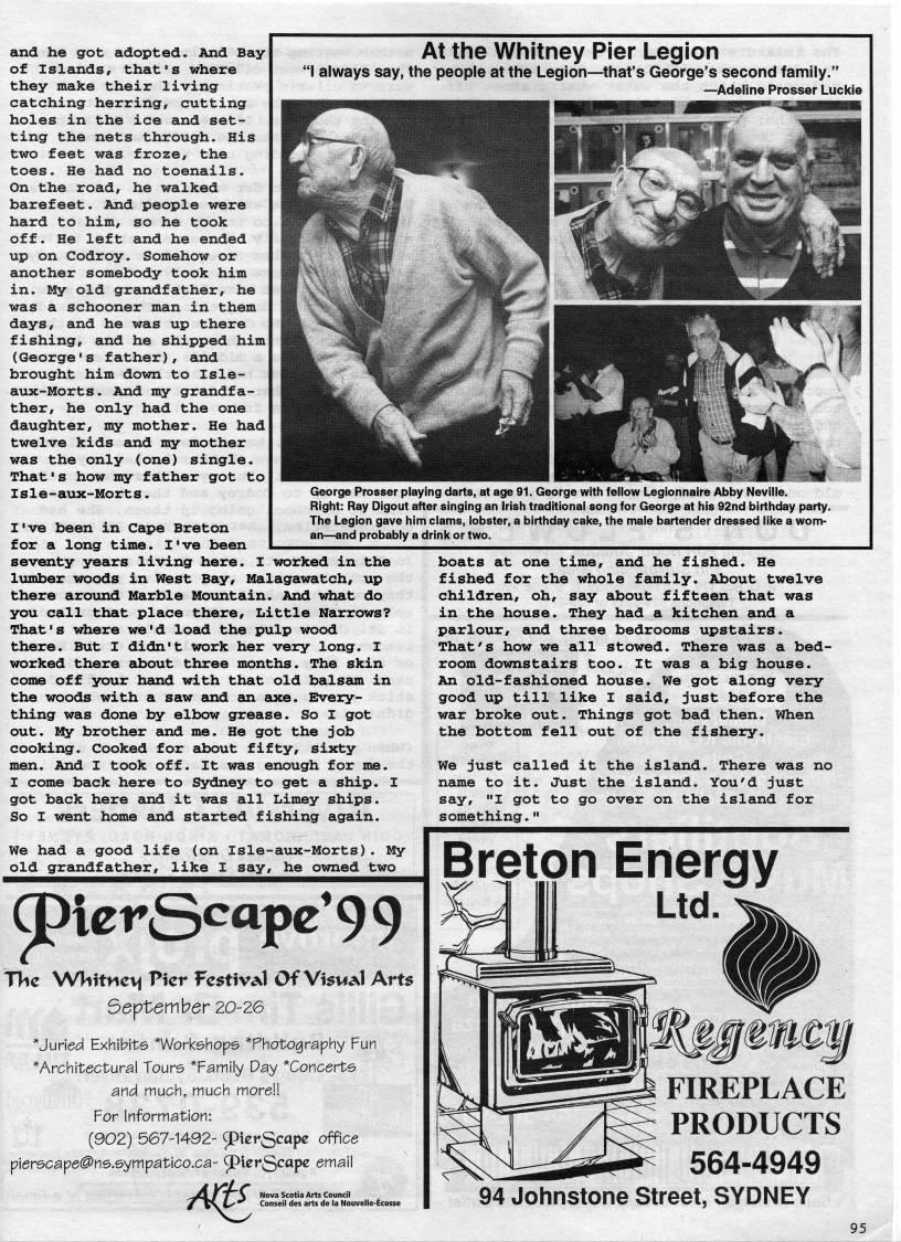 Published by Ronald Caplan on 1999/6/1 (243 reads)and he got adopted. And Bay of Islands, that's where they make their living catching herring, cutting holes in the ice and set? ting the nets through. His two feet was froze, the toes. He had no toenails. On the road, he walked barefeet. And people were hard to him, so he took off. He left and he ended up on Codroy. Somehow or another somebody took him in. My old grandfather, he was a schooner man in them days, and he was up there fishing, and he shipped him (George's father), and brought him down to Isle- aux-Morts. And my grandfa? ther, he only had the one daughter, my mother. He had twelve kids and my mother was the only (one) single. That's how my father got to Isle-aux-Morts. At the Whitney Pier Legion "I always say, the people at the Legion • that's George's second family." • Adeline Prosser Luckie I've been in Cape Breton for a long time. I've been seventy years living here. I worked in the lumber woods in West Bay, Malagawatch, up there around Marble Mountain. And what do you call that place there. Little Narrows? That' s where we' d load the pulp wood there. But I didn't work her very long. I worked there about three months. The skin come off your hand with that old balsam in the woods with a saw and an axe. Every? thing was done by elbow grease. So I got out. My brother and me. He got the job cooking. Cooked for about fifty, sixty men. And I took off. It was enough for me. I come back here to Sydney to get a ship. I got back here and it was all Limey ships. So I went home and started fishing again. We had a good life (on Isle-aux-Morts). My old grandfather, like I say, he owned two George Prosser playing darts, at age 91. George with fellow Legionnaire Abby Neville. Right: Ray Digout after singing an Irish traditional song for George at his 92nd birthday party. The Legion gave him clams, lobster, a birthday cake, the male bartender dressed like a wom? an • and probably a drink or two. boats at one time, and he fished. He fished for the whole family. About twelve children, oh, say about fifteen that was in the house. They had a kitchen and a parlour, and three bedrooms upstairs. That's how we all stowed. There was a bed? room downstairs too. It was a big house. An old-fashioned house. We got along very good up till like I said, just before the war broke out. Things got bad then. When the bottom fell out of the fishery. We just called it the island. There was no name to it. Just the island. You'd just say, "I got to go over on the island for something." CpierScape'99 Ihc VUHnci Vicr Festival Of Visvi'l Arts September 20-26 'Juried Exhibits "Workshops "Photography Fun "Architectural Tours "Family Day "Concerts and much, much morel! For Information: (902) 567-1492- gpiergcape office pierscape('ns.sympatico.ca- cpiergcape email _ yt ri Nova Scotia Arts Council iXSjL-''' Conseil des arts de la Nouvelle-??cosse Breton Energy Ltd. FIREPLACE PRODUCTS 564-4949 94 Johnstone Street, SYDNEY 95