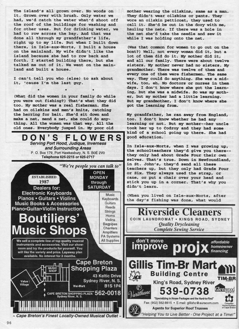 Published by Ronald Caplan on 1999/6/1 (203 reads)The island's all grown over. No woods on it. Grown over with brush. Only water we had, we'd catch the water what'd shoot off the roof of the buildings for washing and for other uses. But for drinking water, we had to row across the bay. And that was done all through my grandfather's life, right up to my life. But when I built down there, in Isle-aux-Morts, I built a house on the mainland. My wife didn't like the island because she had to row back and forth. I started building there, but she talked me out of it. We went on the main? land and built a house. I can't tell you who (else) to ask about it, 'cause I'm the last guy. (What did the women in your family do while you were out fishing?) That's what they did too. My mother was a real fisherman. She had on oilskins and men's knits, catching the herring for bait. She'd sit down and make a net, mend a net, she could do any? thing. All the women was that way. All the old ones. Everybody jumped in. My poor old DON'S FLOWERS Serving Port Hood, Judique, Inverness and Surrounding Areas p. O. Box 179, Port Hawkesbury, N. S. BOE 2V0 Telephone 625-2215 or 625-2717 ''We're people you can talk to" ESTABLISHED 1987 Dealers for: Electronic Keyboards Pianos • Guitars • Violins Music Books & Accessories Boutiliers' Music Shops instruments and accessories. Visit our siiow- room and try the products for yourself. You will like the variety and price. Layaway plan ailable. No interest for 3 months. OPEN MONDAY through SATURDAY Music Keyboards Guitars Reeds Strings Horns Violins Chanters Amplifiers PA Systems All Supplies Cape Breton '''' I rr Shopping Plaza ~T 43 Keltic Drive ' ' Sydney River, N. S. Wal-Mart I B1S1P4 I , CAPE BRETON SHOPPING PLAZA 562"001 8 Sydney River, N. S. mother wearing the oilskins, same as a man. They didn't wear oilskins or pants. They wore an oilskin petticoat, they used to call it. She'd be out in the dory with me, hauling the nets. If there was a hole in the net she'd take the needle and sew it while I was holding onto the net. (Was that common for women to go out on the boat?) Well, not every woman did it, but a lot of them did do it. My mother did it, and all our family. There were about twelve sisters. My mother never had no sisters. My gremdmother. There was twelve of them emd every one of them were fisheannen. The same way. They could do anything. She was a mid? wife, too, eh. No doctors or nurses in them days. I don't know where she got the learn? ing, but she was a midwife. So was my moth? er, but my mother had a little learning. But my grandmother, I don't know where she got the learning from. My grandfather, he ran away from England, too. I don't know whether he had any learning or not. But my mother--her uncle took her up to Codroy and they had some kind of a school going up there. She had good education. In isle-aux-Morts, when I was growing up, the schoolteachers they'd give you there • they only had about Grade Four their own selves. That's true. Down in Newfoundland, in St. John's, they'd send all these teachers up, but they only had Grade Four or Six. They always used the strap, or cane, or put a chair over your head and stick you up in a corner. That's why you didn't learn. (When you lived on Isle-aux-Morts, after the day's fishing was done, what would il IIIIIIIIIIHIIIIIIIIIIIIIIIIIllllll r ~ Cape Breton's Finest Locally-Owned Musical Outlet ~ Riverside Cleaners COIN LAUNDROMAT • KINGS ROAD, SYDNEY Quality Dry cleaning Complete Sewing Service don't move affordable homeowner financing improve pfQJX Gillis Tim-Br Mart Building Centre King's Road, Sydney River ' 539-0738 '''' m 'Specializing in House Packages and the Hard-to-Find" Fax:(902)562-8615 • E-mail: gillishc@auracom.com Agents for Superior Roof Trusses 'Helping You to Live Better-One Project at a Time!" Canadian otne Builders Cape Breton 96