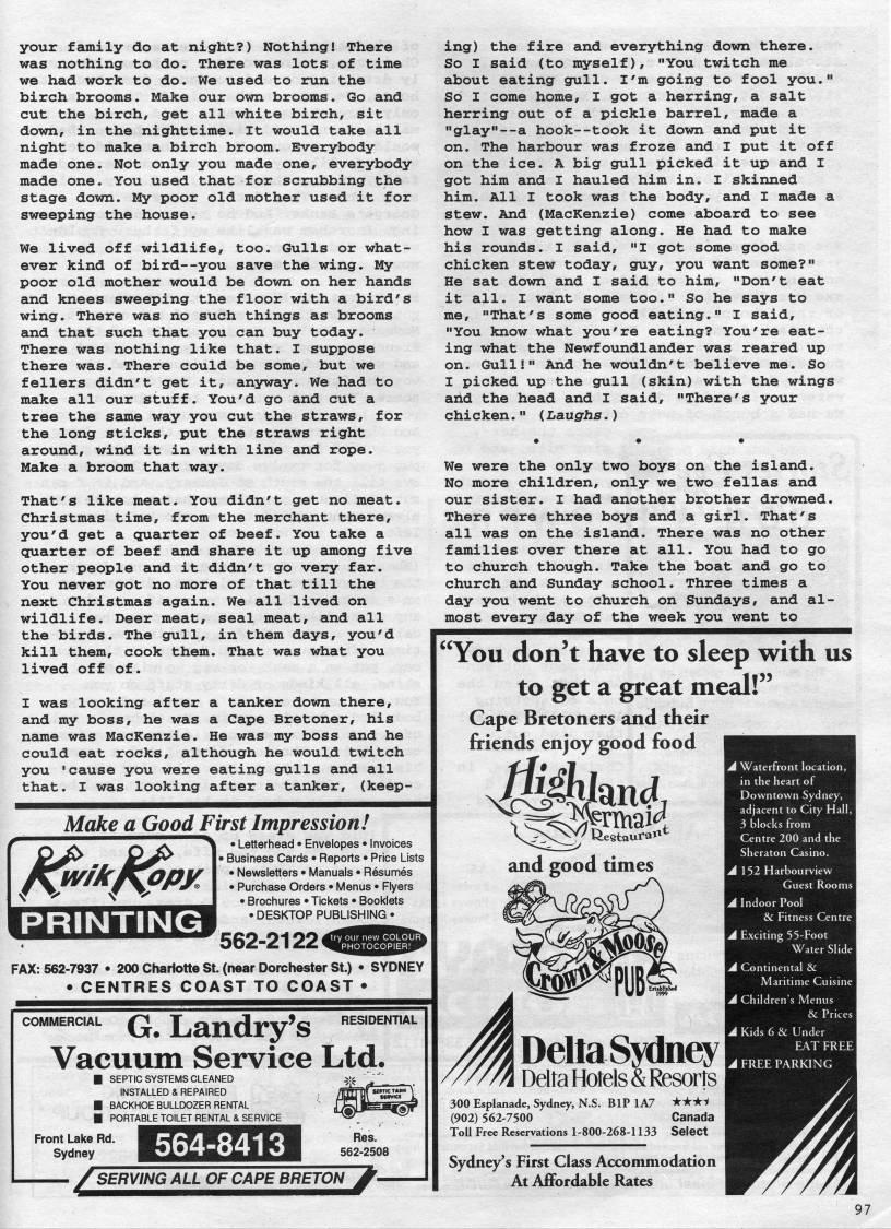 Published by Ronald Caplan on 1999/6/1 (203 reads)your family do at night?) Nothing! There was nothing to do. There was lots of time we had work to do. We used to run the birch brooms. Make our own brooms. Go and cut the birch, get all white birch, sit dox'n, in the nighttime. It would take all night to make a birch broom. Everybody made one. Not only you made one, everybody made one. You used that for scrubbing the stage down. My poor old mother used it for sweeping the house. We lived off wildlife, too. Gulls or what? ever kind of bird • you save the wing. My poor old mother would be down on her hands and knees sweeping the floor with a bird's wing. There was no such things as brooms and that such that you can buy today. There was nothing like that. I suppose there was. There could be some, but we fellers didn't get it, anyway. We had to make all our stuff. You'd go and cut a tree the same way you cut the straws, for the long sticks, put the straws right around, wind it in with line and rope. Make a broom that way. That's like meat. You didn't get no meat. Christmas time, from the merchant there, you'd get a quarter of beef. You take a QTuarter of beef and share it up among five other people and it didn't go very far. You never got no more of that till the next Christmas again. We all lived on wildlife. Deer meat, seal meat, and all the birds. The grull, in them days, you'd kill them, cook them. That was what you lived off of. I was looking after a tanker down there, and my boss, he was a Cape Bretoner, his name was MacKenzie. He was my boss and he could eat rocks, although he would twitch you 'cause you were eating gulls and all that. I was looking after a tanker, (keep- Make a Good First Impression! • Letterhead • Envelopes • Invoices I* Business Cards • Reports • Price Lists • Newsletters • Manuals • Resumes • Purchase Orders • Menus • Flyers • Brochures • Tickets • Booklets • DESKTOP PUBLISHING. 562-2122 FAX: 562-7937 • 200 Charlotte St. (near Dorchester St.) • SYDNEY • CENTRES COAST TO COAST • COMMERCIAL RESIDENTIAL G. Landry's Vacuum Service Ltd. SEPTIC SYSTEMS CLEANED INSTALLED & REPAIRED BACKHOE BULLDOZER RENTAL PORTABLE TOILET RENTAL & SERVICE Front Lake Rd. Sydney 564-8413 ?? / SERVING ALL OF CAPE BRETON ' 1 ing) the fire and everything down there. So I said (to myself), "You twitch me about eating gull. I'm going to fool you." So I come home, I got a herring, a salt herring out of a pickle barrel, made a "glay"--a hook--took it down and put it on. The harbour was froze and I put it off on the ice. A big gull picked it up and I got him and I hauled him in. I skinned him. All I took was the body, and I made a stew. And (MacKenzie) come aboard to see how I was getting along. He had to make his rounds. I said, "I got some good chicken stew today, guy, you want some?" He sat down and I said to him, "Don't eat it all. I want some too." So he says to me, "That's some good eating." I said, "You know what you're eating? You're eat? ing what the Newfoundlander was reared up on. Gull!" And he wouldn't believe me. So I picked up the gull (skin) with the wings and the head and I said, "There's your chicken." (Laughs.) We were the only two boys on the island. No more children, only we two fellas and our sister. I had another brother drowned. There were three boys and a girl. That's all was on the island. There was no other families over there at all. You had to go to church though. Take the boat and go to church and Sunday school. Three times a day you went to church on Sundays, and al? most every day of the week you went to You don't have to sleep with us to get a great meal!" Cape Bretoners and their friends enjoy good food and good times DellaSydney Ddta Hotels & Resorts 300 Esplanade, Sydney, N.S. BIP 1A7 • • • ' (902) 562-7500 Canada Toll Free Reservations 1-800-268-1133 Select Sydney's First Class Accommodation At Affordable Rates