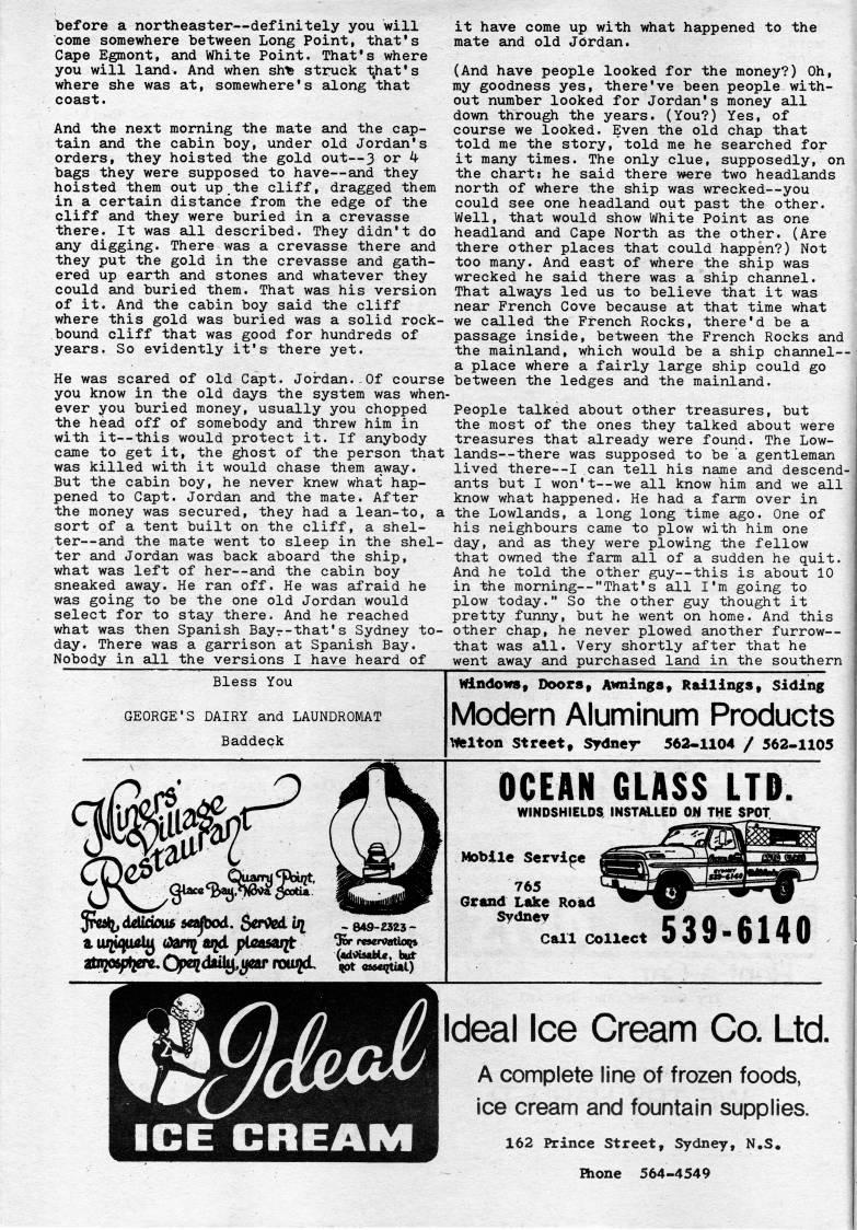 before a northeaster • definitely you will come somewhere between Long Point, that's Cape Egmont, and White Point. That's where you will land. And when sh' struck t,hat's where she was at, somewhere's along that coast. And the next morning the mate and the cap? tain and the cabin boy, under old Jordan's orders, they hoisted the gold out • 3 or ' bags they were supposed to have • and they hoisted them out up.the cliff, dragged them in a certain distance from the edge of the cliff and they were buried in a crevasse there. It was all described. They didn't do any digging. There was a crevasse there and they put the gold in the crevasse and gath? ered up earth and stones and whatever they could and buried them. That was his version of it. And the cabin boy said the cliff where this gold was buried was a solid rock- bound cliff that was good for hundreds of years. So evidently it's there yet. He was scared of old Capt. Jordan.-Of course you know in the old days the system was when? ever you buried money, usually you chopped the head off of somebody and threw him in with it • this would protect it. If anybody came to get it, the ghost of the person that was killed with it would chase them away. But the cabin boy, he never knew what hap? pened to Capt. Jordan and the mate. After the money was secured, they had a lean-to, a sort of a tent built on the cliff, a shel? ter • ??ind the mate went to sleep in the shel? ter and Jordan was back aboard the ship, what was left of her • and the cabin boy sneaked away. He ran off. He was afraid he was going to be the one old Jordan would select for to stay there. And he reached what was then Spanish Bayr-that's Sydney to? day. There was a garrison at Spanish Bay. Nobody in all the versions I haye heard of it have come up with what happened to the mate and old Jdrdgun. (And have people looked for the money?) Oh, my goodness yes, there've been people with? out number looked for Jordan's money all down through the years. (You?) Yes, of ' course we looked. Even the old chap that told me the story, told me he searched for it many times. The only clue, supposedly, on the charts he said there were two headlands north of where the ship was wrecked • you could see one headland out past the other. Well, that would show White Point as one headland and Cape North as the other. (Are there other places that could happen?) Not too many. And east of where the ship was wrecked he said there was a ship channel. 1 That always led us to believe that it was i near French Cove because at that time what ?? we caLIled the French Rocks, there'd be a passage inside, between the French Rocks and the mainland, which would be a ship channel-- a place where a fairly large ship could go between the ledges and the mainland. People talked about other treasures, but the most of the ones they talked about were treasures that already were found. The Low- lands--there was supposed to be a gentleman lived there--I can tell his name and descend? ants but I won't--we all know him and we all know what happened. He had a farm over in the Lowlands, a long long time ago. One of his neighbours came to plow with him one day, and as they were plowing the fellow that owned the fann all of a sudden he quit. And he told the other guy • this is about 10 in thie morning--"That's all I'm going to plow today." So the other guy thought it pretty funny, but he went on home. And this other chap, he never plowed another furrow • that was all. Very shortly after that he went away and purchased land in the southern Bless You GEORGE'S DAIRY and LAUNDROMAT Baddeck Windows* Doors9 Awnings* Railings, Siding Modern Aluminum Products welton Street, Sydner 562-1104 / 562-1105 OCEAN GLASS LTD. WINDSHIELDS INSTAlLED OH THE SPOT Jivd'ddidousdeafbod. S'i*''!*! > 849-2323- Mobile Service 765 Grand Lake Roisid Sydney Call Collect 539-6140 Ideal Ice Cream Co. Ltd. A complete line of frozen foods, ice cream and fountain supplies. 162 Prince Street, Sydney, N.S. Hione 564-4549