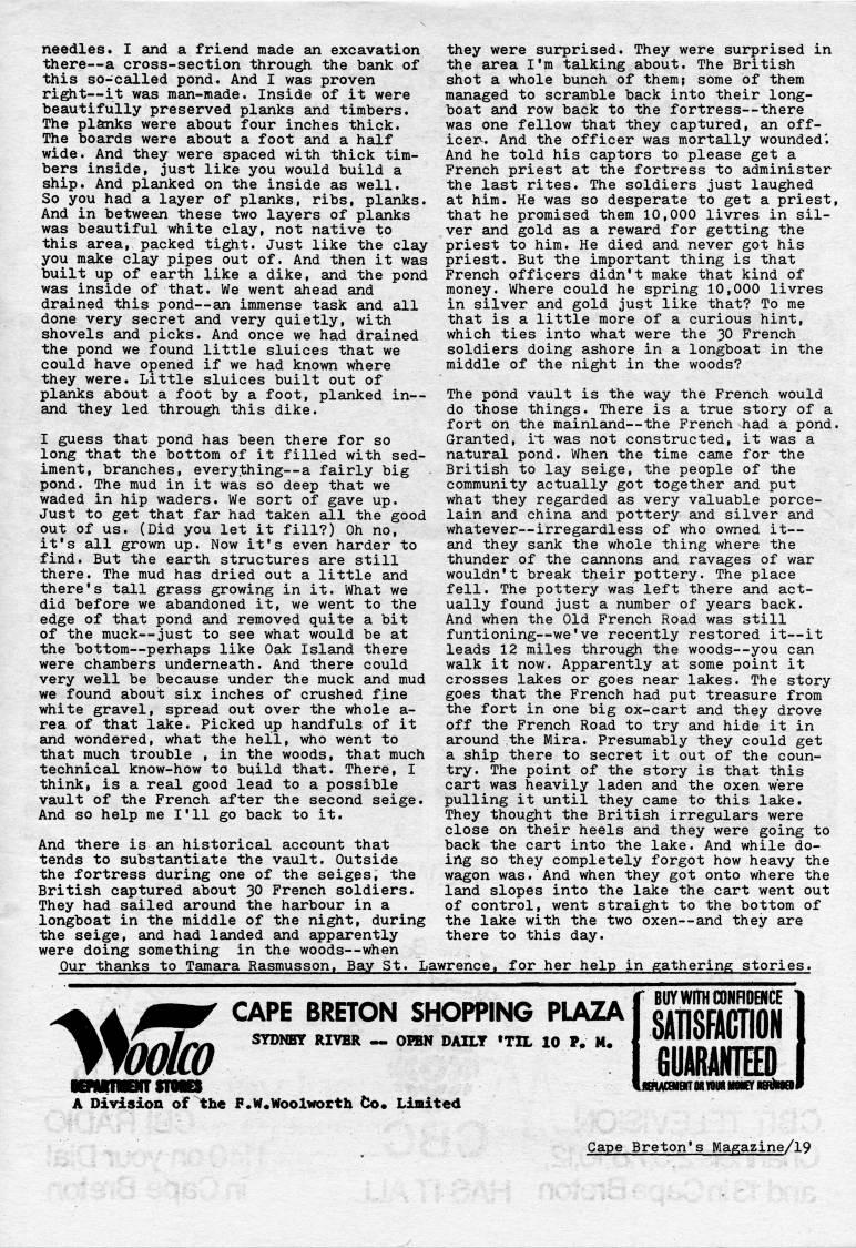 Published by Ronald Caplan on 1977/8/1 (651 reads)needles. I and a friend made an excavation there • a cross-section through the bank of this so-called pond. And I was proven right • it was man-made. Inside of it were beautifully preserved planks and timbers. The planks were about four inches thick. The boards were about a foot and a half wide. And they were spaced with thick tim? bers inside, just like you would build a ship. And planked on the inside as well. So you had a layer of planks, ribs, planks. And in between these two layers of planks was beautiful white clay, not native to this area, packed tight. Just like the clay you make clay pipes out of. And then it was built up of earth like a dike, and the pond was inside of that. We went ahead and drained this pond • an immense task and all done very secret and very quietly, with shovels and picks. And once we had drained the pond we found little sluices that we could have opened if we had known where they were. Little sluices built out of planks about a foot by a foot, planked in • and they led through this dike. I guess that pond has been there for so long that the bottom of it filled with sed? iment, branches, everything • a fairly big pond. The mud in it was so deep that we waded in hip waders. We sort of gave up. Just to get that far had taken all the good out of us. (Did you let it fill?) Oh no, it's all grown up. Now it's even harder to find. But the earth structures are still there. The mud has dried out a little and there's tall grass growing in it. What we did before we abandoned it, we went to the edge of that pond and removed quite a bit of the muck • just to see what would be at the bottom • perhaps like Oak Island there were chambers underneath. And there could very well be because under the muck and mud we found about six inches of crushed fine white gravel, spread out over the whole a- rea of that lake. Picked up handfuls of it and wondered, what the hell, who went to that much trouble , in the woods, that much technical know-how to build that. There, I think?? is a real good lead to a possible vault of the French after the second seige. And so help me I'll go back to it. And there is an historical account that tends to substantiate the vault. Outside the fortress during one of the seiges, the British captured about 30 French soldiers. They had sailed around the harbour in a longboat in the middle of the night, during the seige, and had landed and apparently were doing something in the woods • when they were surprised. They were surprised in the area I'm talking about. The British shot a whole bunch of them; some of thera managed to scramble back into their long? boat and row back to the fortress • there was one fellow that they captured, an off? icer. And the officer was mortally wounded'. And he told his captors to please get a French priest at the fortress to administer the last rites. The soldiers just laughed at him. He was so desperate to get a priest, that he promised them 10,000 livres in sil? ver and gold as a reward for getting the priest to him. He died and never got his priest. But the important thing is that French officers didn't make that kind of money. Where could he spring 10,000 livres in silver and gold just like that? To me that is a little more of a curious hint, which ties into what were the 30 French soldiers doing ashore in a longboat in the middle of the night in the woods? The pond vault is the way the French would do those things. There is a true story of a fort on the mainland • the French had a pond. Granted, rt was not constructed, it was a natural pond. When the time came for the British to lay seige, the people of the community actually got together and put what they regarded as very valuable porce? lain and china and pottery and silver and whatever • irregardless of who owned it • and they sank the whole thing where the thunder of the cannons and ravages of war wouldn't break their pottery. The place fell. The pottery was left there and act? ually found just a number of years back. And when the Old French Road was still funtioning • we've recently restored it • it leads 12 miles through the woods • you can walk it now. Apparently at some point it crosses lakes or goes near lakes. The story goes that the French had put treasure from the fort in one big ox-cart and they drove off the French Road to try and hide' it in around the Mira. Presumably they could get a ship there to secret it out of the coun? try. The point of the story is that this cart was heavily laden and the oxen were pulling it until they came to this lake. They thought the British irregulars were close on their heels and they were going to back the cart into the lake. And while do? ing so they completely forgot how heavy the wagon was. And when they got onto where the land slopes into the lake the cart went out of control, went straight to the bottom of the lake with the two oxen • and they are there to this day. Our thanks to Tamara Rasmusson. Bay St. Lawrence, for her help in gathering stories. CAPE BRETON SHOPPING PLAZA STDNBY RIVBR • OBBN DAILY 'TIL 10 P, N, HNftfUINr SfOSES A Division of the F.W.Woolworth Co. Limited BUYWITHCONRDBiCE SATISFACTiON . eUARilNTEED Cape Breton's Magazine/19