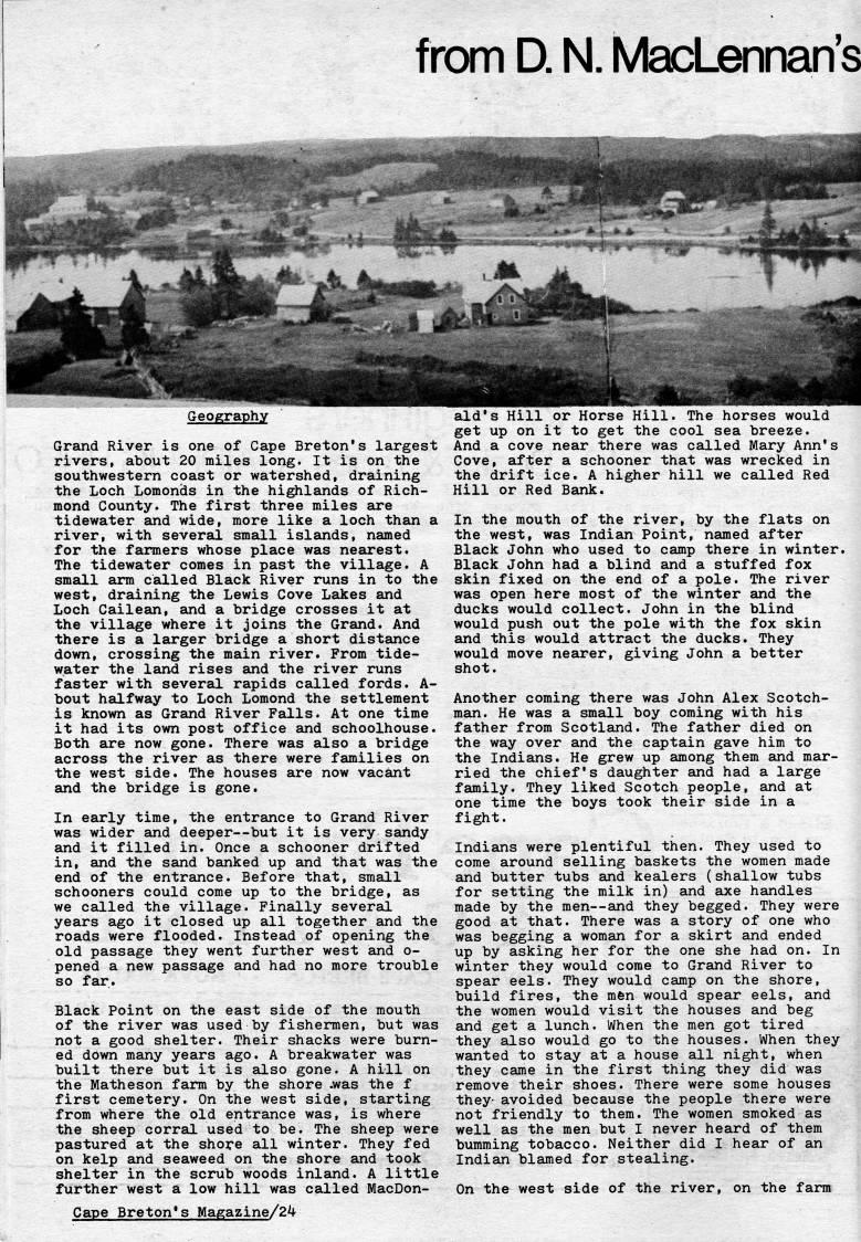 from D. N. MacLennan's Geography Grand River is one of Cape Breton's largest rivers, about 20 miles long. It is on the southwestern coast or watershed, draining the Loch Lomonds in the highlands of Rich? mond County. The first three miles are tidewater and wide, more like a loch than a river, with several small islands, named for the farmers whose place was nearest. The tidewater comes in past the village. A small arm called Black River runs in to the west, draining the Lewis Cove Lakes and Loch Cailean, and a bridge crosses it at the village where it joins the Grand. And there is a larger bridge a short distance down, crossing the main river. From tide? water the land rises and the river runs faster with several rapids called fords. A- bout halfway to Loch Lomond the settlement is known as Grand River Falls. At one time it had its own post office and schoolhouse. Both are now gone. There was also a bridge across the river as there were families on the west side. The houses are now vacant and the bridge is gone. In early time, the entrance to Grand River was wider and deeper • but it is very sandy and it filled in. Once a schooner drifted in, and the sand banked up and that was the end of the entrance. Before that, small schooners could come up to the bridge, as we called the village. Finally several years ago it closed up all together and the roads were flooded. Instead of opening the old passage they went further west and o- pened a new passage and had no more trouble so far. Black Point on the east side of the mouth of the river was used by fishermen, but was not a good shelter. Their shacks were burn? ed down many years ago. A breakwater was built there but it is also gone. A hill on the Matheson farm by the shore .was the f first cemetery. On the west side, starting from where the old entrance was, is where the sheep corral used to be. The sheep were pastured at the shore all winter. They fed on kelp and seaweed on the shore and took shelter in the scrub woods inland. A little further west a low hill was called MacDon? ald's Hill or Horse Hill. The horses would get up on it to get the cool sea breeze. And a cove near there was called Mary Ann's Cove, sLfter a schooner that was wrecked in the drift ice. A higher hill we called Red Hill or Red Bank. In the mouth of the river, by the flats on the west, was Indian Point, named after Black John who used to camp there in winter. Black John had a blind and a stuffed fox skin fixed on the end of a pole. The river was open here most of the winter and the ducks would collect. John in the blind would push out the pole with the fox skin and this would attract the ducks. They would move nearer, giving John a better shot. Another coming there was John Alex Scotch? man. He was a small boy coming with his father from Scotland. The father died on the way over and the captain gave him to the Indians. He grew up among them and mar? ried the chief's daughter and had a large family. They liked Scotch people, and at one time the boys took their side in a fight. Indians were plentiful then. They used to come around selling baskets the women made and butter tubs and kealers (shallow tubs for setting the milk in) and axe handles made by the men • and they begged. They were good at that. There was a story of one who was begging a woman for a skirt and ended up by asking her for the one she had on. In winter they would come to Grand River to spear eels. They would camp on the shore, build fires, the mfen would spear eels, and the women would visit the houses and beg and get a lunch. When the men got tired they also would go to the houses. When they wanted to stay at a house all night, when they came in the first thing they did was remove their shoes. There were some houses they- avoided because the people there were not friendly to them. The women smoked as well as the men but I never heard of them bumming tobacco. Neither did I hear of an Indian blamed for stealing. On the west side of the river, on the farm Cape Breton's Magazine/2'