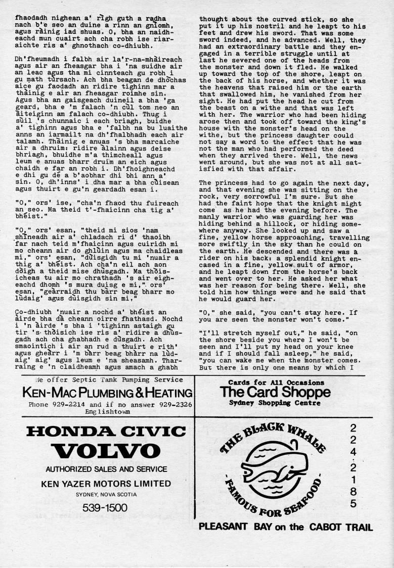 fhaodadh nighean a* righ guth a radha nach b'e seo an duine a rinn an gniomh, agus riiinig iad shuas. 0, bha an naidh? eachd mun cuairt ach cha robh ise riar? aichte ris a' ghnothach co-dhiubh. Dh'fheumadh i falbh air la'r-na-mhaireach agus air an fheasgar bha i 'na suidhe air an leac agus tha mi cinnteach gu robh i gu math tursach. Ach bha beagan de dhochas aice gu faodadh an ridire tighinn mar a thainig e air an fheasgar roimhe sin. Agus bha an gaisgeach duineil a bha 'ga geard, bha e 'm falach 'n cul tom neo an aiteiginn am falach co-dhiubh. Thug i suil *s chunnaic i each briagh, buidhe a* tighinn agus bha e 'falbh na bu luaithe anns an iarmailt na dh'fhalbhadh each air talamh. Thainig e sinu's 's bha marcaiche air a dhruim: ridire "alainn agus deise bhriagh, bhuidhe m'a thimcheall agus leum e anuas bharr druim an eich agus chaidh e far an robh i. Dh'fhoighneachd e dhi gu de a b'aobhar dhi bhi ann a' sin. 0, dh'inns' i dha mar a bha cTHisean agus thuirt e gu'n geardadh esan i. "0," ors' ise, "cha'n fhaod thu fuireach an seo. Ma theid t*-fhaicinn cha tig a' bheist." "0," ors' esan, "theid mi sios 'nam shineadh air a' chladach ri d' thaoibh far nach teid m'fhaicinn agus cuiridh mi mo cheann air do ghluin agus ma chaidleas mi," ors' esan, "duisgidh tu mi 'nuair a thig a' bheist. Ach cha'n eil ach aon d'igh a theid mise dhusgadh. Ma th"ois- icheas tu air mo chrathadh 's air eigh- eachd dhomh 's mura duisg e mi,", ors' esan, "gearraidh thu barr beag bharr mo ludaig* agus duisgidh sin mi," Co-dhiubh 'nuair a nochd a* bheist an airde bha da cheann oirre fhathasd. Nochd i 'n airde 's bha i 'tighinn astaigh ' tir 'S'thSisich ise ris a' ridire a dhus? gadh ach cha ghabhadh e dusgadh. Ach smaointich i air an rud a thuirt e rith' agus gheatrr i 'm b'rr beag bh'rr na lud? aig' aig' agus leum e 'na sheasamh. Thar? raing e 'n claidheamh agus amach a ghabh thought about the curved stick, so she put it up his nostril and he leapt to his feet and drew his sword. That was some sword indeed, and he advanced. Well, they had an extraordinary battle and they en? gaged in a terrible struggle until at last he severed one of the heads from the monster and down it fled. He walked up toward the to' of the shore, leapt on the back of his horse, and whether it was the heavens that raised him or the earth that swallowed him, he vanished from her sight. He had put the head he cut from the beast on a withe and that was left with her. The warrior who had been hiding arose then and took off toward the king's house with the monster's head on the withe, but the princess daughter could not say a word to the effect that he was not the man who had performed the deed when they arrived there. Well, the news went around, but she was not at all sat? isfied with that affair. The princess had to go again the next day, and that evening she was sitting on the rock, very sorrowful I'm sure. But she had the faint hope that the knight might come as he had the evening before. The manly warrior who was guarding her was hiding behind a hillock, or hiding some? where anyway. She looked up and saw a fine, yellow horse approaching, travelling more swiftly in the sky than he could on the earth. He descended and there was a rider on his back: a splendid knight en? cased in a fine, yellow suit of armor, and he leapt down from the horse's back and went over to her. He asked her what was her reason for being there. Well, she told him how things were and he said that he would guard her. "0," she said, "you can't stay here. If you are seen the monster won't come." "I'll stretch myself out," he said, "on the shore beside you where I won't be seen and I'll put my head on your knee and if I should fall asleep," he said, "you can wake me when the monster comes. But there is only one means by which I ,Je offer Septic Tank Pumping Service Ken-Mac Plumbing &Heating; Phone 929-2214 and if no answer 929-2326 Englishtoivn Cards for All Occasions The Card Shoppe Sydney Shopping Centre HOI'TDA. CIVIC VOIJVO AUTHORIZED SALES AND SERVICE KEN YAZER MOTORS LIMITED SYDNEY, NOVA SCOTIA 539-1500 .''"'l' 2 2 4 2 1 8 5 PLEASANT BAY on the CABOT TRAIL