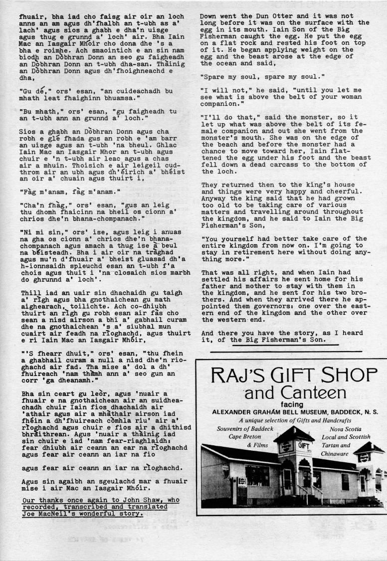 Published by Ronald Caplan on 1977/8/1 (324 reads)fhuair, bha iad cho faisg air oir an loch anns an am agus dh'fhalbh an t-ubh as a' lach* agus sios a ghabh e dha'n uisge agus thug e grunnd a' loch' air. Bha Iain Mac an lasgair Mh'oir cho dona dhe 's a bha e roimhe. Ach smaointich e an sin nam biod' an Dobhran Donn an seo gu faigheadh an Dobhran Donn an t-ubh dha-san. Thainig an Dobhran Donn agus dh'fhoighneachd e dha, "Gu de," ors* esan, "an cuideachadh bu mhath leat fhaighinn bhuamsa." "Bu mhath," ors' esan, "gu faigheadh tu an t-ubh ann an grunnd a* loch." Sios a ghabh an Dobhran Donn agus cha robh e gle fhada gus an robh e 'am barr an uisge agus an t-ubh 'na bheul. Ghlac Iain Mac an lasgair Mhor an t-ubh agus chuir e 'n t-ubh air leac agus a chas air a mhuin. Thoisich e air leigeil cud- throm air an ubh agus dh'eirich a' bhSist an oir a' chuain agus thuirt i, "Fag m'anam, fag m'anam." "Cha'n fhag," ors' esan, "gus an leig thu dhomh fhaicinn na bheil os cionn a' chrios dhe'n bhana-chompanach." "Ni mi sin," ors' ise, agus leig i anuas na 'a os cionn a' chrios dhe'n bhana- chompanach agus amach a thug ise a'beul na beisteadh. Bha i air oir na traghad agus mu'n d'fhuair a' bheist gluasad dh'a h-ionnsaidh spleuchd esan an t-ubh fa chois agus thuit i 'na closaich sios marbh do ghrunnd a* loch'. Thill iad an uair sin dhachaidh gu taigh a' righ agus bha gnothaichean gu math aighearach, toilichte. Ach co-dhiubh thuirt an righ gu robh esan air fas cho sean a nisd airson a bhi a' gabhail curam dhe na gnothaichean *s a' siubhal mun cuairt air feadh na rioghachd, agus thuirt e ri Iain Mac an lasgair Mhoir, "'S fhearr dhuit," ors' esan, "thu fhein a ghabhail curam a null a nisd dhe'n rio? ghachd air fad. Tha mise a* dol a dh' fhuireach 'nam thitmh ann a' seo gun an corr 'ga dheanamh." Bha sin ce8u:*t gu leor, agus 'nuair a fhuair e na gnothaichean air an suidhea- chadh chuir Iain fios dhachaidh air • athair agus air a mhathair airson iad fhiin a dh'fhuireach c'bmhla riu' air a* rioghachd agus chuir e fios air a dhithisd bhraithrean. Agus 'nuair a thainig iad sin chuir e iad 'nam fear-riaghlaidhi fear dhiubh air ceann an ear na rioghachd agus fear air ceann an iar na fio agus fear air ceann an iar na rioghachd. Agus sin agaibh an sgeulachd mar a fhuair mise i air Mac an lasgair Mhoir. Our thanks once a'ain to John Shaw?? who recorded, transcribed and translated Joe MacNeil's wonderful story??" Down went the Dun Otter and it was not long before it was on the surface with the egg in its mouth. Iain Son of the Big Fisherman caught the egg. He put the egg on a flat rock and rested his foot on top of it. He began applying weight on the egg and the beast arose at the edge of the ocean and said, "Spare my soul, spare my soul." "I will not," he said, "until you let me see what is above the belt of your womsui companion." "I'll do that," said the monster, so it let up what was above the belt of its fe? male companion and out she went from the monster's mouth. She was on the edge of the beach and before the monster had a chance to move toward her, Iain flat? tened the egg under his foot and the beast fell down a dead carcass to the bottom of the loch. They returned then to the king's house and things were very happy and cheerful. Anyway the king said that he had grown too old to be taking care of various matters and travelling around throughout the kingdom, and he said to Iain the Big Fisherman's Son, "You yourself had better take care of the entire kingdom from now on. I'm going to stay in retirement here without doing any? thing more." That was all right, and when Iain had settled his affairs he sent home for his father and mother to stay with them in the kingdom, and he sent for his two bro? thers. And when they arrived there he ap? pointed them governors: one over the east- em end of the kingdom and the other over the western end. And there you have the story, as I heard it, of the Big Fisherman's Son, RAJ'S GIFT SHOP and Canteen facing ALEXANDER GRAHAM BELL MUSEUM, BADDECK, N. S. A unique selection of Gifts and Handcrafts Souvenirs of Baddeck ''rfW' Nova Scotia Cape Breton ''''HRBIk Local and Scottish Tartan and Chinaware