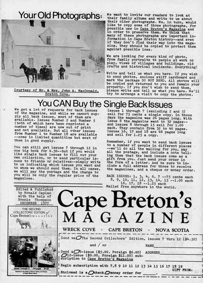 Published by Ronald Caplan on 1977/12/1 (432 reads)Your Old Photographs: ??, ': Mm t Ills ill ": 81 Courtesy of Mr. & Mrs. John A. MacDonald. Breton Cove. We want to invite our readers to look at their family albums and write to us about their older photographs. We, in turn, would like to copy some of those photographs, for possible use in Cape Breton's Magazine and in order to preserve them. We think that many of these photographs are important in? formation in Cape Breton history • and even if they don't find their way into the maga? zine, they should be copied to protect them against possible loss. i j We are looking for every kind of photo, 1' from family portraits to people at work or *l' play, views of villages and buildings, old il crafts and historical incidents. Everything! ' Write and tell us what you have. If you wish to send photos, enclose stiff cardboard and mark the package DO NOT BEND. All photos will be copied and returned to you and remain your property. If you don't wish to send them, please write and tell us what you have. We'll try to arrange a visit to copy the photos. You CAN Buy the Single Back Issues We get a lot of requests for back issues of the magazine, and while we cannot sup? ply all back issues, most of them are available. Issues Number 2 and Number 5 (both of which have been reprinted a number of times) are now out of print and not available. But all other issues from Number 1 to Number 18 are available • some in limited quantities but most of them in good supply. You can still get issues 7 through 12 in one big book for 4.50 • but if you would like single back issues to fill out your own collection, or to send particular is? sues to friends or relatives • simply write to us indicating which issues you want and to whom we should send them. In all cases, we will pay the postage and the charge to you will be only the regular price of the magazines. Edited & Published by Ronald Caplan with the help of Bonnie Thompson DECEMBER 1977 Issues 1 through 7 (excluding 2 and 5) sell for 75 cents a single copy. In those days the magazine was 2k pages long. With issue 8 the magazine went to 32 pages • and issues 8 through 15 sell for 1.00 each. They contain from 32 to kO pages. Issues 16, 17 and 18 sure 48 pages long and sell for 1.25 a copy. Remember, if you want to send back issues to a number of people in different places • we'll do all the mailing for you, pay all the postage, and include a note tell? ing them that the back issues come as a gift from you. Just send your order in the form of a letter. And be sure to in? clude a full address for those to receive the magazines, and a cheque or money order. BACK ISSUES: 1, 3?? 4, 6, 7 --75 cents each 8, 9, 10, 11, 12, 13, 14, 15 • 1.00 each 16, 17, 18 • 1.25 each Mailed free anywhere in the world. THE SECOND COLLECTORS' EDITION ' Cape Breton's m a Cr a z i n e Cape Breton's tsaue? 7 through 12 -216 pages - $4.50 OMOted to the History. Natural HWofy and ??=utoce ot Cape BrMon Island MAGAZINE WRECK COVE CAPE BRETON NOVA SCOTIA r Send me''The Second Collectors' Edition, issues 7 thru 12 ($4.50) n and / or NAME I Send aC76-issue ($5.00. Foreign $6.00) ADDRESS ' '12-issue ($9.00, Foreign $11.00) sub? scription to Cape Breton's Magazine 1 Begin subscription with 7.8 9 10 11 12 13 14 15 16 17 18 19 ' I GIFT PROM* I I Enclosed is a/Ocheck 'money order for . 1