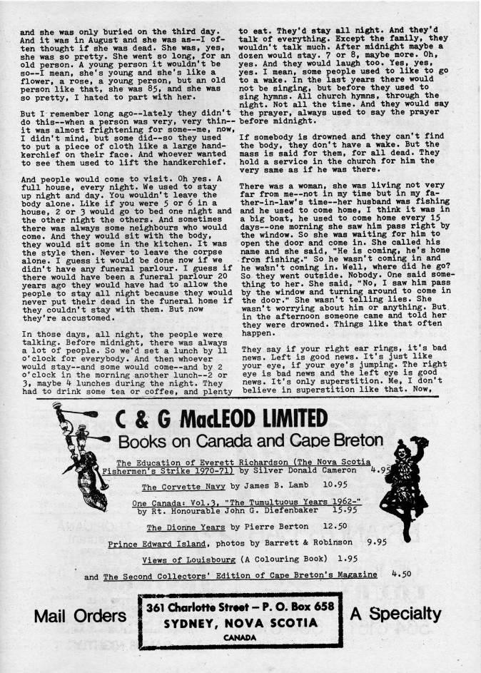 Published by Ronald Caplan on 1977/12/1 (516 reads)and she was only buried on the third day. And it was in August and she was as • I of? ten thought if she was dead. She was, yes, she was so pretty. She went so long, for an old person. A young person it wouldn't be so • I mean, she's young and she's like a flower, a rose, a young person, but an old person like that, she was 85, and she was so pretty, I hated to part with her. But I remember long ago • lately they didn't do this • when a person was very, very thin • it was almost frightening for some • me, now, I didn't mind, but some did • so they used to put a piece of cloth like a large hand? kerchief on their face. And whoever wanted to see them used to lift the handkerchief. And people would come to visit. Oh yes. A full house, every night. We used to stay up night and day. You wouldn't leave the body alone. Like if you were 5 or 6 in a house, 2 or 3 would go to bed one night and the other night the others. And sometimes there was always some neighbours who would come. And they would sit with the body, they would sit some in the kitchen. It was the style then. Never to leave the corpse alone. I guess it would be done now if we didn't have any funeral parlour. I guess if there would have been a funeral parlour 20 years ago they would have had to allow the people to stay all night because they would never put their dead in the funeral home if they couldn't stay with them. But now they're accustomed. In those days, all night, the people were talking. Before midnight, there was always a lot of people. So we'd set a lunch by 11 o'clock for everybody. And then whoever would stay • and some would come • and by 2 o'clock in the morning another lunch • 2 or 3, maybe 4 lunches during the night. They had to drink some tea or coffee, and plenty to eat. They'd stay all night. And they'd talk of everything. Except the family, they wouldn't talk much. After midnight maybe a dozen would stay. 7 or 8, maybe more. Oh, yes. And they would laugh too. Yes, yes, yes. I mean, some people used to like to go to a wake. In the last years there would not be singing, but before they used to sing hymns. All church hymns, through the night. Not all the time. And they would say the prayer, always used to say the prayer before midnight. If somebody is drowned and they can't find the body, they don't have a wake. But the mass is said for them, for all dead. They hold a service in the church for him the very same as if he was there. There was a woman, she was living not very far from me • not in my time but in my fa? ther-in-law's time • her husband was fishing and he used to come home, I think it was in a big boat, he used to come home every 15 days • one morning she saw him pass right by the window. So she was waiting for him to open the door and come in. She called his name and she said, "He is coming, he's home from fishing." So he wasn't coming in and he wa'sn't coming in. Well, where did he go? So they went outside. Nobody. One said some? thing to her. She said, "No, I saw him pass by the window and turning aroxind to come in the door." She wasn't telling lies. She wasn't worrying about him or anything. But, in the afternoon someone came and told her they were drowned. Things like that often happen. They say if your right ear rings, it's bad news. Left is good news. It's just like your eye, if your eye's jumping. The right eye is bad news and the left eye is good news. It's only superstition. Me, I don't believe in superstition like that. Now, C & G MadEOD LIMITED Books on Canada and Caoe Breton The Education of Everett Richardson (The Nova Scotia Fishermen's Strike 1970-71) by Silver Donald Cameron 4. The Corvette Navy by James B. Lamb 10.95 One Canada: Vol.3. "The Tumultuous Years 1962-" by Rt. Honourable John G. Diefenbaker 15-95 The Dionne Years by Pierre Berton 12.50 Prince Edward Island, photos by Barrett & Robinson 9.95 Views of Louisbourg (A Colouring Book) 1.95 and The Second Collectors' Edition of Cape Breton's Magazine 4.50 Mail Orders 361 Charlotte Street - P. O. Box 658 SYDNEY, NOVA SCOTIA CANADA A Specialty