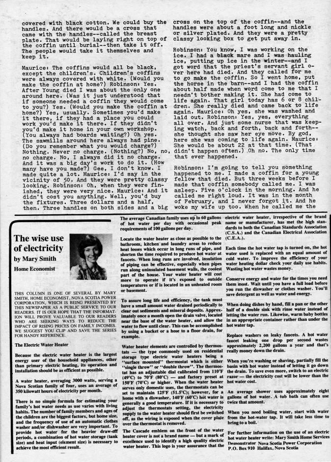 Published by Ronald Caplan on 1977/12/1 (395 reads)covered with black cotton. We could buy the handles. And there would be a cross that came with the handles • called the breast plate. That would be laying right on top of the coffin until burial • then take it off. The people would take it themselves and keep it. Maurices The coffins would all be black, except the children's. Children's coffins were always covered with white. (Would you make the coffin at home?) Robinsons Yes. After Young died I was about the only one around here. (Was it just understood that if someone needed a coffin they would come to you?) Yes. (Would you make the coffin at home?) Yes, usually. Sometimes you'd make it there, if they had a place you could work you'd make it there. If they didn't you'd make it home in your own workshop. (You always had boards waiting?) Oh yes. The sawmills around here always had pine. (Do you remember what you would charge?) Nothing. Never no charge. (Nothing?) No, no, no charge. No, I always did it no charge. And it was a big day's work to do it. (How many have you made?) Gee, I don't know. I made quite a lot. Maurice: I'd say in the vicinity of 50. And they were pretty classy looking. Robinson: Oh, when they were fin? ished, they were very nice. Maurice: And it didn't cost you anything. Well, you'd buy the fixtures. Three dollars and a half, then. Three handles on both sides and a big cross on the top of the coffin • and the handles were about a foot long and nickle or silver plated. And they were a pretty classy looking box to get put away in. Robinson: You knoyr, I was working on the ice. I had a black mare and I was hauling ice, putting up ice in the winter • and I got word that the priest's servant girl o- ver here had died. And they called for me to go make the coffin. So I went home, put the horse in the barn • and I had the coffin about half made when word come to me that I needn't bother making it. She had come to life again. That girl today has 6 or 8 chil? dren. She really died and came back to life again. Maurice: Oh yes, she was washed and laid out. Robinson: Yes, yes, everything all over. And just some nurse that was keep? ing watch, back and forth, back and forth • she thought she saw her eye move. By god, here she was coming to life again. Maurice: She would be about 22 at that time. (That didn't happen often.) ,0h no. The only time that ever happened. Robinson: I'm going to tell you something happened to me. I made a coffin for a young fellow that died. But three weeks before I made that coffin somebody called me. I was asleep. Five o'clock in the morning. And he called me right loud. It was in the month of February, and I never forgot it. And he woke my wife up too. When he called me the The wise use of electricity by Mary Smith Home Economist THIS COLUMN IS ONE OF SEVERAL BY MARY SMITH, HOME ECONOMIST, NOVA SCOTIA POWER CORPORATION, WHICH IS BEING PRESENTED BY THIS NEWSPAPER AS A PUBLIC SERVICE TO OUR READERS. IT IS OUR HOPE THAT THE INFORMAT? ION WILL PROVE VALUABLE TO OUR READERS WHO ARE SEEKING WAYS TO REDUCE THE IMPACT OF RISING PRICES ON FAMILY INCOMES. WE SUGGEST YOU CLIP AND SAVE THE SERIES FOR HANDY REFERENCE. The Electric Water Heater Because the electric water heater is the largest energy user of the household appliances, other than primary electric heating, its operation and installation should be as efficient as possible. A water heater, averaging 3000 watts, serving a Nova Scotian family of four, uses an average of 350 kilowatt hours of electricity per month. There is no simple formula for estimating your family's hot water needs as use varies with living habits. The number of family members and ages of the children are the biggest factors, but home size, and the frequency of use of an automatic clothes washer and/or dishwasher are very important. To provide hot water for the heavier draw-dff periods, a combination of hot water storage (tank size) and heat input (element size) is necessary to achieve the most efficient result. The average Canadian family uses up to 60 gallons of hot water per day with occasional peak requirements of 100 gallons per day. Locate the water heater as close as possible to the bathroom, kitchen and laundry areas to reduce heat losses which occur in long runs of pipe, and shorten the time required to produce hot water at faucets. When long runs are involved, insulation of piping can be effective, especially when pipes run along uninsulated basement walls, the coolest part of the house. Your water heater will cost more to operate if it's exposed to outside temperatures or if is located in an unheated room or basement. To assure long life and efficiency, the tank must have a small amount water drained periodically to clear out sediments and mineral deposits. Approx? imately once a month open the drain valve, located near the base of the water heater, and allow the water to flow until clear. This can be accomplished by using a bucket or a hose to a floor drain, for example. Water heater elements are controlled by thermos? tats • the type commonly used on residential storage type electric water heaters iieing a * 'surface mounted" thermostat which is either "single throw" or "double throw". The thermos? tat has an adjustable dial calibrated from 110?F (49?C) to 70?F (80?C) • and factory preset at 150?F (70?C) or higher. When the water heater serves only domestic uses, the thermostats can be set to maintain 125?F (51.5?C); however, for a home with a diswasher, 140?F (60?C) hot water is generally a good temperature. If it is necessary to adjust the thermostats setting, the electricity supply to the water heater should first be switched off, as the wiring is exposed when the cover plate over the thermostat is removed. The Cascade emblem on the front of the water heater cover is not a brand name • but a mark of excellence used to identify a high quality electric water heater. This logo is your assurance that the elec