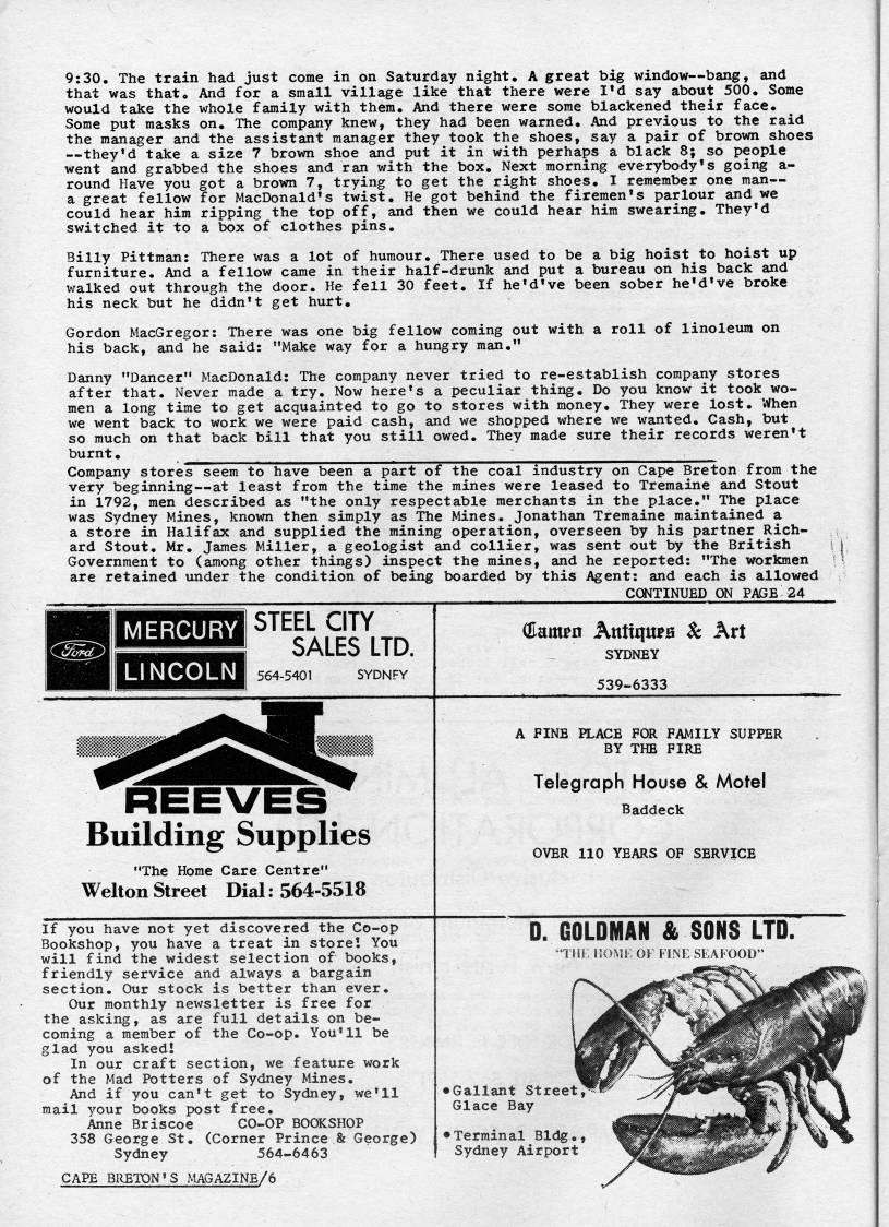 Published by Ronald Caplan on 1973/3/1 (1190 reads)9:30. The train had just come in on Saturday night. A great big window • bang, and that was that. And for a small village like that there were I'd say about 500. Some would take the whole family with them. And there were some blackened their face. Some put masks on. The company knew, they had been warned. And previous to the raid the manager and the assistant manager they took the shoes, say a pair of brown shoes • they'd take a size 7 brown shoe and put it in with perhaps a black 8; so people went and grabbed the shoes and ran with the box. Next morning everybody's going a- round Have you got a brown 7, trying to get the right shoes. I remember one man • a great fellow for MacDonald's twist. He got behind the firemen's parlour and we could hear him ripping the top off, and then we could hear him swearing. They'd switched it to a box of clothes pins, Billy Pittman: There was a lot of humour. There used to be a big hoist to hoist up furniture. And a fellow came in their half-drunk and put a bureau on his back and walked out through the door. He fell 30 feet. If he'd??ve been sober he'd've broke his neck but he didn't get hurt. Gordon MacGregor: There was one big fellow coming out with a roll of linoleiim on his back, and he said: "Make way for a hungry man." Danny "Dancer" MacDonald: The company never tried to re-establish company stores after that. Never made a try. Now here's a peculiar thing. Do you know it took wo? men a long time to get acquainted to go to stores with money. They were lost. When we went back to work we were paid cash, and we shopped where we wanted. Cash, but so much on that back bill that you still owed. They made sure their records weren't burnt. ' Company stores seem to have been a part of the coal industry on Cape Breton from the very beginning • at least from the time the mines were leased to Tremaine and Stout in 1792, men described as "the only respectable merchants in the place." The place was Sydney Mines, known then simply as The Mines. Jonathan Tremaine maintained a a store in Halifax and supplied the mining operation, overseen by his partner Rich? ard Stout. Mr. James Miller, a geologist and collier, was sent out by the British Government to (among other things) inspect the mines, and he reported: "The workmen are retained under the condition of being boarded by this Agent: and each is allowed C(??JTINUED ON PAGE 24 MERCURY LINCOLN STEEL CITY SALES LTD. ffiam'n Auttqufa & Art SYDNEY 539-6333 Building Supplies "The Home Care Centre" Welton Street Dial: 564-5518 A FINE PLACE FOR FAMILY SUPPER BY THE FIRE Telegraph House & Motel Baddeck OVER 110 YEARS OF SERVICE If you have not yet discovered the Co-op Bookshop, you have a treat in storel You will find the widest selection of books, friendly service and always a bargain section. Our stock is better than ever. Our monthly newsletter is free for the asking, as are full details on be? coming a member of the Co-op. You'll be glad you askedI In our craft section, we feature work of the Mad Potters of Sydney Mines, And if you can't get to Sydney, we'll mail your books post free. Anne Briscoe CO-OP BOOKSHOP 358 George St, (Corner Prince & George) Sydney 564-6463 CAPE BRETON'S MAGAZINE/6 D. GOLDMAN & SONS LTD. "iH) KoMf ()} hm:si,afood" • Gallant Street Glace Bay • Terminal Bldg,, Sydney Airport