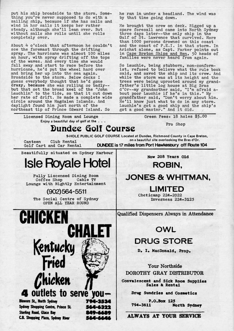 put his ship broadside to the storm. Some? thing you're never supposed to do with a sailing ship, because if she has sails and wind in her sails it keeps her rather steady, although she'll lean over. But without sails she rolls until she rolls completely over. About 4 o'clock that afternoon he couldn't see the foremast through the drifting spray. The hurricane was almost 100 miles an hour, with spray drifting off the tops of the waves. And every time she would fall away and start to race before the hurricane, he'd put the wheel hard over and bring her up into the sea again. Broadside to the storm. Below decks I guess everybody thought that he'd gone crazy, because she was rolling so badly • but that set the broad keel of the "John Lauchlin" to the tide, so that it cut down her rate of drift. He made a complete wide circle around the Magdalen Islands. And daylight found him just north of the northeast tip of Prince Edward Island. So he ran in under a headland. The wind was by that time going down. He brought the crew on deck. Rigged up a spare foresail and came into North Sydney three days later • the only ship in the Gulf of St. Lawrence that survived. More than 1000 persons drowned on this coast and the coast of P.E.I, in that storm. In Arichat alone, as Capt. Parker points out in Cape Breton Ships and Men, 50 heads of families v/ere never heard from again. So Lauchie, being stubborn, non-conform? ist, refused to believe what the rule book said, and saved the ship and its crew. And while the storm was at its height and the trees were being uprooted around my grand? father's little log house at Big Bras d'Or • my grandmother said, "I'm afraid a- bout poor Lauchie if he's in this." My grandfather said, "Don't worry about him. He'll know just what to do in any storm. Lauchie's got a good ship and the ship's got a good master." And it did. Licensed Dining Room and Lounge Enjoy a beautiful day of golf at the . Dundee Qol! Course Green Fees: 18 holes $5.00 Pro Shop 9-HOLE PUBLIC GOLF COURSE Located at Dundee, Richmond County in Cape Breton, Canteen Club Rental Golf Cart and Car Rental on a beautiful site overlooking the Bras d'Or. IXMDEE is 17 miles from Port HawkesDury off Route 104 Beautifully situated on Sydney Harbour Isle Royale Hotel Fully Liscensed Dining Room Coffee Shop Cable TV Lounge with Nightly Entertainment (902)564-5511 The Social Centre of Sydney OPEN ALL YEAR ROUND Now 208 Years Old ROBIN, JONES 8c WHITMAN, LIMITED Cheticamp 224-2022 Inverness 224-3125 CHICKEN CHALET frfed 4 outlets to serve'you- Bioweis st. North Sydney Sydney Shopping Centre, Prince St Sterltnf Road, Glace Bay CB. Shopping Plaza, 'ney River 7M-3S34 5M-6322 849-MM Qualified Dispensers Always in Attendance OWL DRUG STORE D* I* MacDonald, Prop. Your Northside DOROTHY GRAY DISTRIBUTOR Convalescent and Sick Room Supplies Sales & Rental Drug Sundries and Cosnetics P.O.Box 125 794.3611 North Sydney ALWAYS AT YOUR SERVICE
