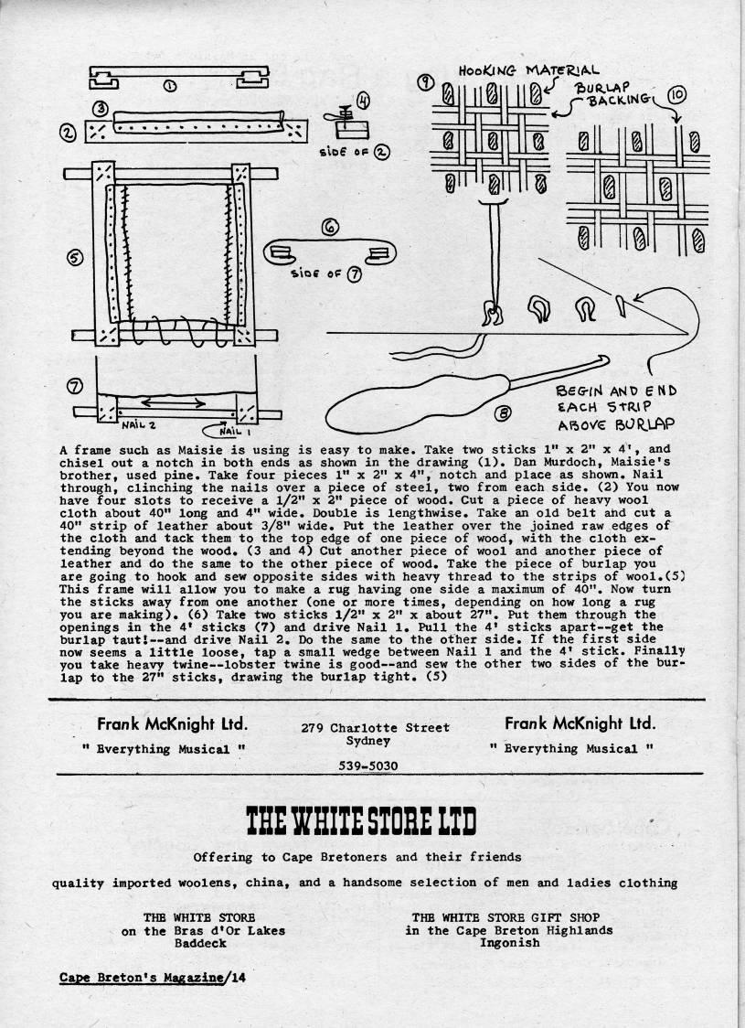 Published by Ronald Caplan on 1973/3/1 (977 reads)IF=D WW p'BAC.K.lN'V.J' I B ' "' EACH StWF M?>OV • ftOR'lAP A frame such as Maisie is using is easy to make. Take two sticks 1" x 2" x 4', and chisel out a notch in both ends as shown in the drawing (1), Dan Murdoch, Maisie's brother, used pine. Take four pieces 1" x 2" x 4", notch and place as shown. Nail through, clinching the nails over a piece of steel, two from each side. (2) You now have four slots to receive a 1/2" x 2" piece of wood. Cut a piece of heavy wool cloth about 40" long and 4" wide. Double is lengthwise. Take an old belt ahd cut a 40" strip of leather about 3/8" wide. Put the leather over the joined raw edges of the cloth and tack them to the top edge of one piece of wood, with the cloth ex? tending beyond the wood. (3 and 4) Cut another piece of wool and another piece of leather and do the same to the other piece of wood. Take the piece of burlap you are going to hook and sew opposite sides with heavy thread to the strips of wool.(53 This frame will allow you to make a rug having one side a maximum of 40", Now turn the sticks away from one another (one or more times, depending on how long a rug you are making). (6) Take two sticks 1/2" x 2" x about 27". Put them through the openings in the 4?? sticks (7) and drive Nail 1. Pull the 4' sticks apart • get the burlap taut! • and drive Nail 2. Do the same to the other side. If the first side now seems a little loose, tap a small wedge between Nail 1 and the 4' stick. Finally you take heavy twine • lobster twine is good • and sew the other two sides of the bur? lap to the 27" sticks, drawing the burlap tight. (5) Frank McKnight Ltd. Everything Musical " 279 Charlotte Street Sydney 539-5030 Frank McKnight Ltd. Everything Musical " lEEWHIIESIOBELID Offering to Cape Bretoners and their friends quality imported woolens, china, and a handsome selection of men and ladies clothing THE WHITE STORE on the Bras d'Or Lakes Baddeck THE WHITE STORE GIFT SHOP in the Cape Breton Highlands Ingonish Cape Breton's Magazine/14
