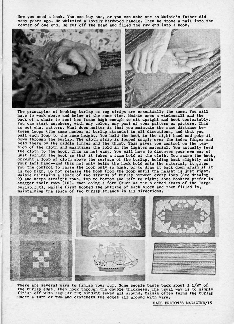 Published by Ronald Caplan on 1973/3/1 (817 reads)Now you need a hook. You can buy one, or you can make one as Maisie's father did many years ago. He whittled a lovely hardwood handle. Then he drove a nail into the center of one end. He cut off the head and filed the raw end into a hook. The principles of hooking burlap or rag strips are essentially the same* You will have to work above and below at the same time. Maisie uses a windowsill and the back of a chair to rest her frame high enough to sit upright and hook comfortably. You can start anywhere, with any color, any part of your pattern or picture. This is not what matters. What does matter is that you maintain the same distance be? tween loops (the same number of burlap strands) in all directions, and that you pull each loop to the same height. You hold the hook in the right hand and poke it down through the burlap. The cloth strip is looped snugly over the index finger and held there by the middle finger and the thumb. This gives you control on the ten? sion of the cloth and maintains the fold in the lighter material. You actually feed the cloth to the hook. This is not easy. You will have to discover your own way of just turning the hook so that it takes a firm hold of the cloth. You raise the hook, drawing a loop of cloth above the surface of the burlap, holding back slightly with your left hand • and this not only helps the hook hold onto the material, it gives you the control to raise the loop only so high, or to draw it back down again if it is too high. Do not release the hook from the loop until the height is just ri'ht, Maisie maintains a space of two strands of burlap between every loop (See drawing 9) and keeps straight rows, top to bottom and left to right; some hookers prefer to stagger their rows (10). When doing a form (such as the blocked stars of the large burlap rug), Maisie first hooked the outline of each block and then filled in, maintaining the space of two burlap strands in all directions. I-? =' 13 There are several ways to finish your rug. Some people baste back about 1 1/2" of the burlap edge, then hook through the double thickness. The usual way is to simply finish off with regular rug binding sewed all around, Maisie often turns the burlap under a turn or two and crotchets the edges all around with yarn. CAPE BRETON'S MAGAZINE/15