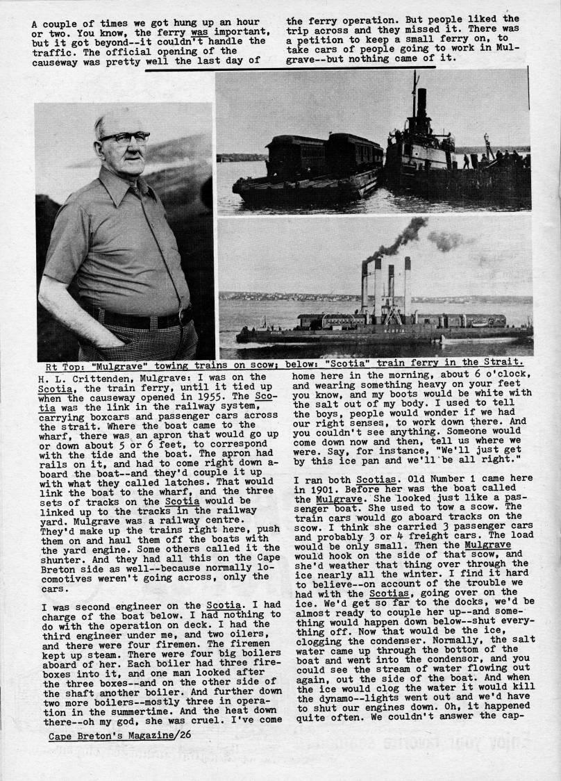 Published by Ronald Caplan on 1978/8/1 (527 reads)A couple of times we got hung up an hour or two. You know, the ferry was important, but it got beyond • it couldn't handle the traffic. The official opening of the causeway was pretty well the last day of the ferry operation. But people liked the trip across and they missed it. There was a petition to keep a small ferry on, to take cars of people going to work in Mul? grave • but nothing came of it. Rt Top; "Mulgrave" towing trains on scow; belowt "Scotia" train ferry in the Strait. H. L. Crittenden* Mulgrave: I was on the Scotia, the train ferry, until it tied up when the causeway opened in 1955 • The Sco? tia was the link in the railway system, carrying boxcars and passenger cars across the strait. Where the boat came to the wharf, there was an apron that would go up or down about 5 or 6 feet, to correspond with the tide and the boat. The apron had rails on it, and had to come right down a- board the boat • and they'd couple it up with what they called latches. That would link the boat to the wharf, and the three sets of tracks on the Scotia would be linked up to the tracks in the railway yard. Mulgrave was a railway centre. They'd make up the trains right here, push them on and haul them off the boats with the yard engine. Some others called it the shiinter. And they had all this on the Cape Breton side as well • because normally lo? comotives weren't going across, only the cars. I was second engineer on the Scotia. I had charge of the boat below. I had nothing to do with the operation on deck. I had the third engineer under me, and two oilers, and there were four firemen. The firemen kept up steam. There were four big boilers aboard of her. Each boiler had three fire? boxes into it, and one man looked after the three boxes • and on the other side of the shaft another boiler. And further down two more boilers • mostly three in opera? tion in the summertime. And the heat down there • oh my god, she was cruel. I've come Cape Breton's Magazine/26 home here in the morning, about 6 o'clock, and wearing something heavy on your feet you know, and my boots would be white with the salt out of my body. I used to tell the boys, people would wonder if we had our right senses, to work down there. And you couldn't see anything. Someone would come down now and then, tell us where we were. Say, for instance, "We'll just get by this ice pan and we'11"be all right." I ran both Scotias. Old Number 1 came here in 1901. Before her was the boat called the Mulgrave. She looked just like a pas? senger boat. She used to tow a scow. The train cars would go aboard tracks on the scow. I think she carried 3 passenger cars and probably 3 or 4 freight cars. The load would be only small. Then the Mulgrave would hook on the side of that scow, and she'd weather that thing over through the ice nearly all the winter. I find it hard to believe • on account of the trouble we had with the Scotias, going over on the ice. We'd get so far to the docks, we'd be almost ready to couple her up • and some? thing would happen down below • shut every? thing off. Now that would be the ice, clogging the condenser. Normally, the salt water came up through the bottom of the boat and went into the condenser, and you could see the stream of water flowing out again, out the side of the boat. And when the ice would clog the water it would kill the dynamo • lights went out and we'd have to shut our engines down. Oh, it happened quite often. We couldn't answer the cap-