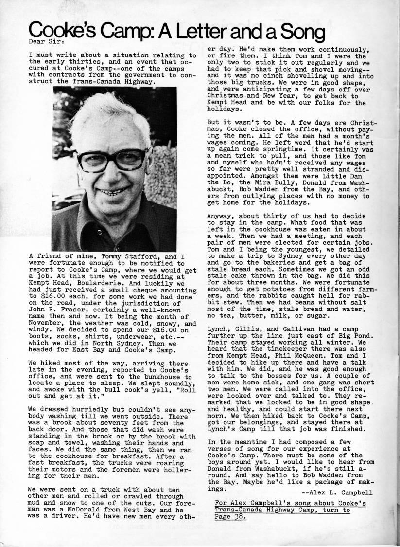 Published by Ronald Caplan on 1978/12/1 (597 reads)Cooke's Camp: A Letter and a Song Dear Sir: ?? '' I must write about a situation relating to the early thirties, and an event that oc- cured at Cooke's Camp-?-one of the camps with contracts from the government to con? struct the Trans-Canada Highway. A friend of mine. Tommy Stafford, and I were fortunate enough to be notified to report to Cooke's Camp, where we would get a job. At this time we were residing at Kempt Head, Boularderie. And luckily we had just received a small cheque amounting to $16.00 each, for some work we had done on the road, under the jurisdiction of John R. Fraser, certainly a well-known name then and now. It being the month of November, the weather was cold, snowy, and windy. We decided to spend our $16.00 on boots, socks, shirts, underwear, etc. • which we did in North Sydney. Then we headed for East Bay and Cooke's Camp. We hiked most of the way, arriving there late in the evening, reported to Cooke's office, and were sent to the bimkhouse to locate a place to sleep. We slept soundly, and awoke with the bull cook's yell, "Roll out and get at it." We dressed hurriedly but couldn't see any? body washing till we went outside. There was a brook about seventy feet from the back door. And those that did wash were standing in the brook or by the brook with soap and towel, washing their hands and faces. We did the same thing, then we ran to the cookhouse for breakfast. After a fast breakfast, the trucks were roaring their motors and the foremen were holler? ing for their men. We were sent on a truck with about ten other men and rolled or crawled through mud and snow to one of the cuts. Our fore? man was a McDonald from West Bay and he was a driver. He'd have new men every oth? er day. He'd make them work continuously, or fire them. I think Tom and I were the only two to stick it out regularly and we had to keep that pick and shovel moving • and it was no cinch shovelling up and into those big trucks. We were in good shape, and were anticipating a few days off over Christmas and New Year, to get back to Kempt Head and be with our folks for the holidays. But it wasn't to be. A few days ere Christ? mas, Cooke closed the office, without pay? ing the men. All of the men had a month's wages coming. He left word that he'd start up again come springtime. It certainly was a mean trick to pull, and those like Tom and myself who hadn't received any wages so far were pretty well stranded and dis? appointed. Amongst them were Little Dan the Bo, the Mira Bully, Donald from Wash? abuckt, Bob Wadden from the Bay, and oth? ers from outlying places with no money to get home for the holidays. Anyway, about thirty of us had to decide to stay in the camp. What food that was left in the cookhouse was eaten in about a week. Then we had a meeting, and each pair of men were elected for certain jobs. Tom and I being the youngest, we detailed to make a trip to Sydney every other day and go to the bakeries and get a bag of stale bread each. Sometimes we got an odd stale cake thrown in the bag. We did this for about three months. We were fortunate enough to get potatoes from different farm? ers, and the rabbits caught hell for rab? bit stew. Then we had beans without salt most of the time, stale bread and water, no tea, butter, milk, or sugar. Lynch, Gillis, and Gallivan had a camp further up the line just east of Big Pond. Their camp stayed working all winter. We heard that the timekeeper there was also from Kempt Head, Phil McQueen. Tom and I decided to hike up there and have a talk with him. We did, and he was good enough to talk to the bosses for us. A couple of men were home sick, and one gang was short two men. We were called into the office, were looked over and talked to. They re? marked that we looked to be in good shape and healthy, and could start there next morn. We then hiked back to Cooke's Camp, got our belongings, and stayed there at Lynch's Camp till that job was finished. In the meantime I had composed a few verses of song for our experience at Cooke's Camp. There must be some of the boys around yet. I would like to hear from Donald from Washabuckt, if he's still a- round. And say hello to Bob Wadden from the Bay. Maybe he'd like a package of mak- '"''* • Alex L. Campbell For Alex Campbell's song about Cooke's Trans-Canada Highway Camp, turn to Page 38.