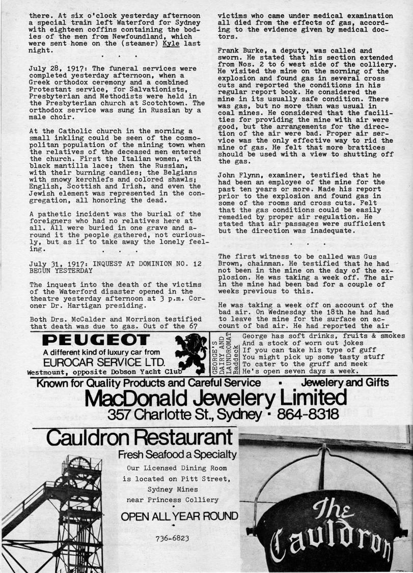 Published by Ronald Caplan on 1978/12/1 (930 reads)there. At six o'clock yesterday afternoon a special train left Waterford for Sydney with eighteen coffins containing the bod? ies of the men from Newfoundland, which were sent home on the (steamer) Kyle last night. July 28, 1917! The funeral services were completed yesterday afternoon, when a Greek orthodox ceremony and a combined Protestant service, for Salvationists, Presbyterian and Methodists were held in the Presbyterian church at Scotchtown. The orthodox service was sung in Russian by a male choir. At the Catholic church in the morning a small inkling could be seen of the cosmo? politan population of the mining town when the relatives of the deceased men entered the church. First the Italian women, with black mantilla lace; then the Russian, with their burning candles; the Belgians with snowy kerchiefs and colored shawls; English, Scottish and Irish, and even the Jewish element was represented in the con? gregation, all honoring the dead. A pathetic incident was the burial of the foreigners who had no relatives here at all. All were buried in one grave and a- round it the people gathered, not curious? ly, but as if to take away the lonely feel- July 31?? 1917: INQUEST AT DOMINION NO. 12 BEGUN YESTERDAY The inquest into the death of the victims of the Waterford disaster opened in the theatre yesterday afternoon at 3 p.m. Cor? oner Dr. Hartigan presiding. Both Drs. McCalder and Morrison testified that death was due to gas. Out of the 67 victims who came under medical examination all died from the effects of gas, accord? ing to the evidence given by medical doc? tors. Frank Burke, a deputy, was called and sworn. He stated that his section extended from Nos. 2 to 6 west side of the colliery. He visited the mine on the morning of the explosion and found gas in several cross cuts and reported the conditions in his regular report book. He considered the mine in its usually safe condition. There was gas, but no more than was usual in coal mines. He considered that the facili? ties for providing the mine with air were good, but the arrangements for the direc? tion of the air were bad. Proper air ser? vice was the only effective way to rid the mine of gas. He felt that more brattices should be used with a view to shutting off the gas. John Flynn, examiner, testified that he had been an employee of the mine for the past ten years or more. Made his report prior to the explosion and found gas in some of the rooms and cross cuts. Felt that the gas conditions could be easily remedied by proper air regulation. He stated that air passages were sufficient but the direction was inadequate. The first witness to be called was Gus Brown, chainman. He testified that he had not been in the mine on the day of the ex? plosion. He was taking a week off. The air in the mine had been bad for a couple of weeks previous to this. He was taking a week off on account of the bad air. On Wednesday the l8th he had had to leave the mine for the surface on ac? count of bad air. He had reported the air PEUGEOT A differeint kind of luxury car from EUIROCAR SERVICE LTD. Westmount, opposite Dobson Yacht Club" 3| w S S -