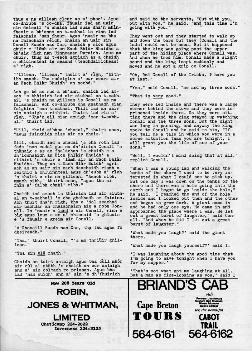 thug e na gillean clear as a' phoc'. Agus co-dhiubh 's co-dha, fhuair iad an uair sin deiseil 's chaidh iad suas dha'n mhin- fheoir a bh'anns an t-sabhal is rinn iad falachain 'san fheur. Agus 'nuair na bha na falachain reidh, chaidh an uair sin Conall Ruadh nan Car, chaidh e sios agus Qhuir e 'lamh air an Each Bhlar Bhuidhe a bh'aig Righ nan Uinneagan Daraich. Agus ma chuir, thug an t-each sgriach as a chaidh a chluinnteal le seachd (teachdairichean) a' righ. "'Illean, 'Illean," thuirt a' righ', "bith- ibh amach. Tha rudeiginn a' cur cearr air an Each Bhlar Bhuidh' an nochd." Ach ge be an rud a bh'ann, chaidh iad am? ach 's thoisich iad air siubhal an t-sabh? ail 's chaidh na gillean is Conall as na falachain. Ach co-dhiubh cha ghabhadh sian faighinn 'san t-sabhal. Thill iad an uair sin astaigh a rithist. Thuirt iad ris a' righ, "Cha'n eil sian amuigh 'san t-sabh? al," thuirt iad. "Uill, theid sibhse 'chadal," thuirt esan, "agus fuirghidh mise air mo chois." Uill, chaidh iad a chadal ''s cha robh iad fada 'nam cadal gus na dh'eirich Conall 's thanaig e as an fhalachan is chaidh e a dh'ionnsaidh an Eich Bhlair Bhuidh' a rithist 's chuir e 'lamh air an Each Bhlar Bhuidhe. Thug an t-Each Blar Buidh' sgri? ach as an uair sin nach deachaidh riamh a leithid a chluinnteal agus dh'eubhi a* righ 's thuirt e ris na gillean, "Amach sibh, amach sibh," thuirt esan, "agus tha mi fhin a' falbh cbmhl' ribh." Chaidh iad amach is thoisich iad air siubh? al an t-sabhail 's cha ghabhadh am faicinn. Ach thuit dha'n righ, bha e 'dol seachad air uachdar an fhalachainn aig a robh Con? all, Is 'nuair a land e air Conall, rinn e big agus leum e as a' mhionaid 's ghluais e 's fhuair e greim air Conall. "A Chonaill Ruadh nan Car, tha thu agam fo dheireadh." "Tha," thuirt Conall, "'s mo thriuir ghil? lean." "Tha sin gle mhath." Chaidh an toirt astaigh agus bha cuil mhor air cul a' stobh 's chaidh an cur astaigh ann a* sin coltach ro priosan. Agus bha iad 'nan suidh' ann a' sin 's dh'fhuirich and said to the servants, "Out with you, out with you," he said, "and this time I'm going with you." They went out and they started to walk up and down the barn but they (Conall and the lads) could not be seen. But it happened that the king was going past the upper part of the hiding place where Conall was. And when he trod him, Conall made a slight sound and the king leapt suddenly and moved and he got a grip on Conall. "Oh, Red Conall of the Tricks, 1 have you at last." "Yes," said Conall, "me and my three sons." "That is very good." They were led inside and there was a large corner behind the stove and they were im? prisoned inside there. So they were sit? ting there and the king stayed up watching Conall and the three sons. But the night was long in passing, and anyway the king spoke to Conall and he said to him, "If you tell me a tale in which you were in a worse situation than you are tonight, I will grant you the life of one of your sons." "Well, I wouldn't mind doing that at all," replied Conall. "When I was a young lad and walking the banks of the shore I used to be very in? terested in what I could see to pick ;up. But one day I was down on the banks of the shore and there was a hole going into the earth and I began to go inside the hole," he said. "I reached the end of the hole inside and I looked out then and the other end began to grow dark. A giant came in and he had only one eye. He caime in and approached the place where I was. He let out a great burst of laughter," said Con? all. "And when he did I let out a great burst of laughter." 'What made you laugh?' said the giant there. 'What made you laugh yourself?' said I. 'I was laughing about the good time that I'm going to have tonight when I have you for my supper.' • That's not what got me laughing at all. But a man as fine-looking as you,' said I Now 208 Years Old ROBIN, JONES 8e WHITMAN, LIMITED Cheticaap 224??2022 Inverness 224-3125 BRIAND'S CAB visit Cape Breton TaURS Graham Ball Mu*aum Miiwrt Musawm Gaalic Collage see the beautiful CABOT TRAIL 564-6161 564-6162