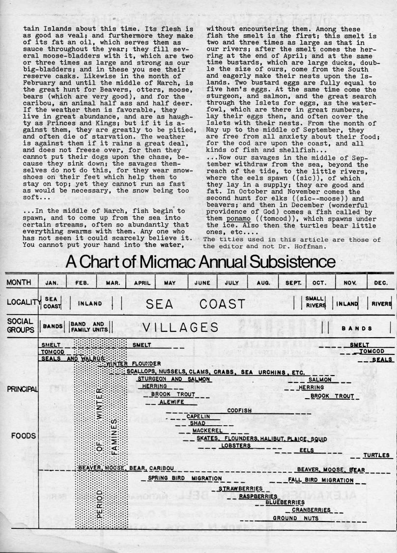 Published by Ronald Caplan on 1978/12/1 (284 reads)tain Islands about this time. Its flesh is as good as veal; and furthermore they make of its fat an oil, which serves them as sauce throughout the year; they fill sev? eral moose-bladders with it, which are two or three times as large and strong as our big-bladders; and in these you see their reserve casks. Likewise in the month of February and until the middle of March, is the great hunt for Beavers, otters, moose, bears (which are very good), and for the caribou, an aunimal half ass and half deer. If the weather then is favorable, they live in great abundance, and are as haugh? ty as Princes and Kings; but if it is a- gainst them, they are greatly to be pitied, and often die of starvation. The weather is against them if it rains a great deal, and does not freeze over, for then they cannot put their dogs upon the chase, be? cause they sink down; the savages them? selves do not do this, for they wear snow- shoes on their feet which help them to stay on top; yet they cannot run as fast as would be necessary, the snow being too soft... ...In the middle of March, fish begin'to spawn, and to come up from the sea into certain streams, often so abundantly that everything swarms with them. Any one who has not seen it could scarcely believe it. You cannot put your hand into the water. without encountering them. Among these fish the smelt is the first; this smelt is two and three times as large as that in our rivers; after the smelt comes the her? ring at the end of April; and at the same time bustards, which are large ducks, doub? le the size of ours, come from the South and eagerly make their nests upon the Is? lands. Two bustard eggs are fully equal to five hen's eggs. At the same time come the sturgeon, and salmon, and the great search through the Islets for eggs, as the water? fowl, which are there in great numbers, lay their eggs then, and often cover the Islets with their nests. From the month of May up to the middle of September, they are free from all anxiety about their food; for the cod are upon the coast, and all kinds of fish and shellfishc.. ...Now our savages in the middle of Sep? tember withdraw from the sea, beyond the reach of the tide, to the little rivers, where the eels spawn ((sic)), of which they lay in a supply; they are good and fat. In October and November comes the second hunt for elks ((sic • moose)) and beavers; and then in December (wonderful providence of God) comes a fish called by them ponamo ((tomcod)), which spawns under the ice. Also then the turtles bear little ones, etc.... The titles used in this article are those of the editor and not Dr. Hoffman. A Chart of Micmac Annual Subsistence MONTH MAR. APRIL SEPT. OCT LOCALl-n] SEA I COAST' SEA COAST SMALL I I I RIVEr4 I INLANDJ SOCIAL GROUPS RANn-