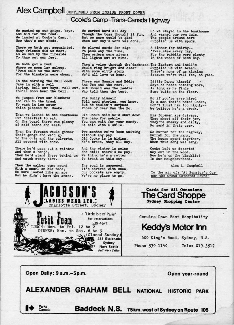 Published by Ronald Caplan on 1978/12/1 (281 reads)Al6X OEirnpDGll CONTINUED FROM INSIDE FRONT COVER ODOke's Camp-Trans-Canada Highway We packed up our grips, boys, And hit for the road. We landed at Cooke's Camp, Now that's our abode. There we both got acquainted, Many friends did we meet, As we sat by the fireside To thaw out our feet. We both got a bunk Where we soon lay asleep. 'Twas cold as the devil For the blankets were cheap. In the morning the bull cook Came in with a yell Saying, Roll out boys, roll out. You'll soon hear the bell. We jumped from our blankets And ran to the brook To wash in ice water Which pleased Mr. Cooke. Then we dashed to the cookhouse Our breakfast to eat. On the board there was plenty of cold beans and meat. Then the foremen would gather Their gangs and we'd go To the cuts smd the culverts, All covered with snow. There he'd pass out a rainbow And then a banjo. Then he'd stand there behind us And watch every blow. Then the walker come rovind With a snarl on his face. He sure looked like an ape But he didn't have the grace. We worked hard all day Though the boss thought it fun. But we sure would be glad When our day's work was done. We played cards for cigs To pass way the time, Then orders were given? All lights out at nine. So we stayed in the biinkhouse And washed our own duds. The people around here Supplied us with spuds. A dinner for thirty • • Twas stew every day. For the rabbits were plenty In the woods of East Bay. Then a voice throu' the'darkness The Eastern and Snell's Would ring bright and clear Supplied us with bread. With some witty story There's none of us kicking We'd all love to hear. Because we're well fed, oh yeah. There was Gussie and Eddie And Tom and the rest, But Donald was the laddie Who told them the best. The Bully himself Told good stories, you know. But he couldn't surpass Those of dear Dan the Bo. Old Cooke said he'd shut down The camp for awhile. You can wait for your money, He said with a smile. Two months we've been waiting Without any pay. Old Cooke is in hiding, He's broke, they all say. And the winter is going And still there's no pay. We think, he's a rotter To treat us this way. The road is unopened, It's covered with snow, Our pockets are empty. We've no place to go. Little Danny himself Says he needs nothing more. As long as he finds Some butts on the floor. So if you're ever hired By a man that's named Cooke, Don't trust him too highly • We believe he's a crook. His foremen are drivers. They shoot off their jaw. They're sneaky and dirty, No sand in their craw. So hurrah for the highway, Hurrah for the gang. The hours spent together. When this song was sang. Cooke left us deserted Way out in the wood. Now he's on the blacklist In our neighbourhood. • Alex L. Campbell To the air of; "At Senator's Cor? ner the Crowd Gathered Round" U AGOISON'S LABIES WEAl ITi.: Charlotte Street, Sydney i Cards for All Occiisions The Card Shoppe Sydney Shopping Centre "Little bjt of Paris" for reservations 539-4671 • LUNCH: Mon. to Fri. 12 to 2 DINNER: Mon. to Sat. 6 to 9 1'Closed Sunday) 233 Esplanade Sydney Nova Scotia Full Wine CeUar Genuine Down East Hospitality Keddy' Motor lm 600 King's Road, Sydney, N.S. Phone 539-11'0 • Telex 019-351? Open Daily: 9 a.m.-5p.m. Open year-round ALEXANDER GRAHAM BELL national historic park I* Parks Canada Baddeck N.S. rSkm.west of Sydney on Route 105