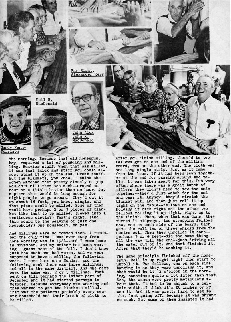 Published by Ronald Caplan on 1978/12/1 (367 reads)the morning. Because that old homespun, boy, required a lot of pouhding and mil? ling. Heavier stuff. When that was milled, it was that thick and stiff you could al? most stand it up on the end. Great stuff. But the blankets, you know, I think the women watched that pretty closely so yoj* wouldn't mill them too much • around an hour or a little better than an hour. Say a piece that would be long enough for eight people to go around. They'd cut it up about 18 feet, you know, single. And that piece would be milled. Some of them would have perhaps 2 or 3 pieces of blan? ket like that to be milled. (Sewed into a continuous circle?) That's right. (And this would be the weaving of just one household?) One household, ph yes. And millings were so common then. I remem? ber the only time I was ever away from home working was in 1924 • and I came home in November. And my mother had been weav? ing I guess most of the fall. I don't know just how much she had woven. And we were supposed to have a milling the following week. I came home on a Monday, and the following week there was three millings, and all in the same district. And the next week the same way, 2 or 3 millings. That went on till perhaps the latter part of December and it had started perhaps in October. Because everybody was weaving and they wanted to get the blankets milled. That was the pattern: probably every sec? ond household had their batch of cloth to be milled. After you finish milling, there'd be two fellows get on one end of the milling board, two on the other end. The cloth was one long single strip, just as it came from the loom. If it had been sewn togeth? er at the end for passing aro ind the ta? ble, it was taken apart for this. But very often where there was a great bunch of millers they didn't need to sew the ends together • they'd just watch for the end and pass it. Anyhow, they'd stretch the blanket out, and then just roll it up tight on the table • fellows on one end holding it back tight and the other two fellows rolling it up tight, right up to the finish. Then, when that was done, they turned it sideways, two strapping fellows now, one on each side of the board. Each gave the roll two or three whacks from the centre out. Then they unrolled it some • perhaps 5 or 4 feet • did the same thing- all the way till the end--just driving all the water out of it. And that finished it. After that they'd be washing it. The same principle finished off the home? spun. Roll it up right tight then start to unroll it. Two fellows, one on each side, banging it as they were unrolling it, and that would be it • 2 o'clock in the morn? ing, sometimes quite a lot later than that. See, the women were pretty meticulous a- iDout that. It had to be shrunk to a cer? tain width • I think it's 28 inches or 27 was it. And it was pretty hard to get to that last going off, because it was shrunk so much. But some of them insisted it had
