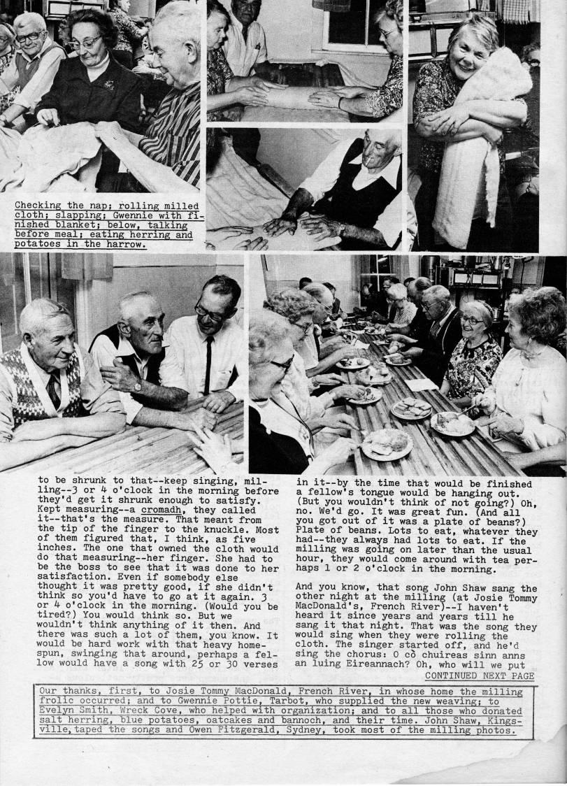 Published by Ronald Caplan on 1978/12/1 (413 reads)to be shrunk to that • keep singing, rail- ling • 3 or 4 o'clock in the morning before they'd get it shrunk enough to satisfy. Kept measuring • a cromadh, they called it • that's the measure. That meant from the tip of the finger to the knuckle. Most of them figured that, I think, as five inches. The one that owned the cloth would do that measuring • her finger. She had to be the boss to see that it was done to her satisfaction. Even if somebody else thought it was pretty good, if she didn't think so you'd have to go at it again. 3 or 4 o'clock in the morning. (Would you be tired?) You would think so. But we wouldn't think anything of it then. And there was such a lot of them, you know. It would be hard work with that heavy home? spun, swinging that around, perhaps a fel? low would have a song with Z5 or 30 verses in it • by the time that would be finished a fellow's tongue would be hanging out. (But you wouldn't think of not going?) Oh, no. We'd go. It was great fun. (And all you got out of it was a plate of beans?) Plate of beans. Lots to eat, whatever they had • they always had lots to eat. If the milling was going on later than the usual hour, they would come around with tea per? haps 1 or 2 o'clock in the morning. And you know, that song John Shaw sang the other night at the milling (at Josie Tommy MacDonald's, French River) • I haven't heard it since years and years till he sang it that night. That was the song they would sing when they were rolling the cloth. The singer started off, and he'd sing the chorus: 0 co chuireas sinn anns ah luing Eireannach? Oh, who will we put CONTINUED NEXT PAGE Our thanks, first, to Josie Tommy MacDonald, French River' in whose home the milling frolic occurred; and to Gwennie Pottie, Tarbot, who supplied the new weaving; to Evelyn Smith, Wreck Cove, who helped with organization; and to all those who donated salt herring, blue potatoes, oatcakes and bannoch, and their time. John Shaw, Kings? ville, taped the songs and Owen Fitzgerald, Sydney, took most of the milling photos.