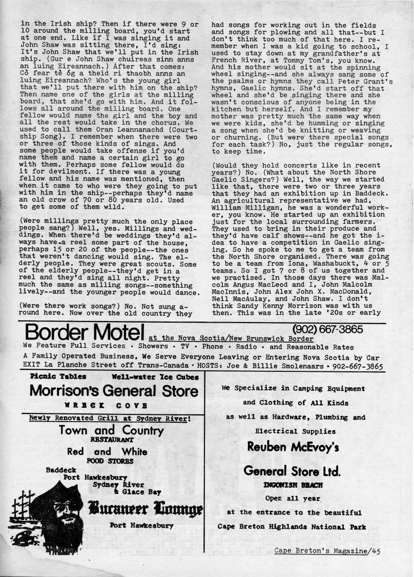 Published by Ronald Caplan on 1978/12/1 (345 reads)in the Irish ship? .Then if there were 9 or 10 around the milling board, you'd start at one end. Like if I was singing it and John Shaw was sitting there, I'd sing: It's John Shaw that we'll put in the Irish ship. (Gur e John Shaw chuireas sinn anns an luing Eireannach.) After that comes: Co fear te og a theid ri thaobh anns an luing Eireannach? Who's the young girl that we'll put there with him on the ship? Then name one of the girls at the milling board, that she'd go with him. And it fol? lows all around the milling board. One fellow would name the girl and the boy and all the rest would take in the chorus. We used to call them Oran Leannanachd (Court? ship Song). I remember when there were two or three of those kinds of sings. And some people would take offense if you'd name them and name a certain girl to go with them. Perhaps some fellow would do it for devilment. If there was a yoimg fellow and his name was mentioned, then when it came to who were they going to put with him in the ship • perhaps they'd name an old crow of 70 or 80 years old. Used to get some of them wild. (Were millings pretty much the only place people sang?) Well, yes. Millings and wed? dings. When there'd be weddings they'd al? ways have-a reel some part of the house, perhaps 15 or 20 of the people • the ones that weren't dancing would sing. The el? derly people. They were great scouts. Some of the elderly people • they'd get in a reel and they'd sing all night. Pretty much the same as milling songs • something lively • and the younger people would dance. (Were there work songs?) No. Not sung a- round here. Now over the old country they had songs for working out in the fields and songs for plowing and all that • but I don't think too much of that here. I re? member when I was a kid going to school, I used to stay down at my grandfather's at French River, at Tommy Tom's, you know. And his mother would sit at the spinning wheel singing--and she always sang some of the psalms or hymns they call Peter Grant's hymns, Gaelic hymns. She'd start off that wheel and she'd be singing there and she wasn't conscious of anyone being in the kitchen but herself. And I remember my mother was pretty much the same way when we were kids, she'd be humming or singing a song when she'd be knitting or weaving or churning. (But were there special songs for each task?) No, just the regular songs, to keep time. (Would they hold concerts like in recent years?) No. (What about the North Shore Gaelic Singers?) Well, the way we started like that, there were two or three years that they had an exhibition up in Baddeck. An agricultural representative we had, William Milligan, he was a wonderful work? er, you know. He started up an exhibition just for the local surrounding farmers. They used to bring in their produce and they'd have calf shows • and he got the i- dea to have a competition in Gaelic sing? ing. So he spoke to me to get a team from the North Shore organised. There was going to be a team from lona, Washabuckt, 4 or 5 teams. So I got 7 or 8 of us together and we practised. In those days there was Mal? colm Angus MacLeod and I, John Malcolm Maclnnis, John Alex John X. MacDonald, Neil MacAulay, and John Shaw. I don't think Sandy Kenny Morrison was with us then. This was in the late 'aOs or early RnrHor K'ntol (902)667 3865 I'V'I vJv7l IVIvyl !7l at the Nova gpotia/New Brunswick Border We Feature Full Services Showers • TV • Phone • Radio • and Reasonable Rates A Family Operated Business, We Serve Everyone Leaving or Entering Nova Scotia by Car EXIT La Planche Street off Trans-Canada • HOSTS: Joe & Billie Smolenaars • > 902-667-3865 Fienie Tables Well*water tee Cubes Morrison's General Store WRSeK COVB Newly Renovated Grill at Sydney River? Town and Country RBSTAURAIcr Red ond White FOOD STORBS Baddeck Port Hawkesbury Sydney River % Glace Bay fort Hawkesbury We Specialize in Camping Bquiinnent and Clothing of All Kinds as well as Hardware, Plumbing and Electrical Supplies Reuben McEvoy's General Store Ltd. INOONXSR BBACR Open all year. at the entrance to the beautifia Cape Breton Highlands National Park Cape Breton's Magazine/45