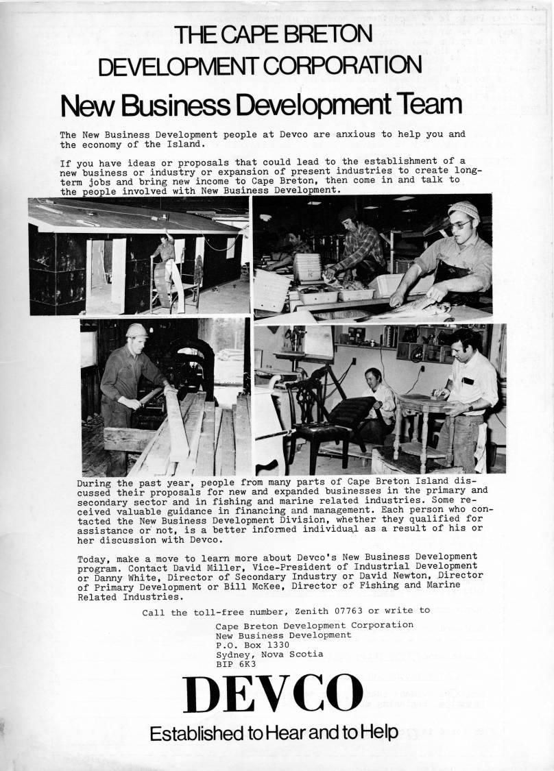 Published by Ronald Caplan on 1978/12/1 (166 reads)THE CAPE BRETON DEVELOPMENT CORPORATION New Business Development Team The New Business Development people at Devco are anxious to help you and the economy of the Island. If you have ideas or proposals that could lead to the establishment of a new business or industry or expansion of present industries to create long- term jobs and bring new income to Cape Breton, then come in and talk to the people involved with New Business Development. During the past year, people from many parts of Cape Breton Island dis? cussed their proposals for new and expanded businesses in the primary and secondary sector and in fishing and marine related industries. Some re? ceived valuable guidance in financing and management. Each person who con? tacted the New Business Development Division, whether they qualified for assistance or not, is a better informed individual as a result of his or her discussion with Devco. Today, make a move to learn more about Devco's New Business Development program. Contact David Miller, Vice-President of Industrial Development or Danny White, Director of Secondary Industry or David Newton, Director of Primary Development or Bill McKee, Director of Fishing and Marine Related Industries. Call the toll-free number, Zenith 07763 or write to Cape Breton Development Corporation New Business Development P.O. Box 1330 Sydney, Nova Scotia BIP 6K3 DEVCO Established to Hear and to Help